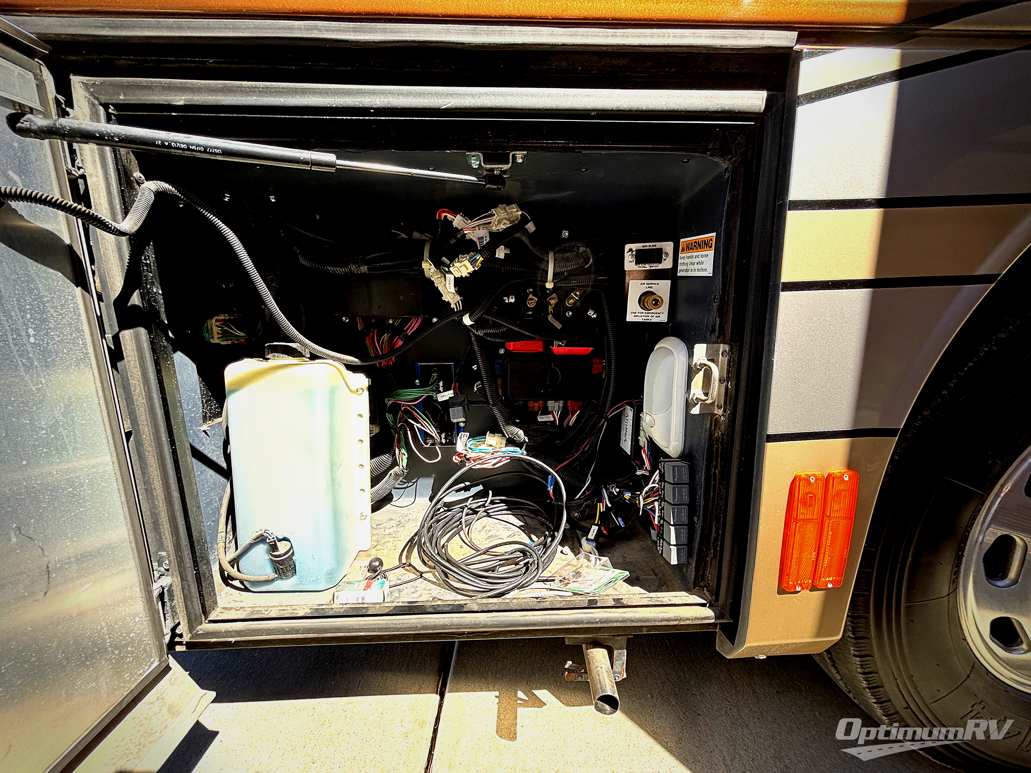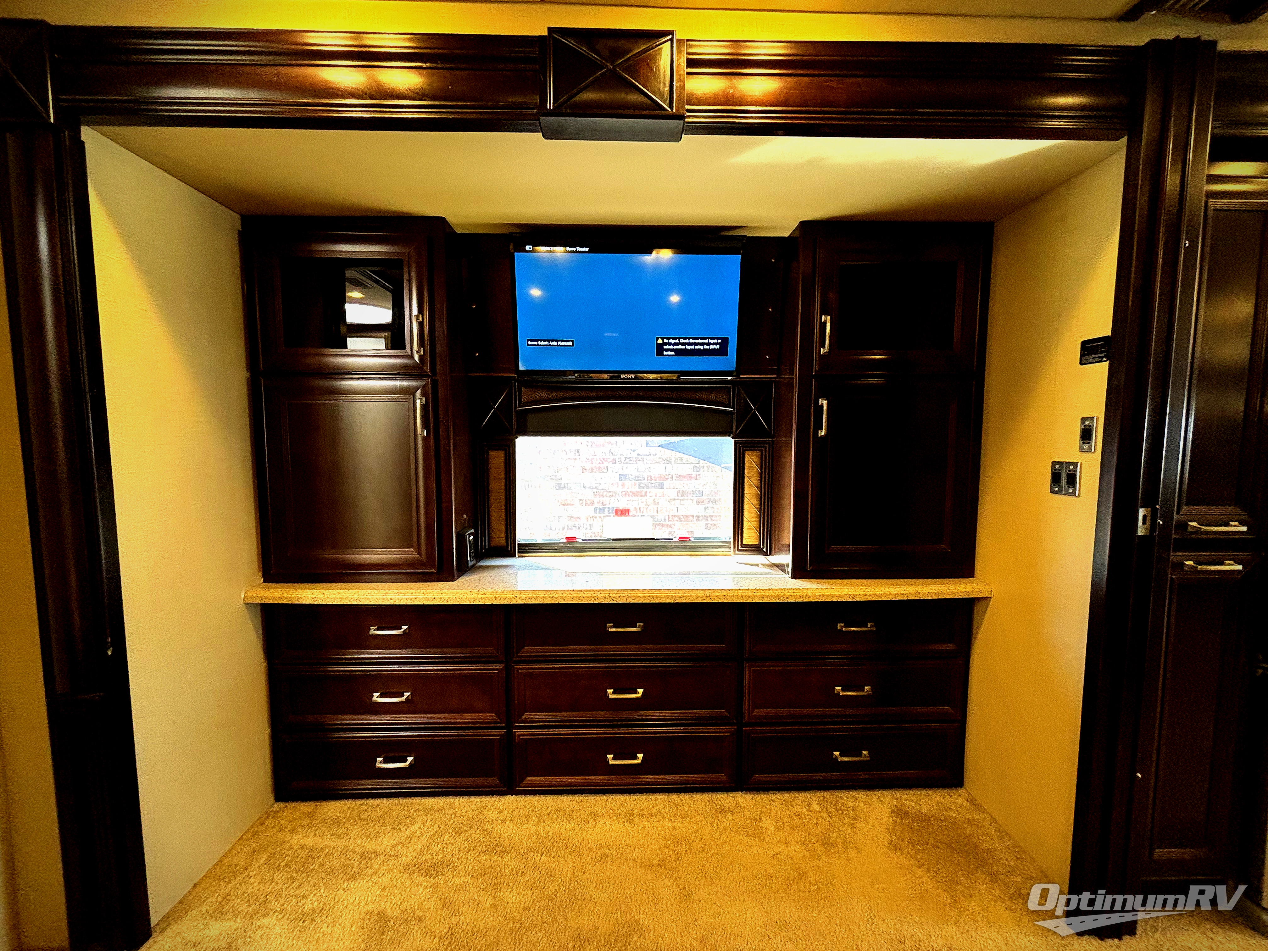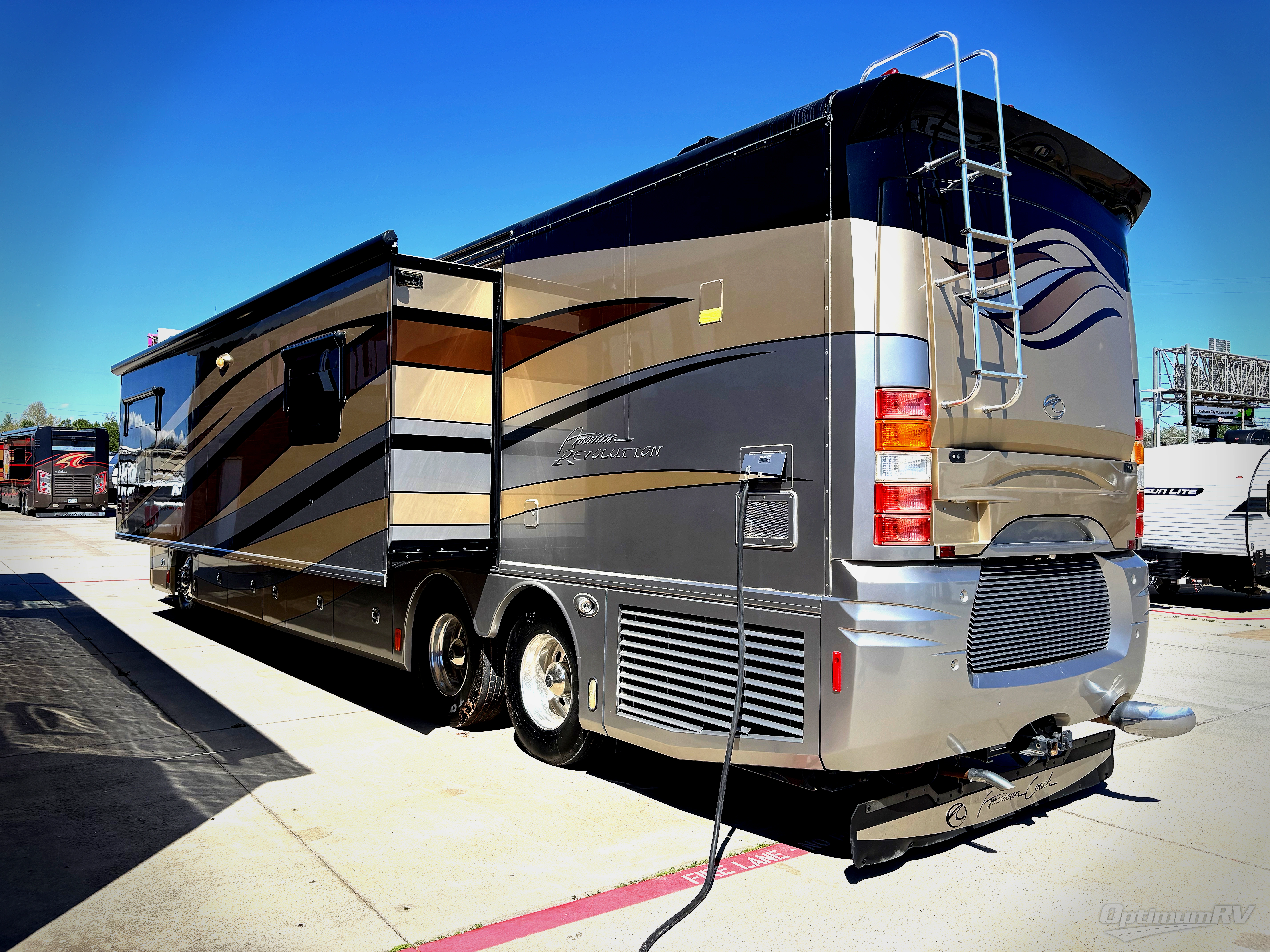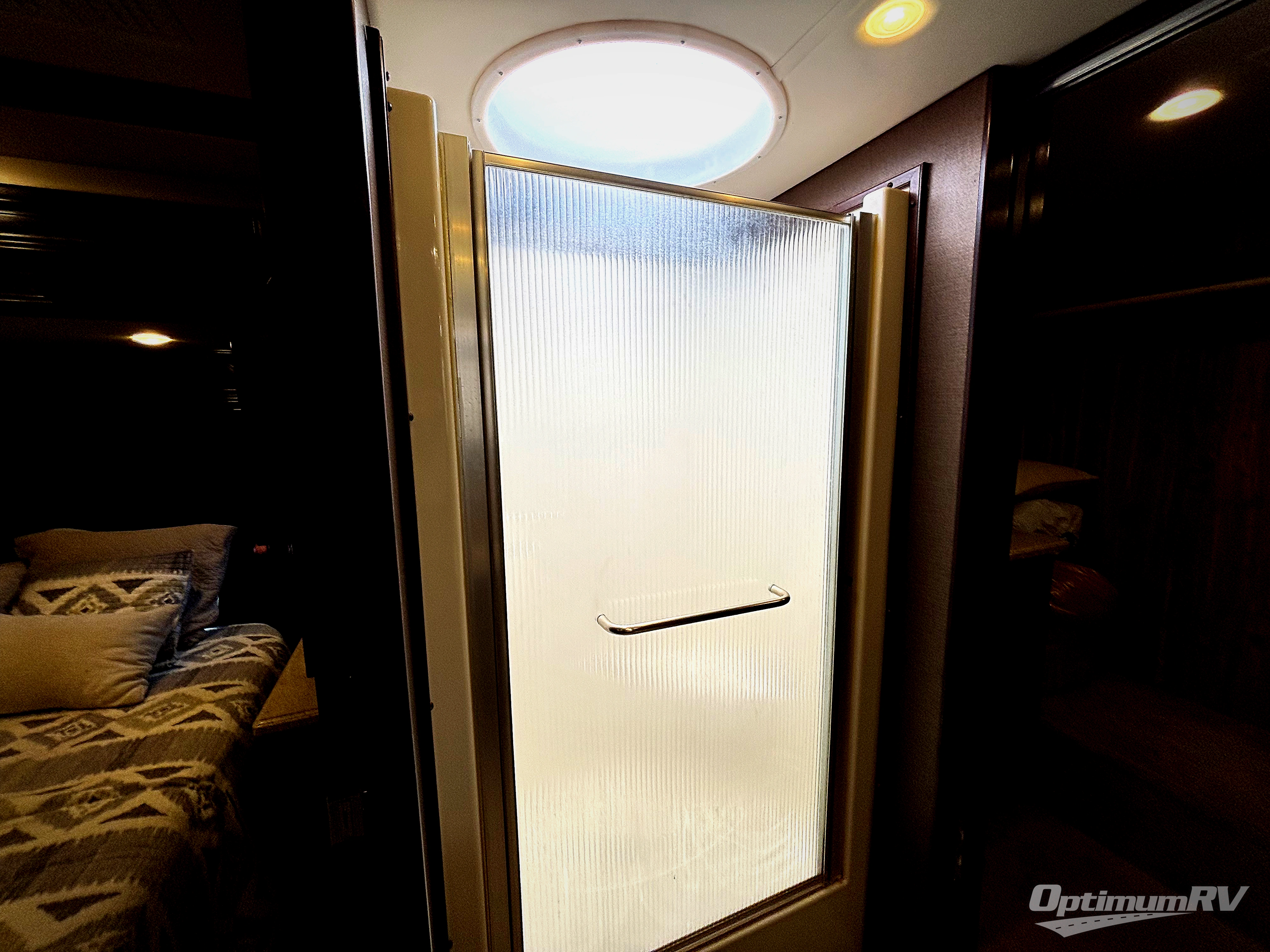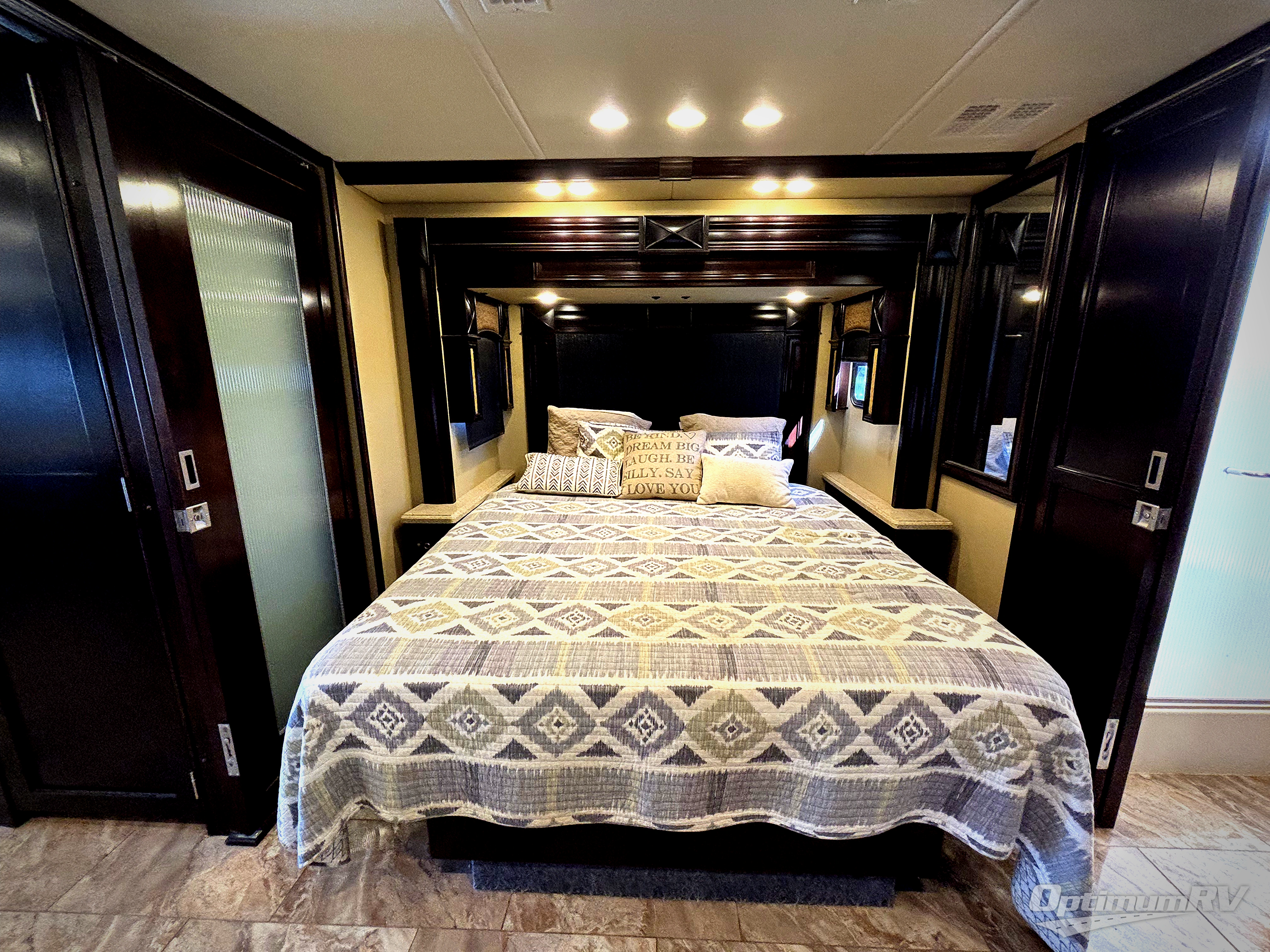 The American Revolution 42T motor home by American Coach features a bath and a half. Starting in the rear of the motor home, there is a walk-in closet with a stackable washer and dryer, utility cabinet, wardrobe and shelves. The bathroom has a shower, toilet, sink, and medicine cabinet. In the bedroom, there is a king bed and nightstands slide. As you proceed from the bedroom, to the right, is a half bath. The living and kitchen areas offer a 46" LED tv, a slide with a dining table & chairs and sofa. There is also a front 32" LED tv. The side behind the driver's seat is a full wall slide and has a sofa, double kitchen sink, microwave, three-burner range, refrigerator with ice maker, pantry and 32" LED tv in the bedroom. You can choose a few "extras" as options, washer dryer ready, washer dryer combo, dishwasher, king bed with air mattress, face-to-face dinette ensemble.
