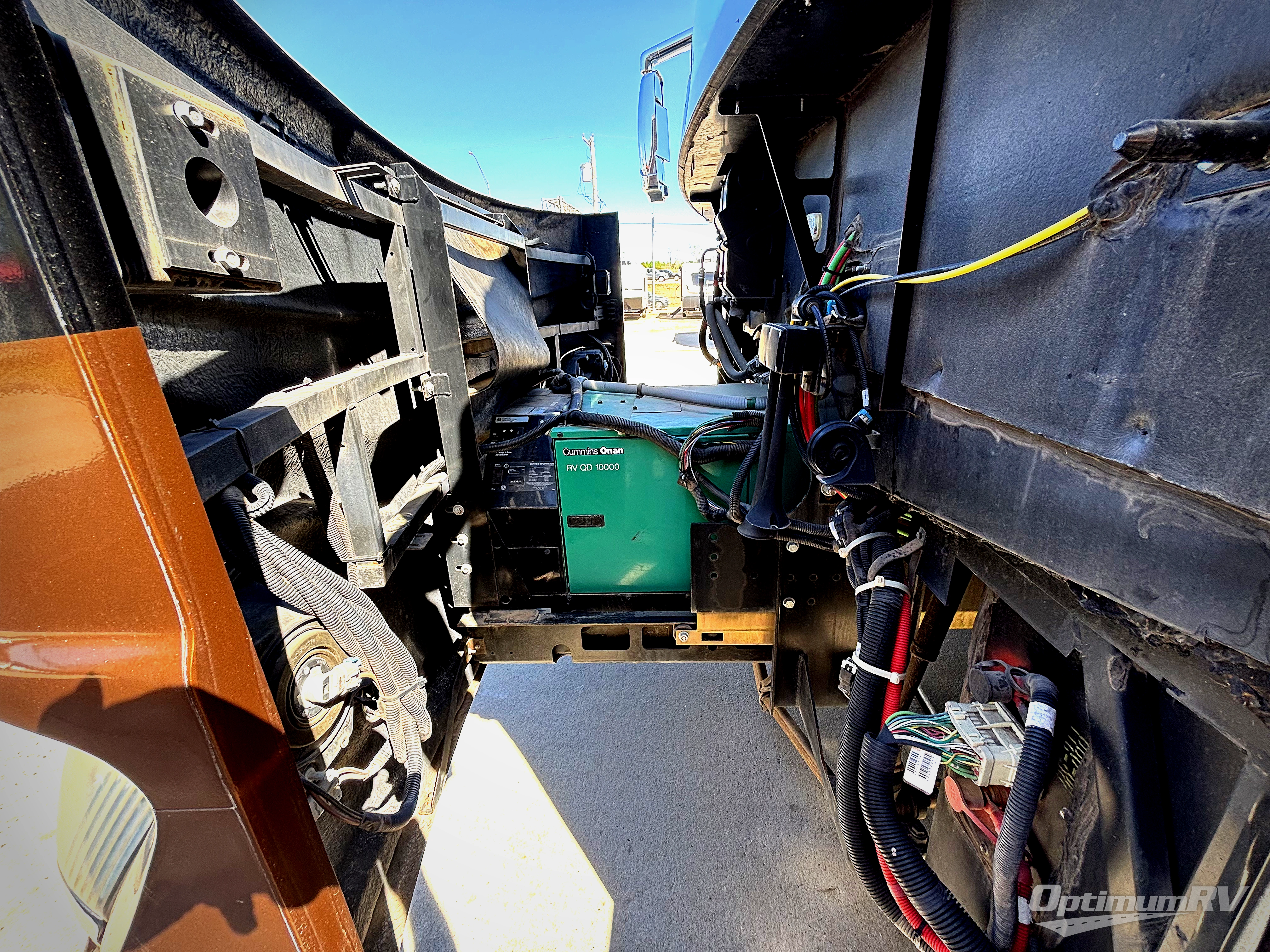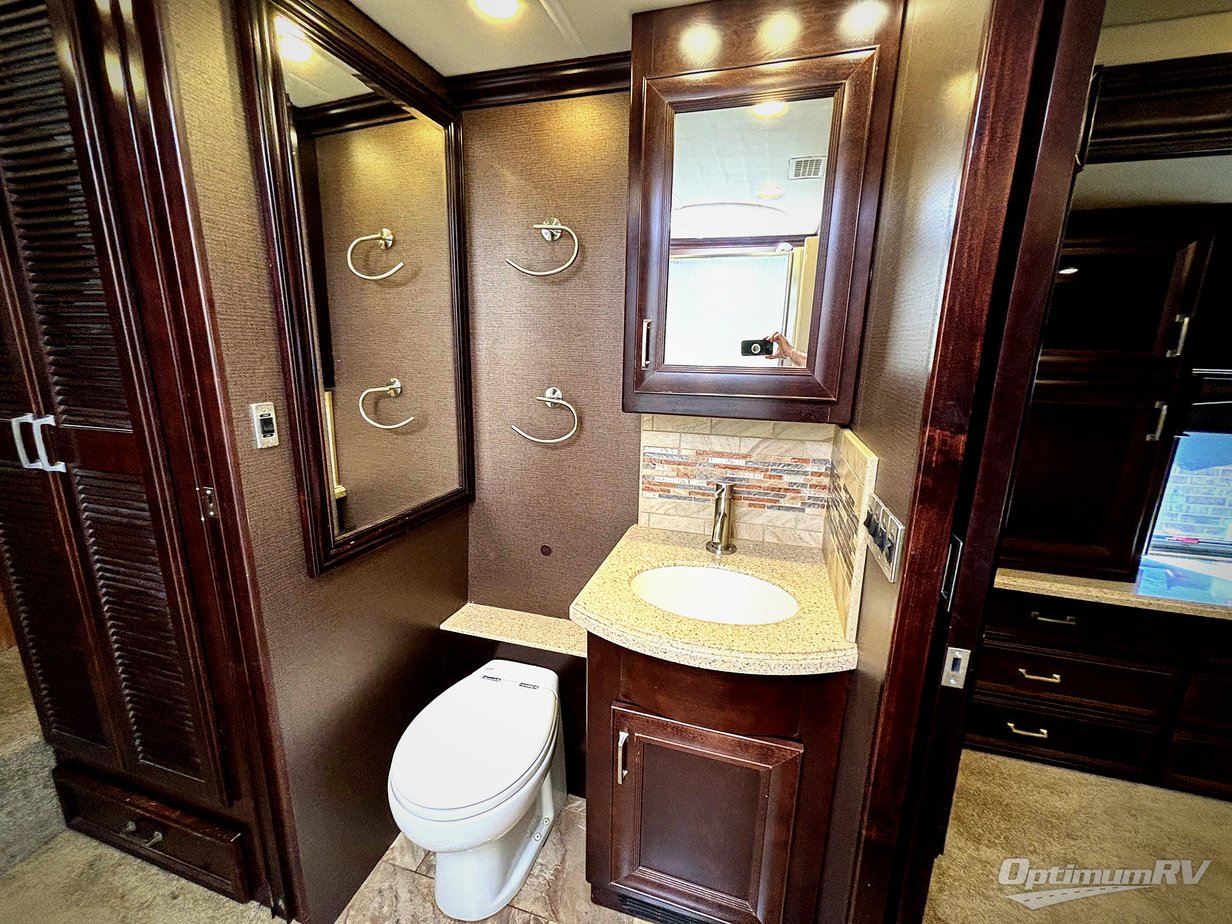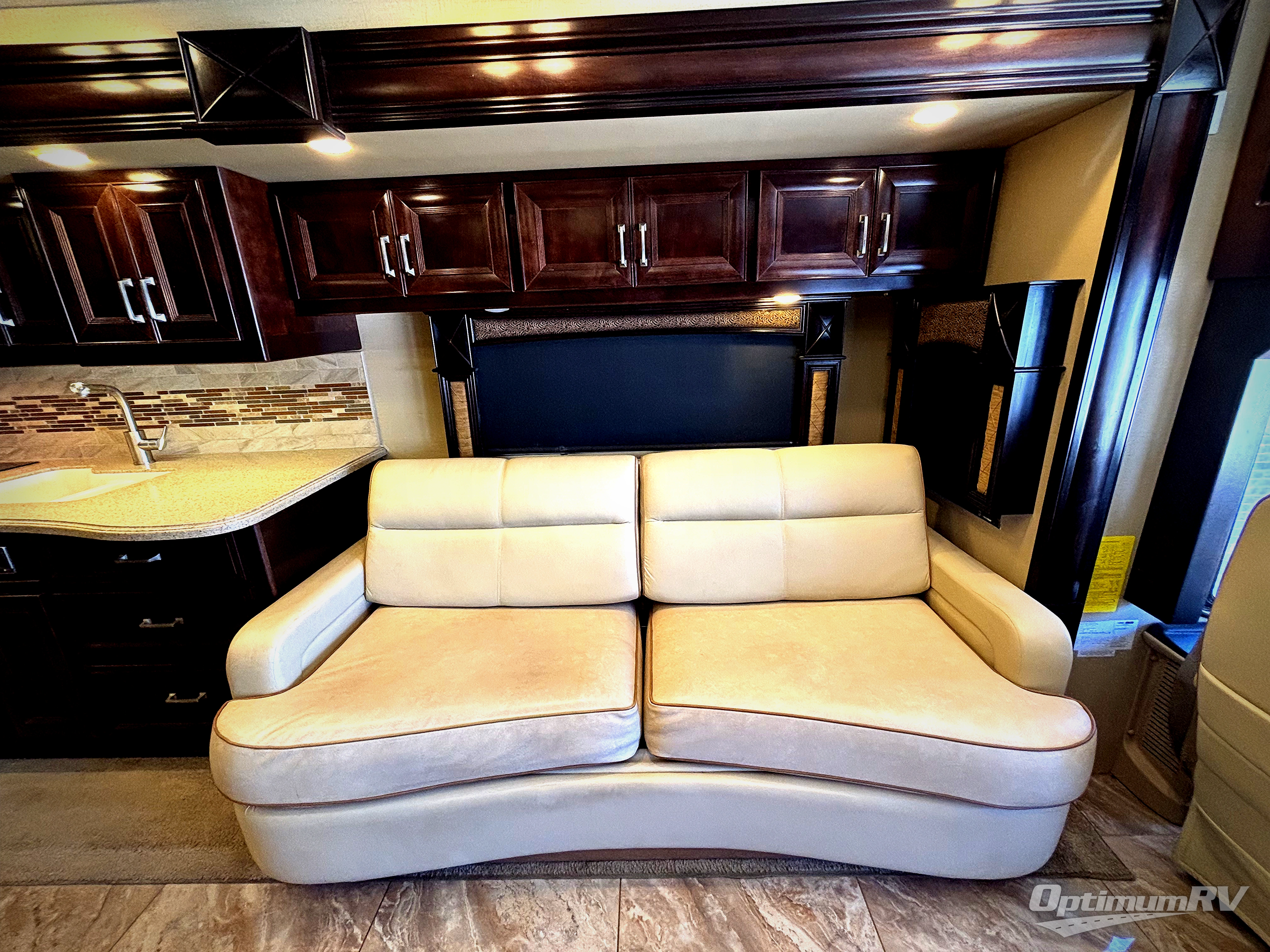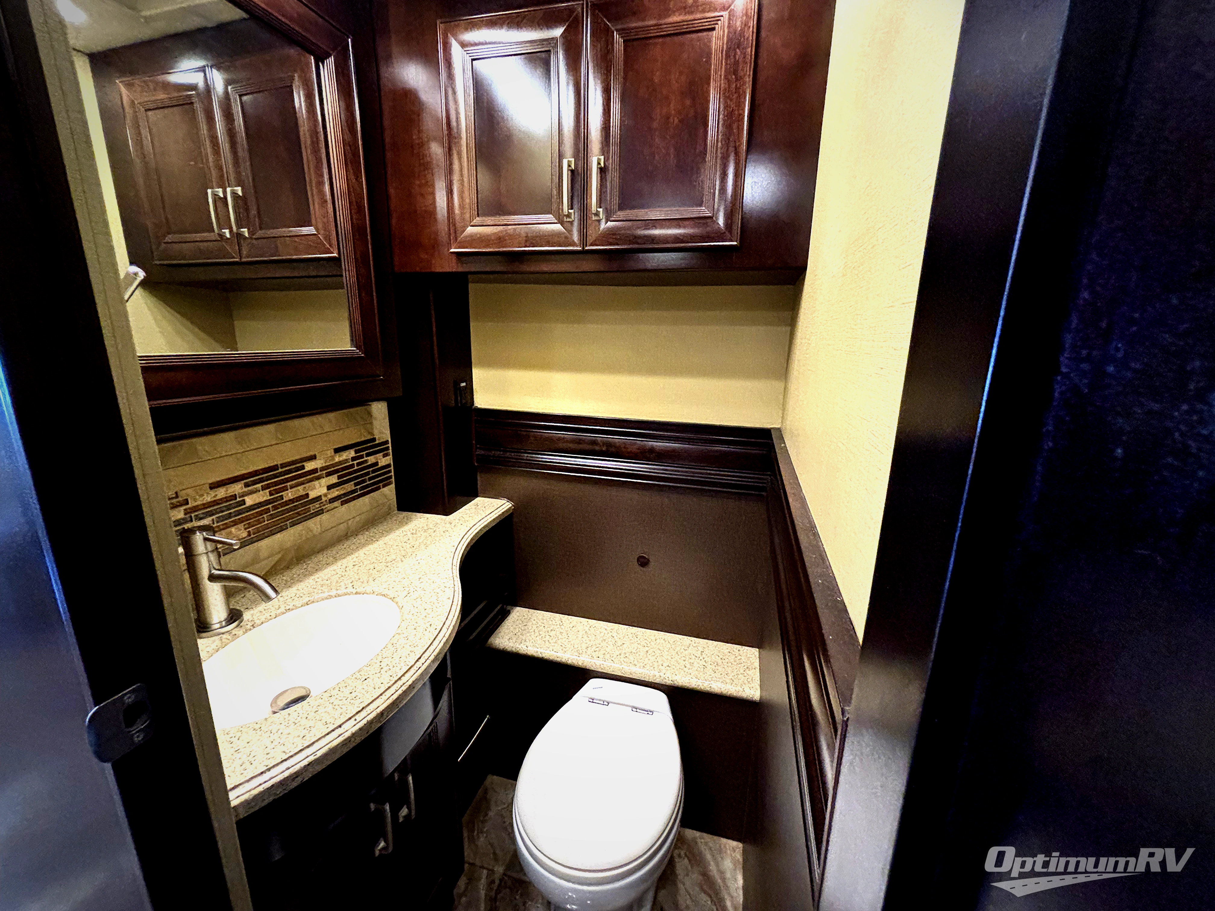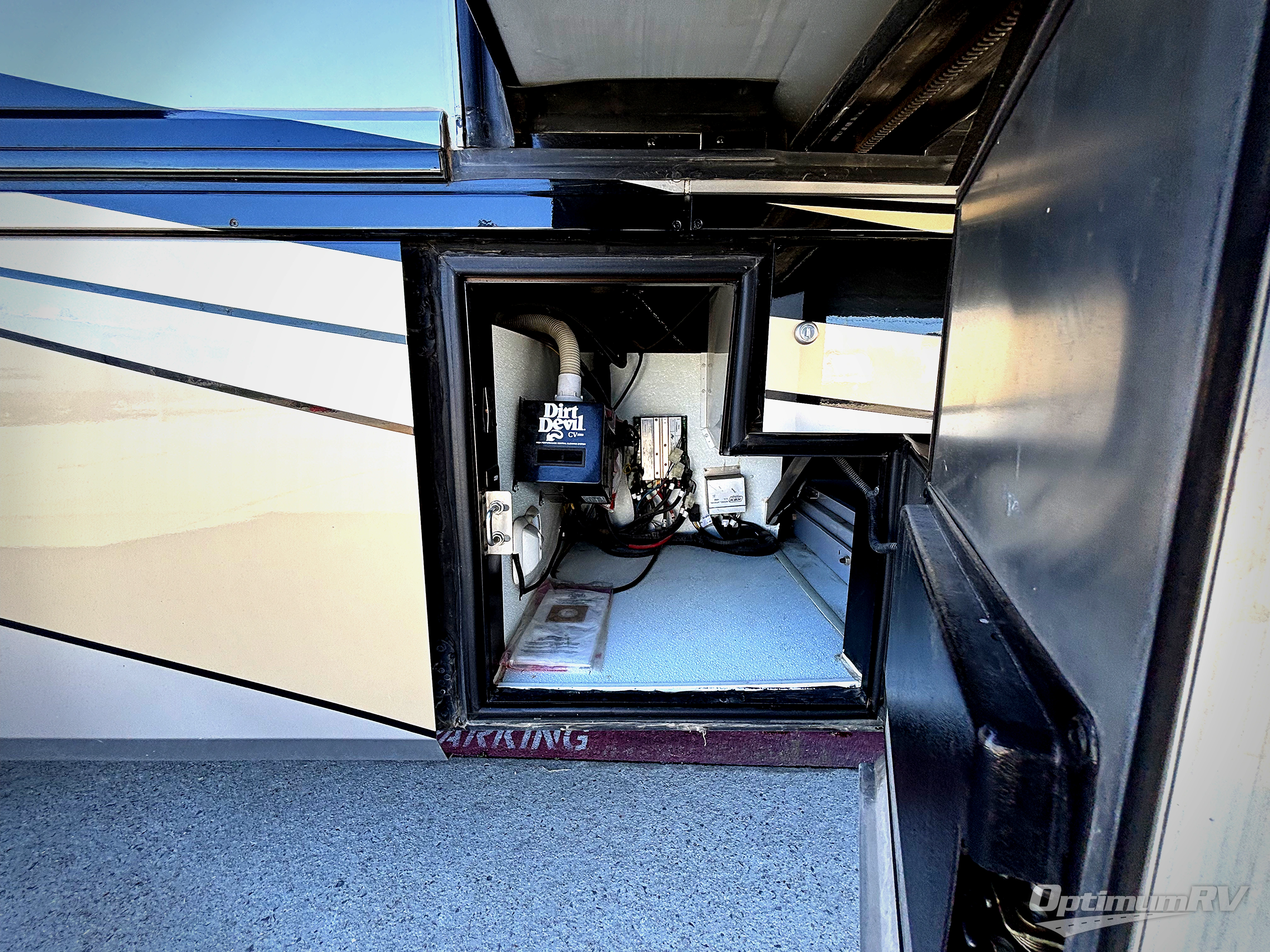 The American Revolution 42T motor home by American Coach features a bath and a half. Starting in the rear of the motor home, there is a walk-in closet with a stackable washer and dryer, utility cabinet, wardrobe and shelves. The bathroom has a shower, toilet, sink, and medicine cabinet. In the bedroom, there is a king bed and nightstands slide. As you proceed from the bedroom, to the right, is a half bath. The living and kitchen areas offer a 46" LED tv, a slide with a dining table & chairs and sofa. There is also a front 32" LED tv. The side behind the driver's seat is a full wall slide and has a sofa, double kitchen sink, microwave, three-burner range, refrigerator with ice maker, pantry and 32" LED tv in the bedroom. You can choose a few "extras" as options, washer dryer ready, washer dryer combo, dishwasher, king bed with air mattress, face-to-face dinette ensemble.