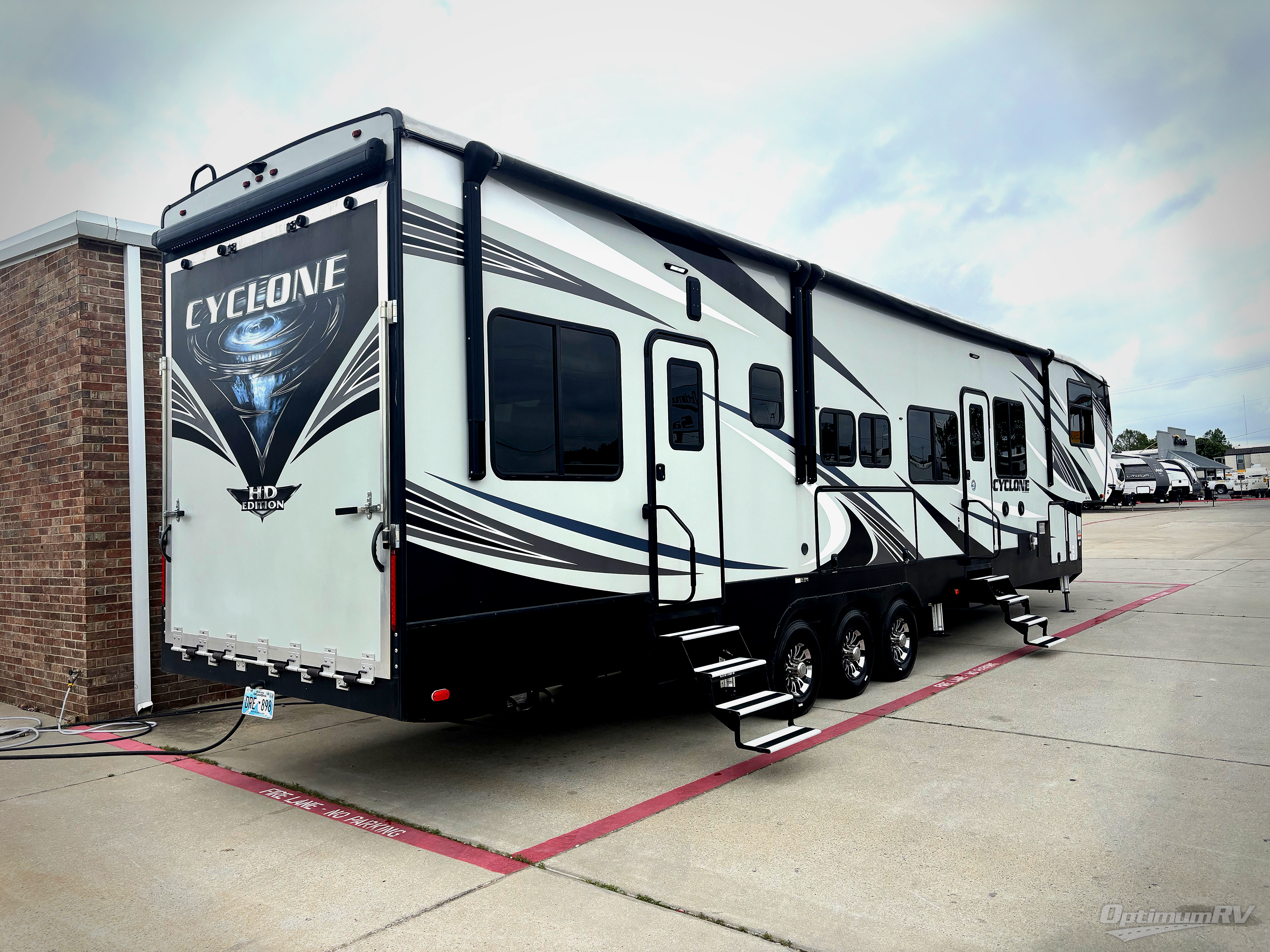 This Heartland Cyclone 4101KING features 13' of garage space for you to haul your favorite off-road toys! There is a loft with an electric queen bed that your kiddos will love, and a front private bedroom with a tilting king bed and an entrance into the full bath that you will love. Everyone can get squeaky clean thanks to the bath and a half. Your chef of the group will enjoy cooking meals inside the kitchen and enjoy cooking even more at the outside kitchen!