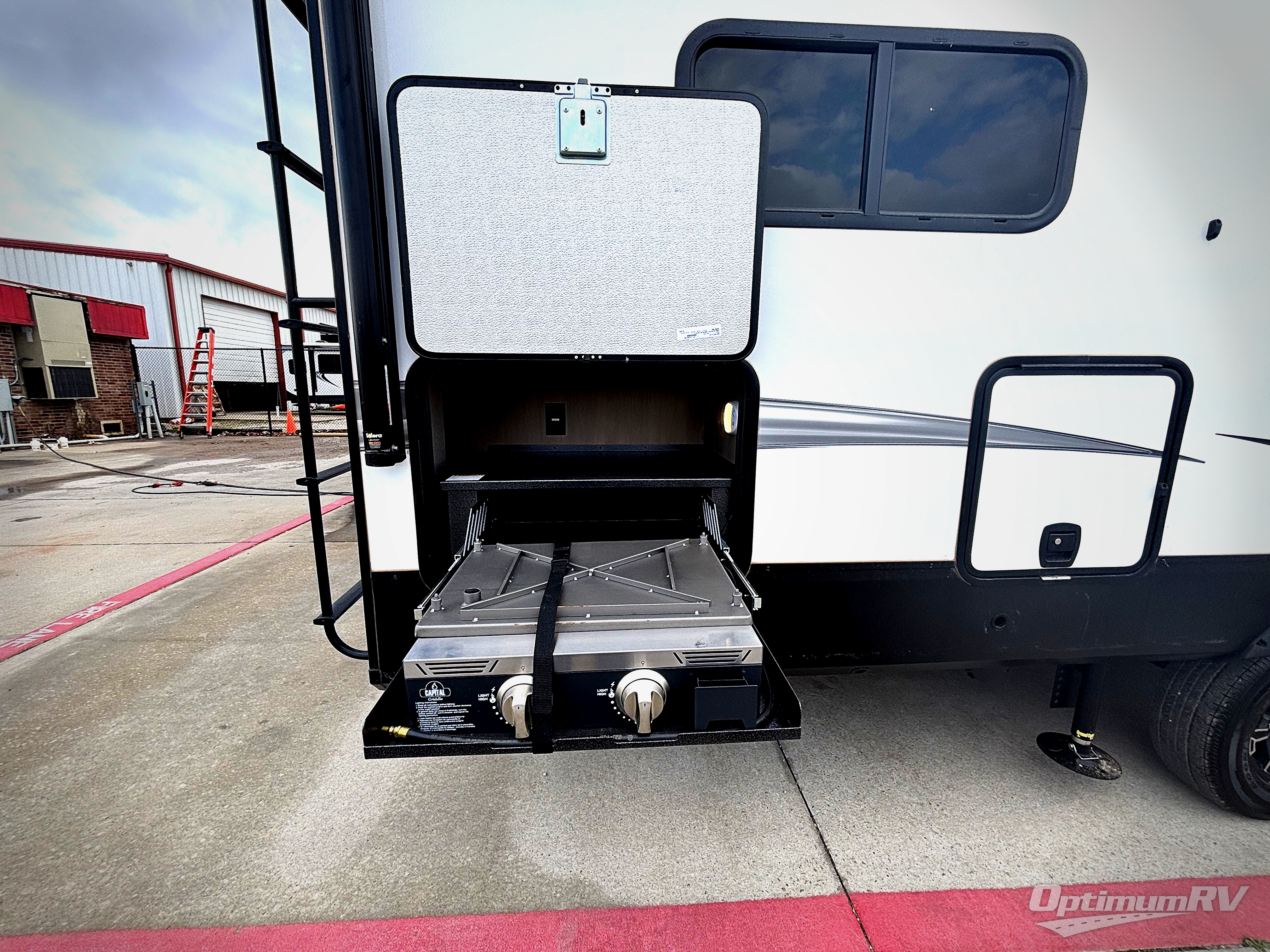 Your short bed truck will love this fifth wheel with swivel pin box and a 90 degree turning radius without a slider hitch. You will love this fifth wheel featuring a single slide for added interior living space and all the comforts and conveniences it provides you while you travel. The slide features a 78" theater seat plus there is a breakfast nook for more seating. Both can easily view the entertainment center with 40" TV. A rear kitchen indoors provides everything you need to create meals like home while on the road, and if you want to spend as much time outside as possible, then the outdoor griddle will certainly accommodate you for meals. Up front, a cozy private bedroom with queen bed, wardrobe, and overhead cabinets. Right next door, you will find a large walk-in shower with skylight for more natural lighting, as well as a toilet, and a vanity with sink and linen cabinet for your towels and toiletries. This unit offers ample storage both inside and out. You will love the full unobstructed pass-through compartment for all of your gear, plus so much more!