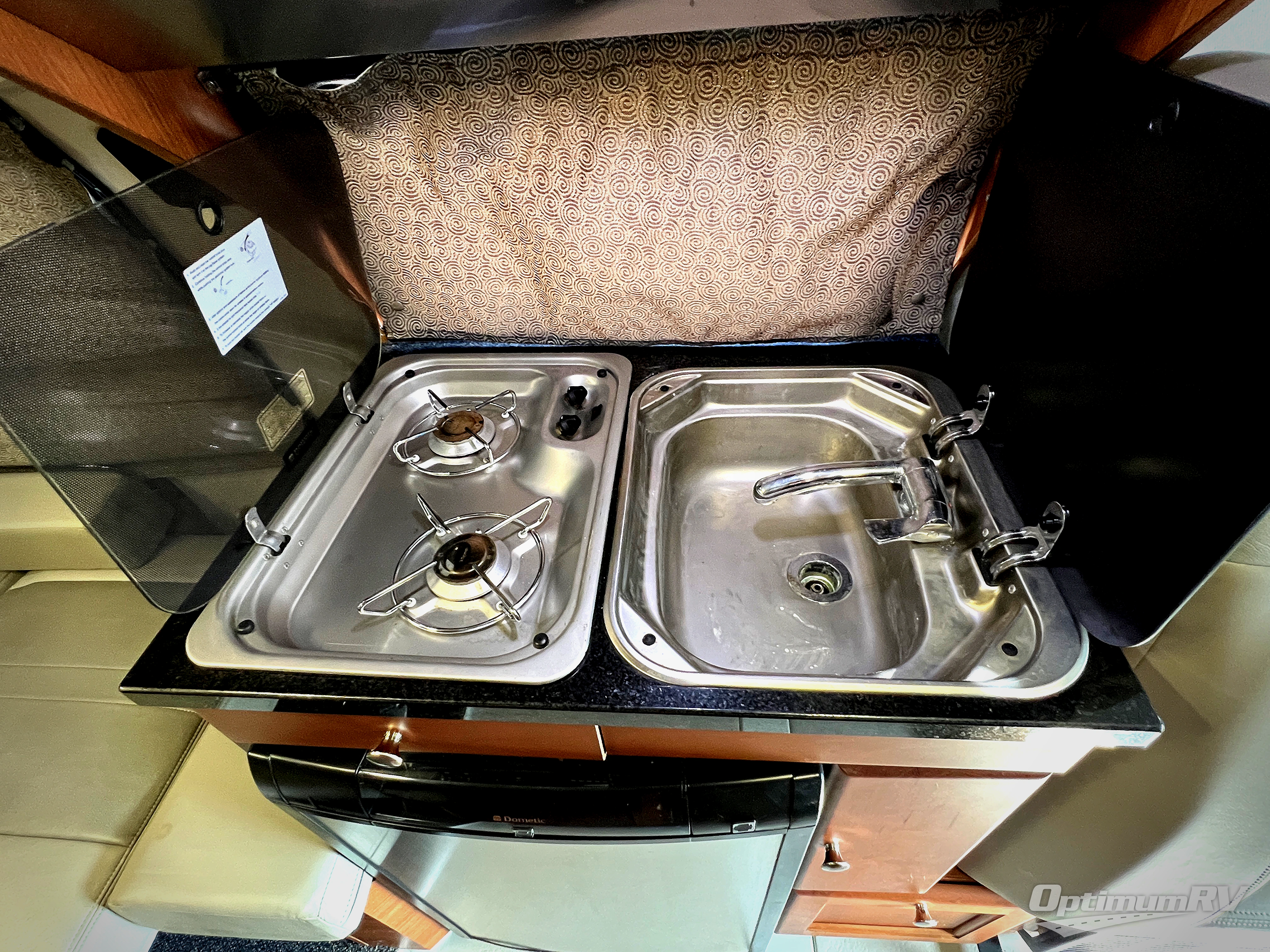 A rear sofa that converts to a double bed offers comfortable space for lounging or sleeping. A stove top, single galley sink, refrigerator, toilet, stand up shower, midcab lounge chairs and center removable table offer all the comforts you need away from home.