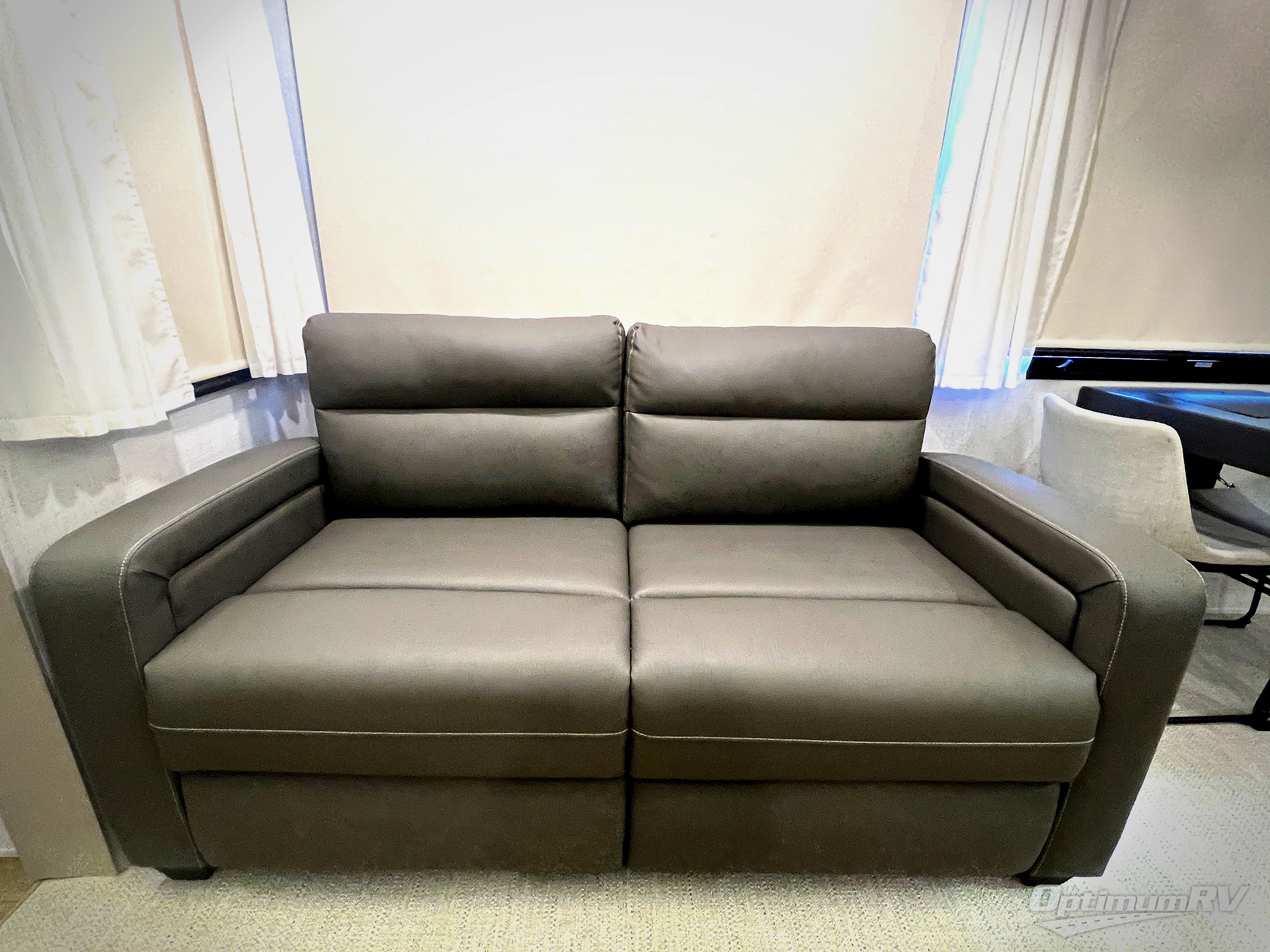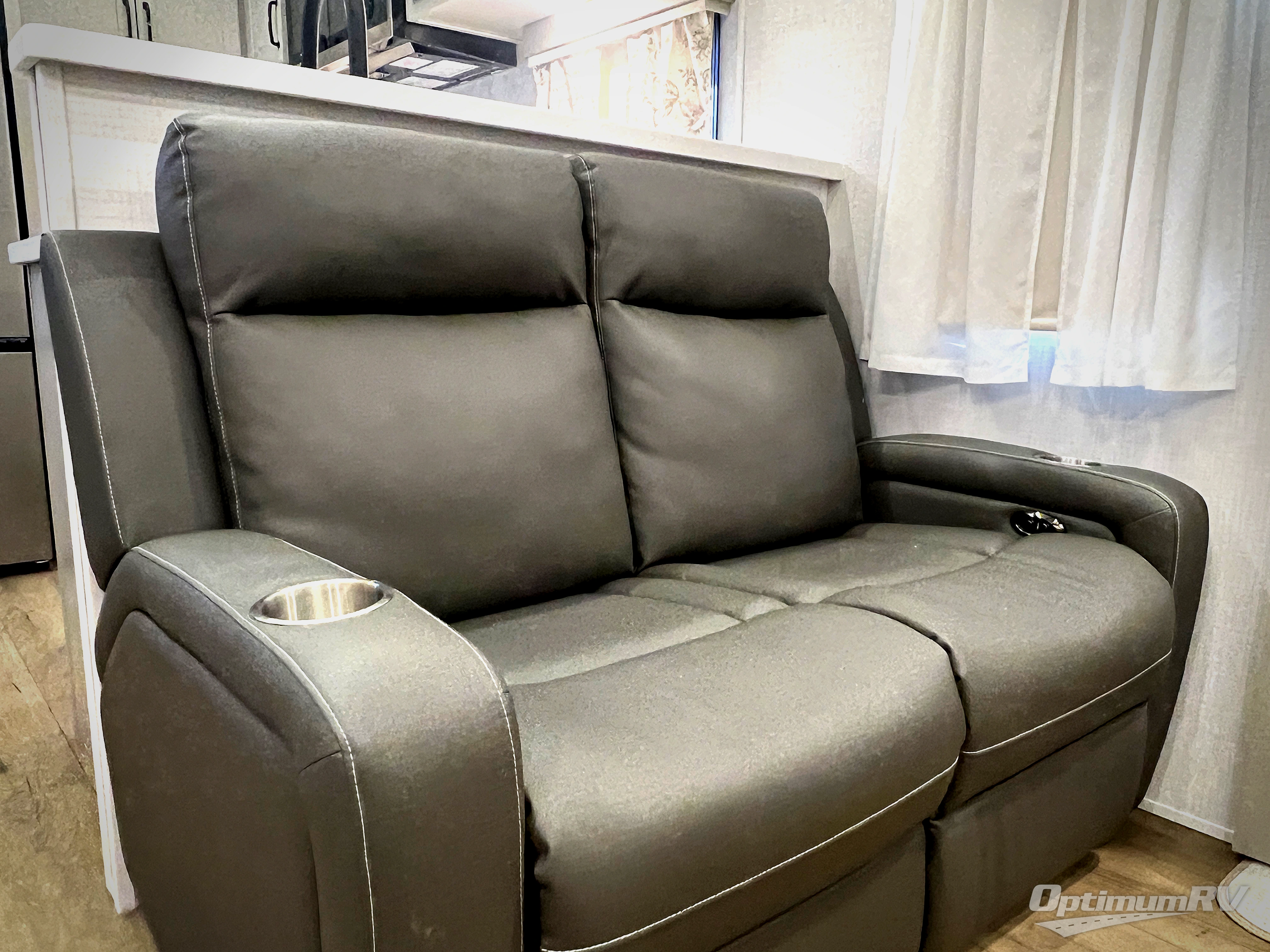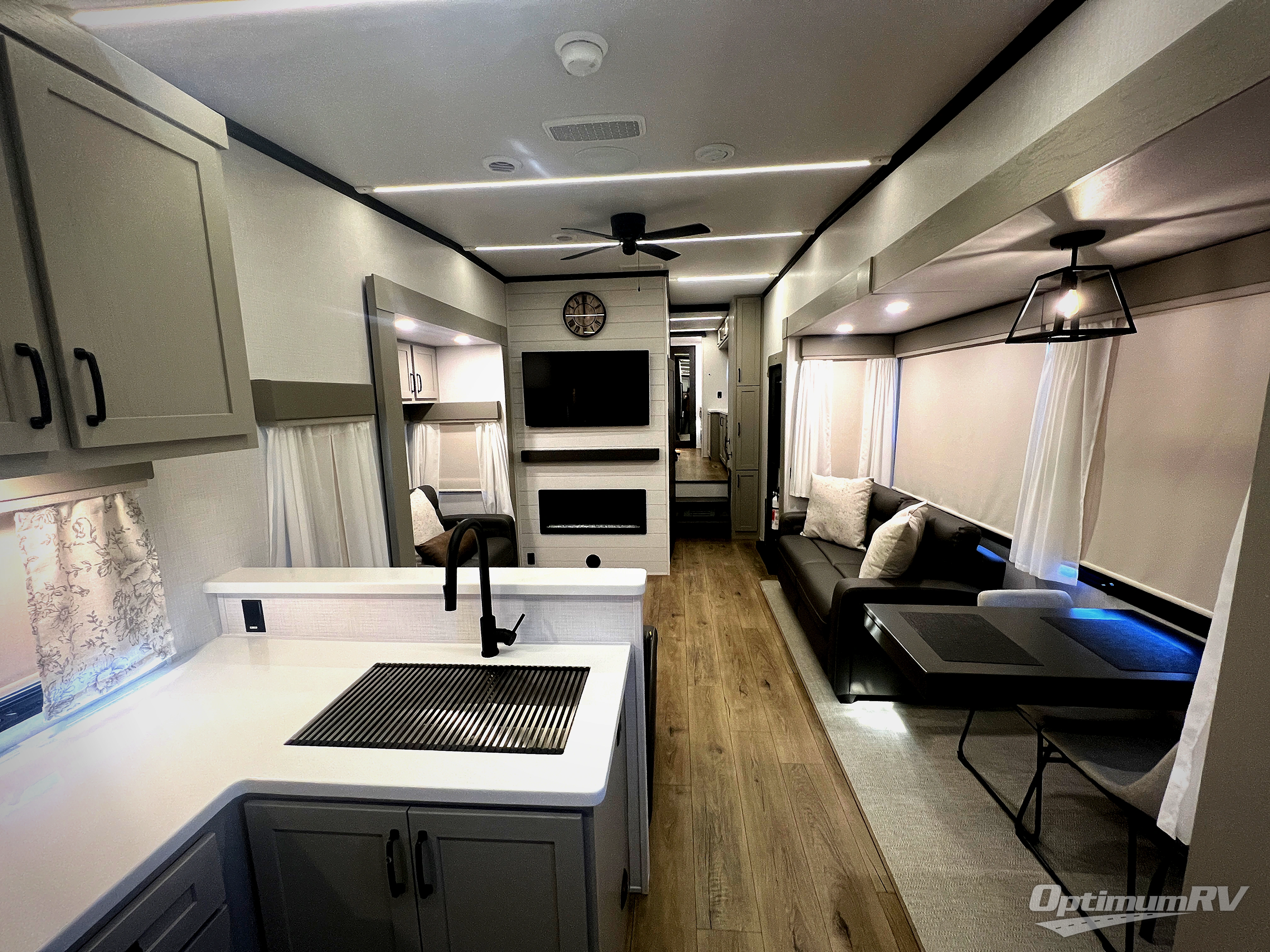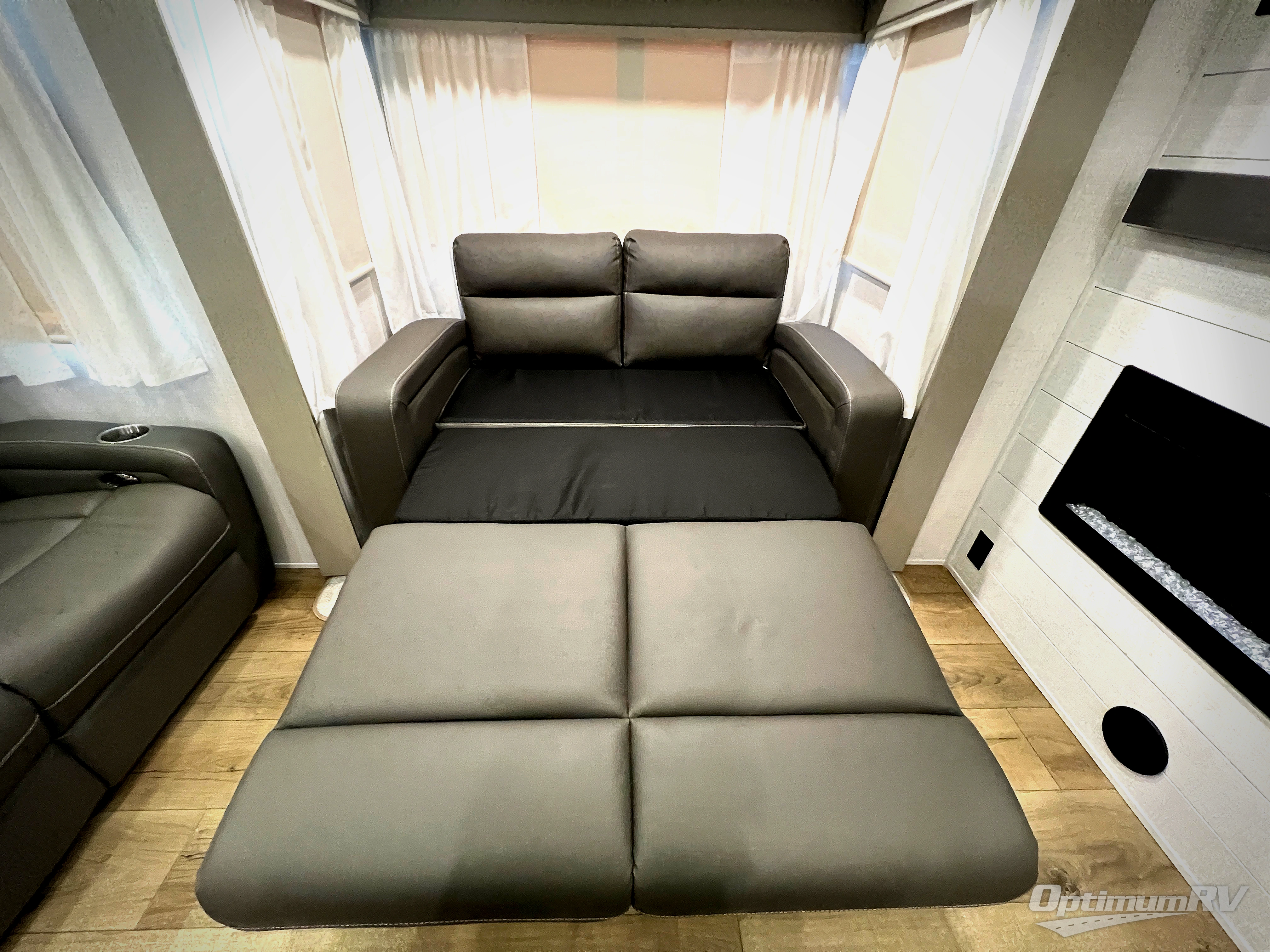 You won't believe all that this fifth wheel has to offer! Starting with the rear kitchen which has plenty of countertop space to prepare your delicious meals, a four burner cooktop with a stainless steel 24" oven to cook them, and a large single bowl stainless steel sink for easy clean up. The living area has opposing sofas and a theater seat with USB charging and storage across from an entertainment center with 50" Smart TV. The half bathroom is close to the living area so you can get back to watching your movie faster. You will feel right at home sleeping in the master suite on a slide out king bed across from a dresser and hamper to keep your space tidy, plus entrance into the front full bathroom. Inside the bathroom, you will find a vanity with dual sinks for two to get ready at once, a spacious shower with a seat, and a walk-in closet for clothes, shoes, and more!