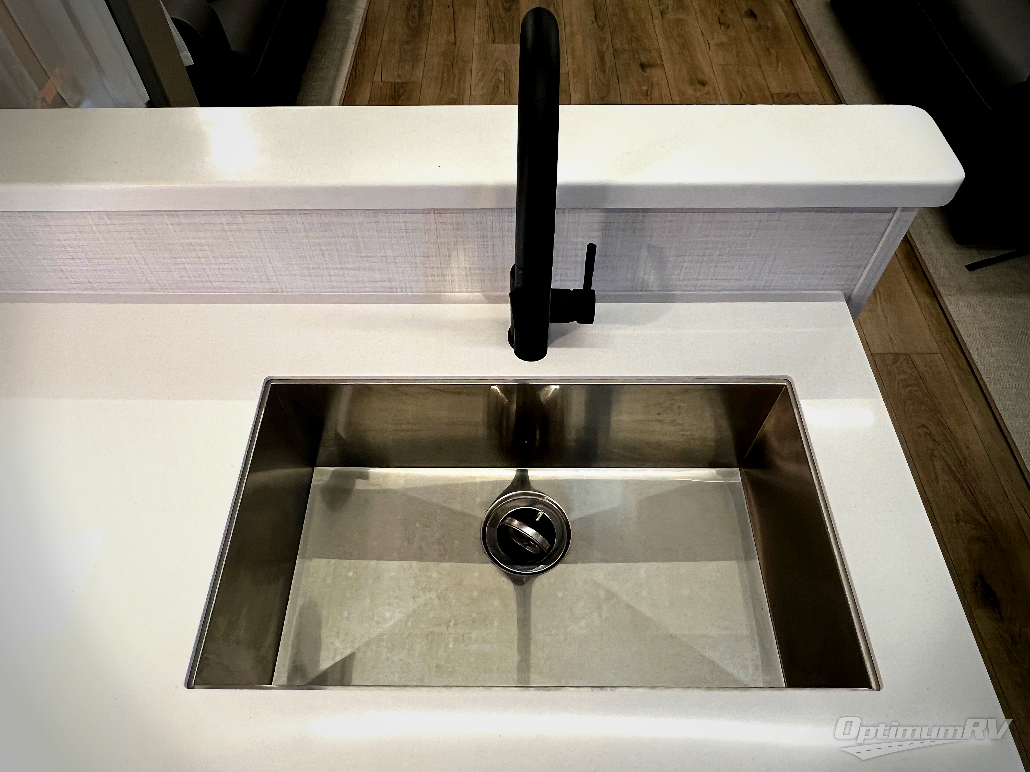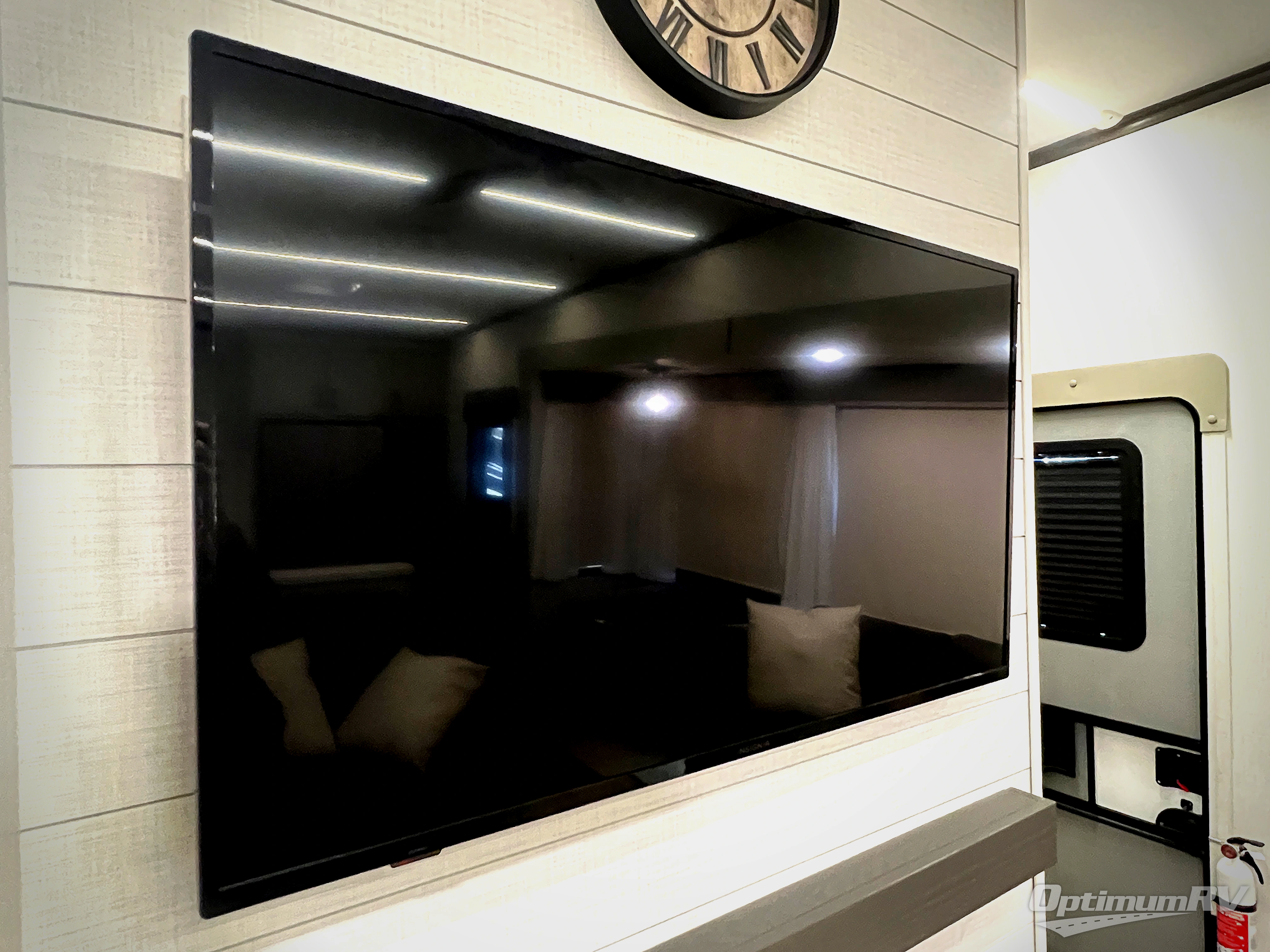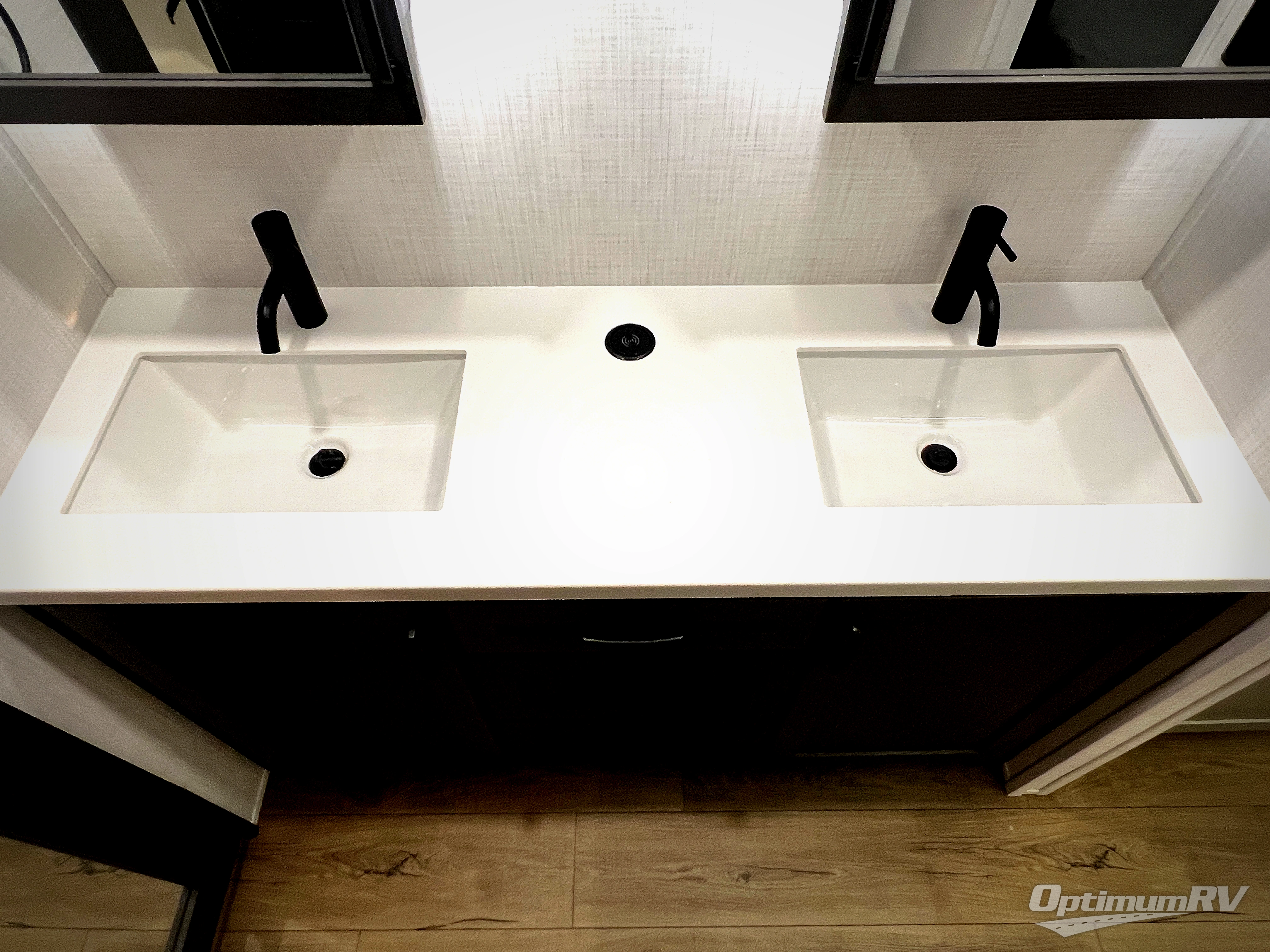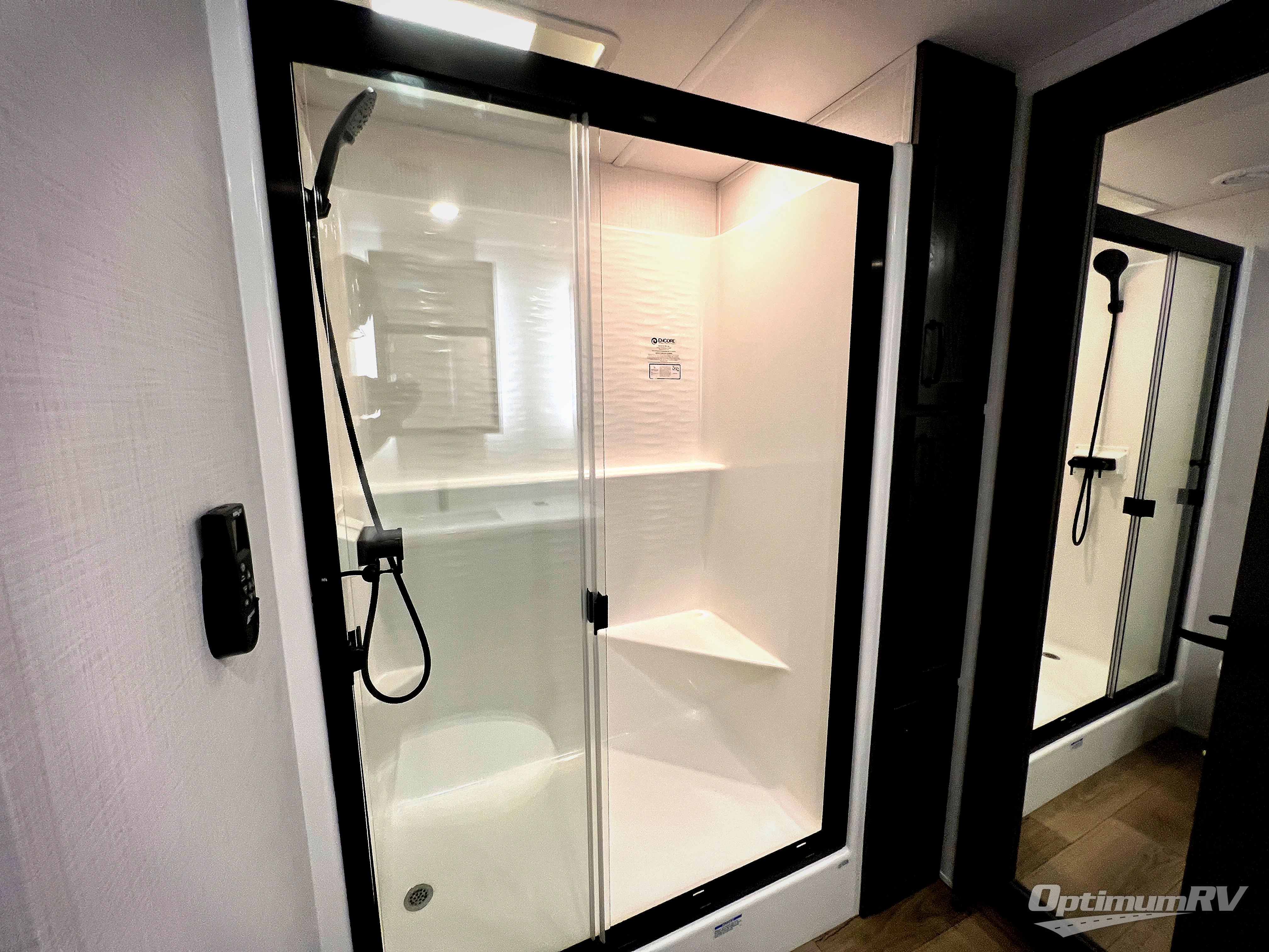 You won't believe all that this fifth wheel has to offer! Starting with the rear kitchen which has plenty of countertop space to prepare your delicious meals, a four burner cooktop with a stainless steel 24" oven to cook them, and a large single bowl stainless steel sink for easy clean up. The living area has opposing sofas and a theater seat with USB charging and storage across from an entertainment center with 50" Smart TV. The half bathroom is close to the living area so you can get back to watching your movie faster. You will feel right at home sleeping in the master suite on a slide out king bed across from a dresser and hamper to keep your space tidy, plus entrance into the front full bathroom. Inside the bathroom, you will find a vanity with dual sinks for two to get ready at once, a spacious shower with a seat, and a walk-in closet for clothes, shoes, and more!