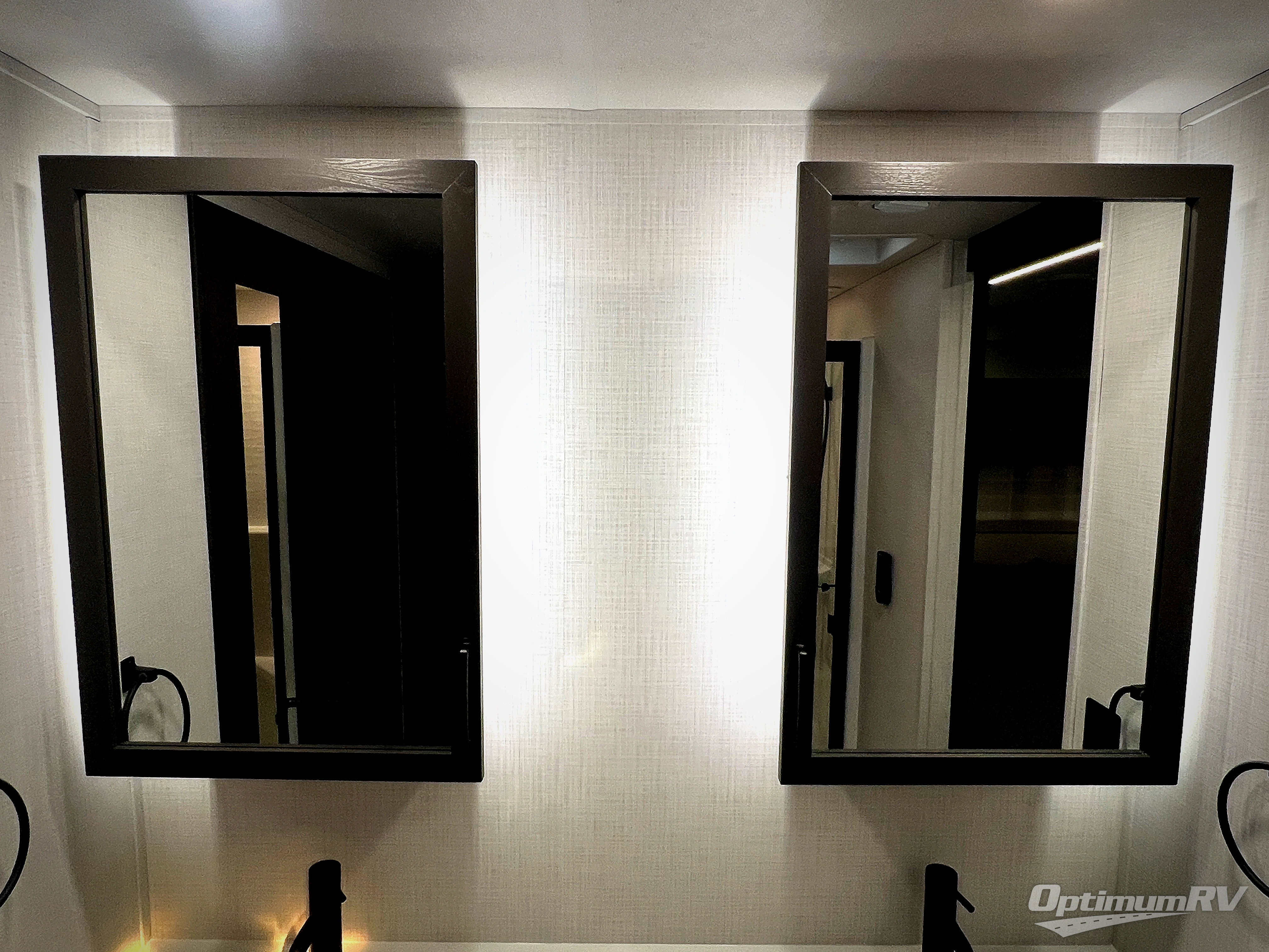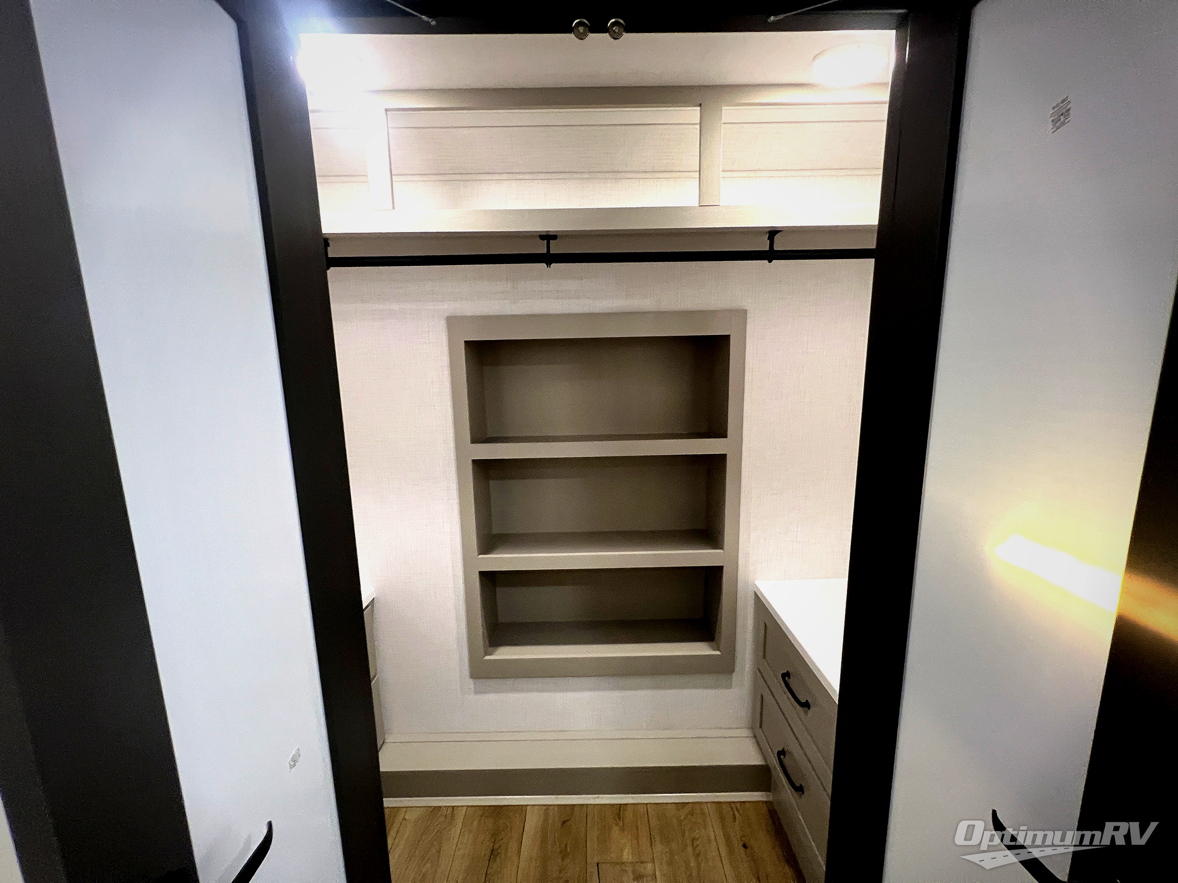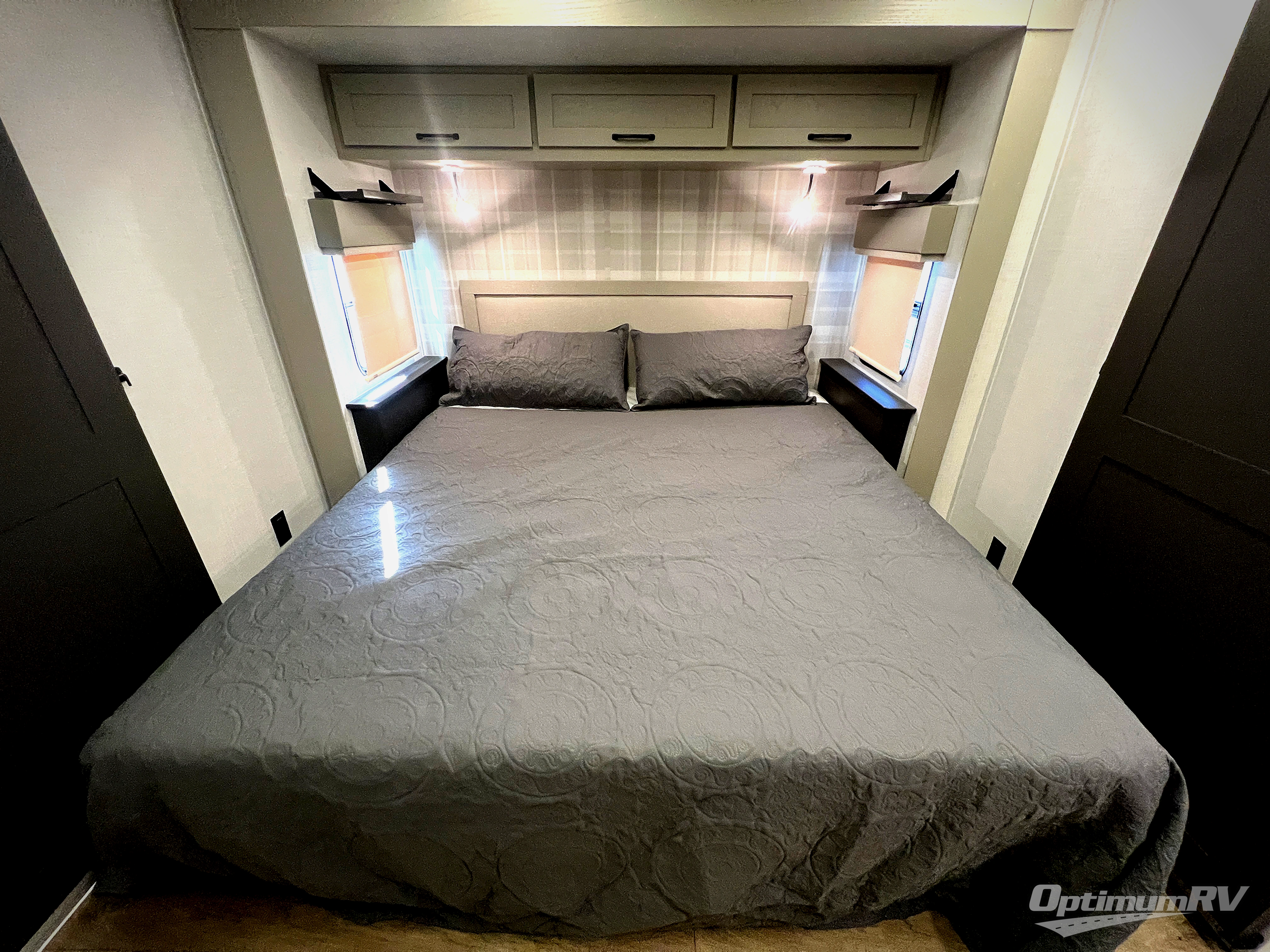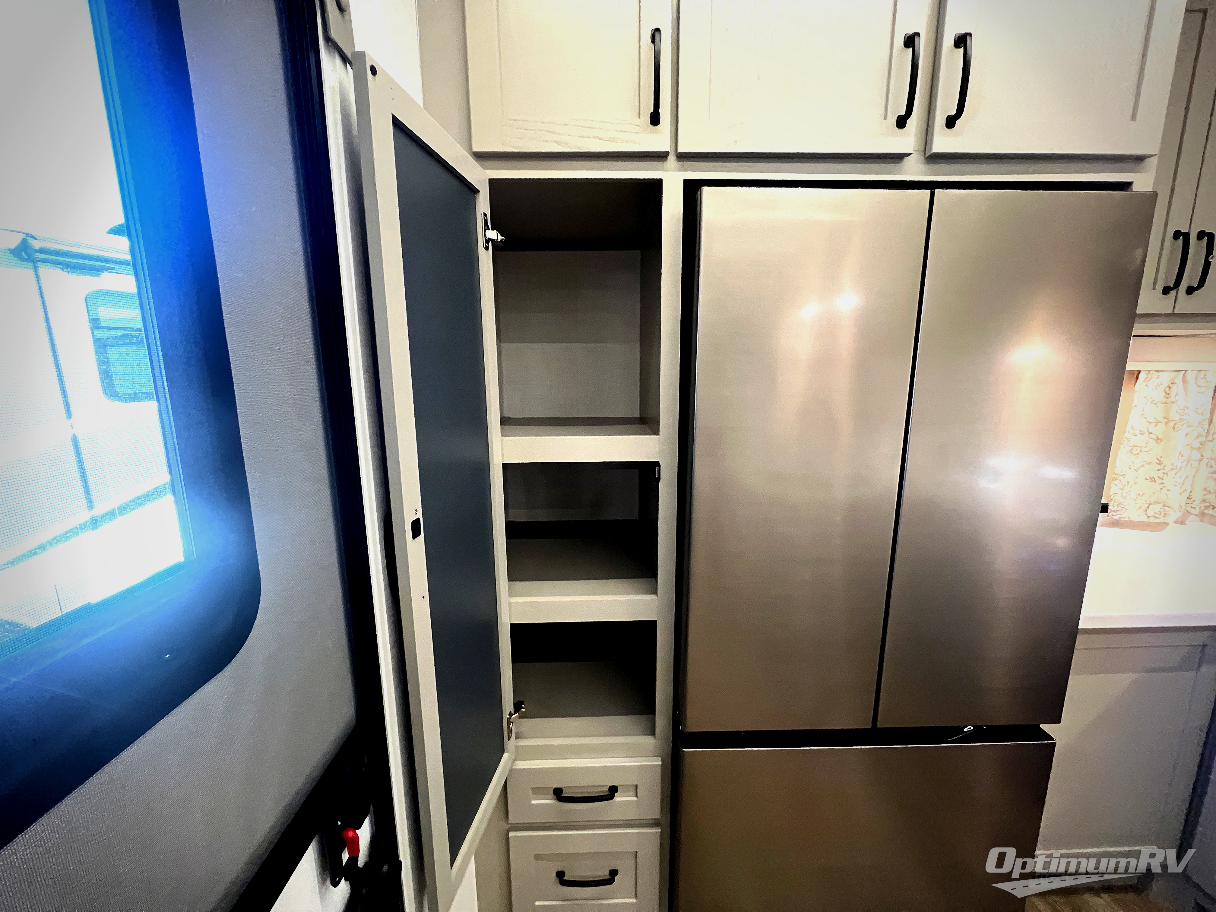 You won't believe all that this fifth wheel has to offer! Starting with the rear kitchen which has plenty of countertop space to prepare your delicious meals, a four burner cooktop with a stainless steel 24" oven to cook them, and a large single bowl stainless steel sink for easy clean up. The living area has opposing sofas and a theater seat with USB charging and storage across from an entertainment center with 50" Smart TV. The half bathroom is close to the living area so you can get back to watching your movie faster. You will feel right at home sleeping in the master suite on a slide out king bed across from a dresser and hamper to keep your space tidy, plus entrance into the front full bathroom. Inside the bathroom, you will find a vanity with dual sinks for two to get ready at once, a spacious shower with a seat, and a walk-in closet for clothes, shoes, and more!