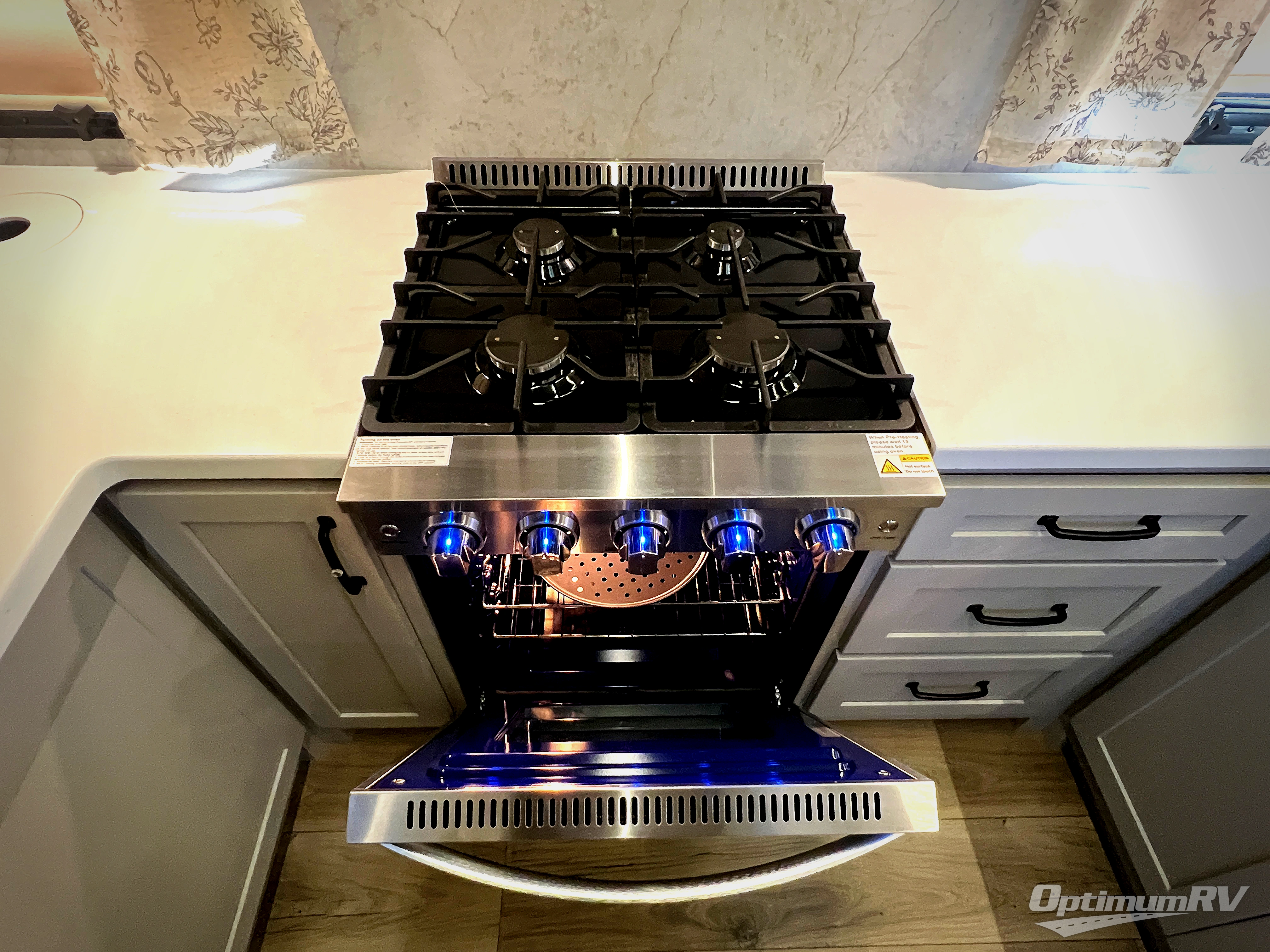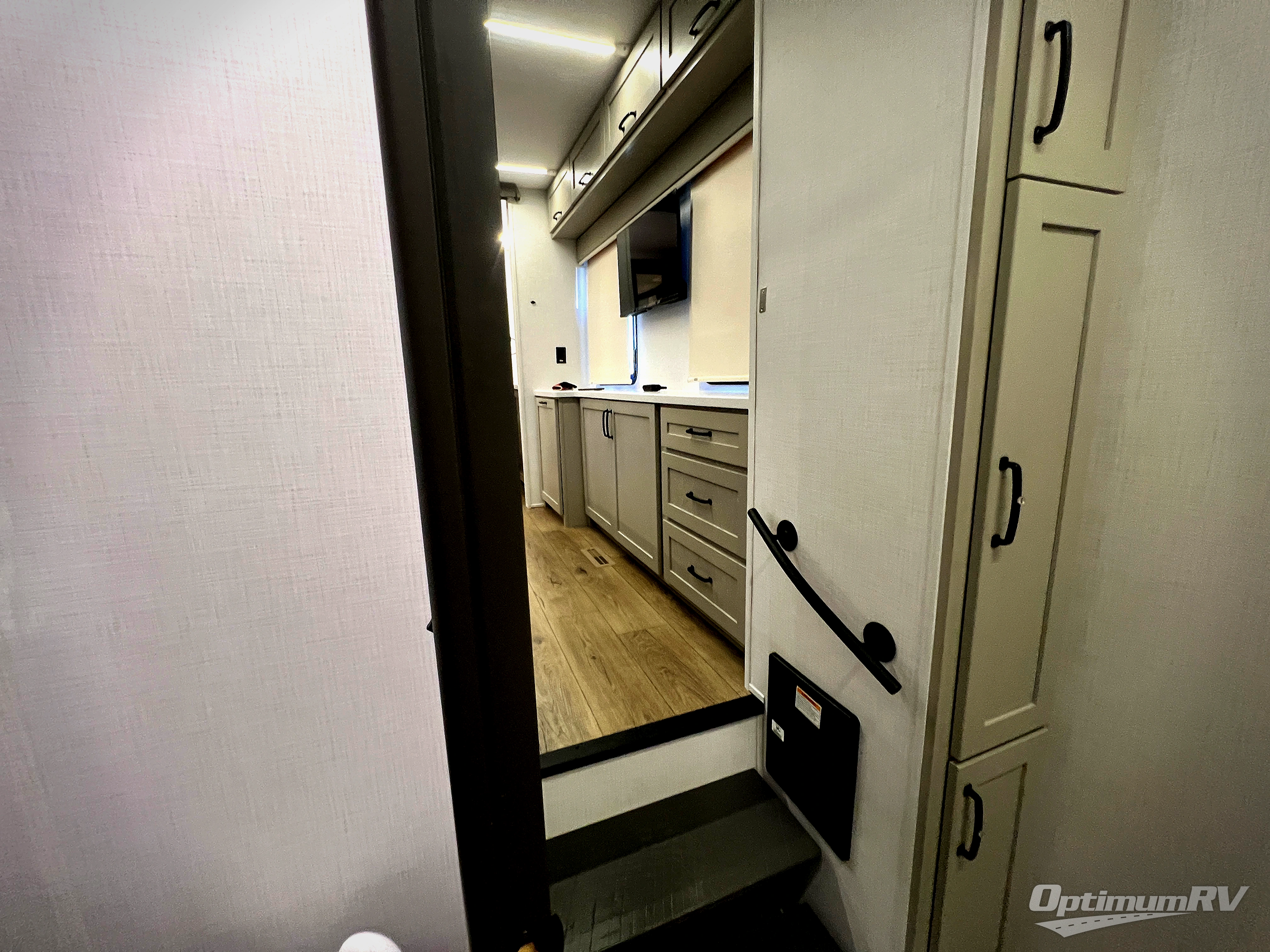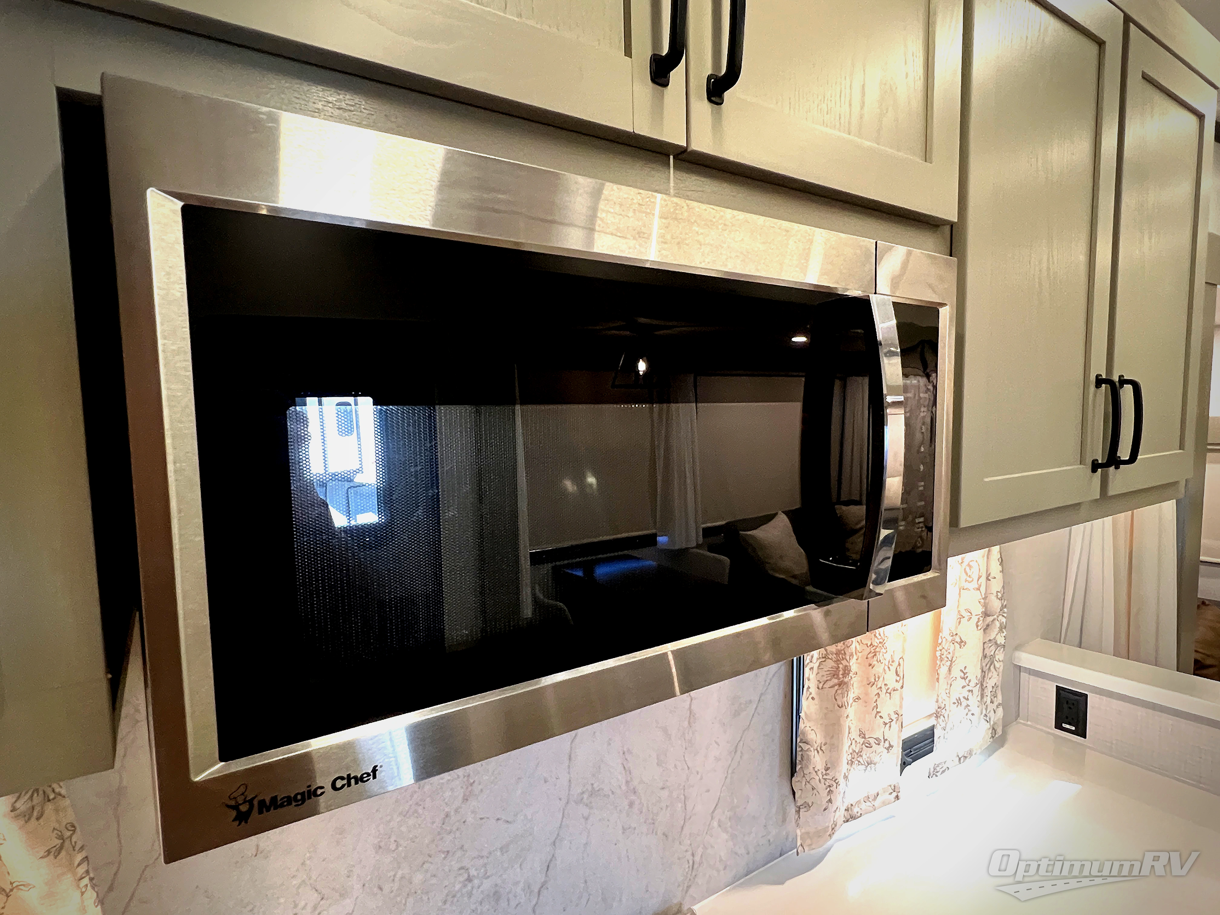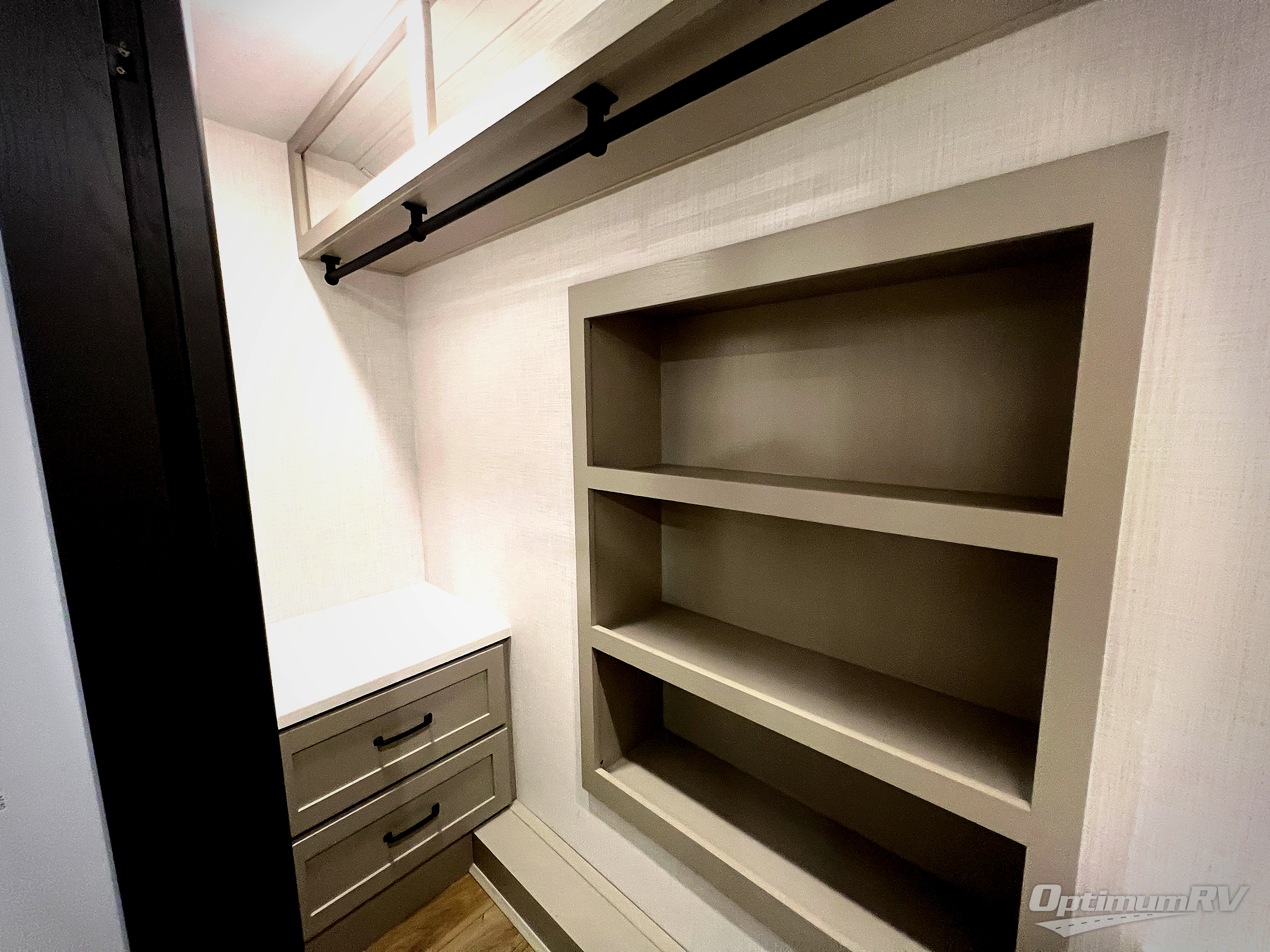 You won't believe all that this fifth wheel has to offer! Starting with the rear kitchen which has plenty of countertop space to prepare your delicious meals, a four burner cooktop with a stainless steel 24" oven to cook them, and a large single bowl stainless steel sink for easy clean up. The living area has opposing sofas and a theater seat with USB charging and storage across from an entertainment center with 50" Smart TV. The half bathroom is close to the living area so you can get back to watching your movie faster. You will feel right at home sleeping in the master suite on a slide out king bed across from a dresser and hamper to keep your space tidy, plus entrance into the front full bathroom. Inside the bathroom, you will find a vanity with dual sinks for two to get ready at once, a spacious shower with a seat, and a walk-in closet for clothes, shoes, and more!
