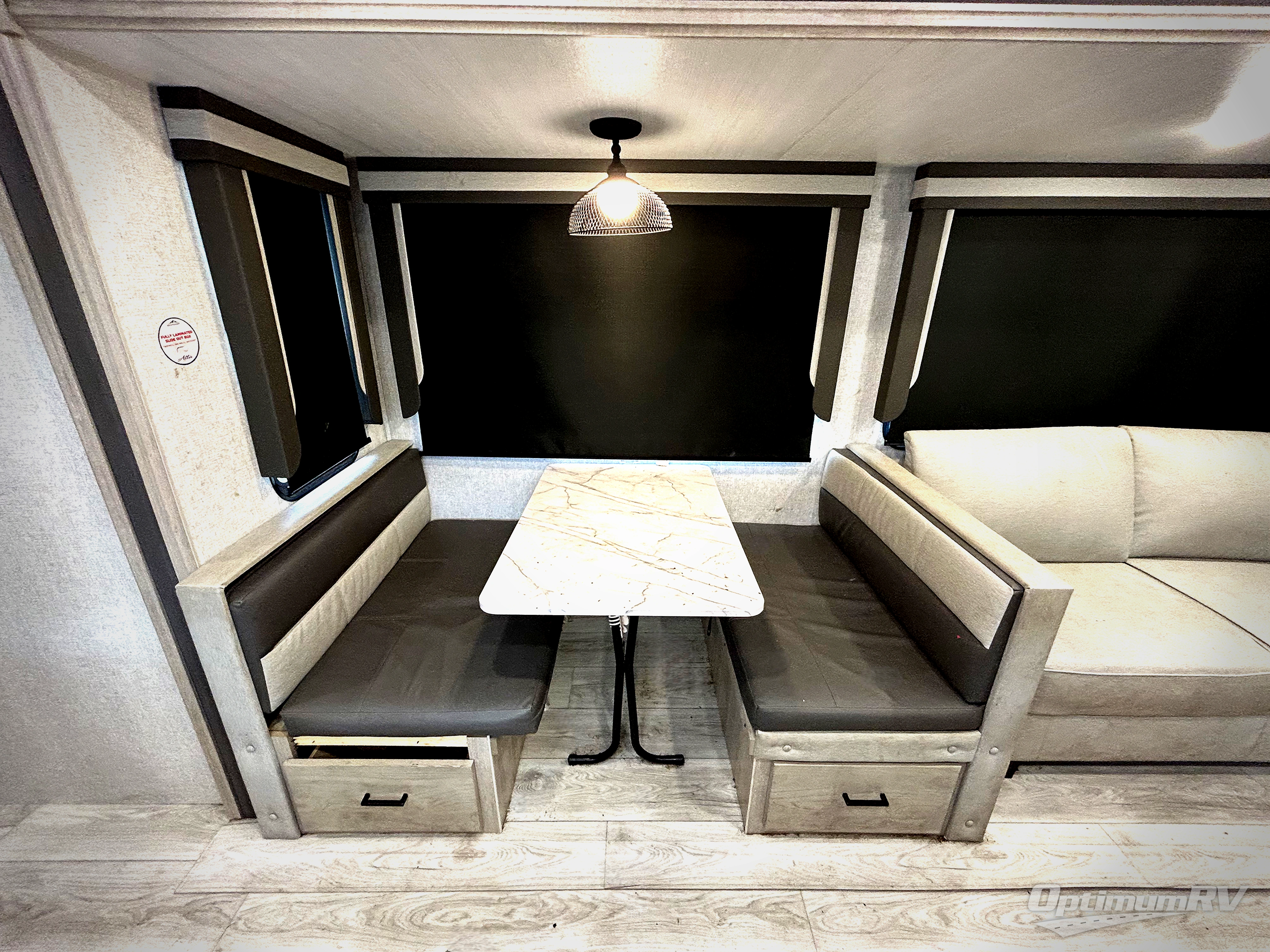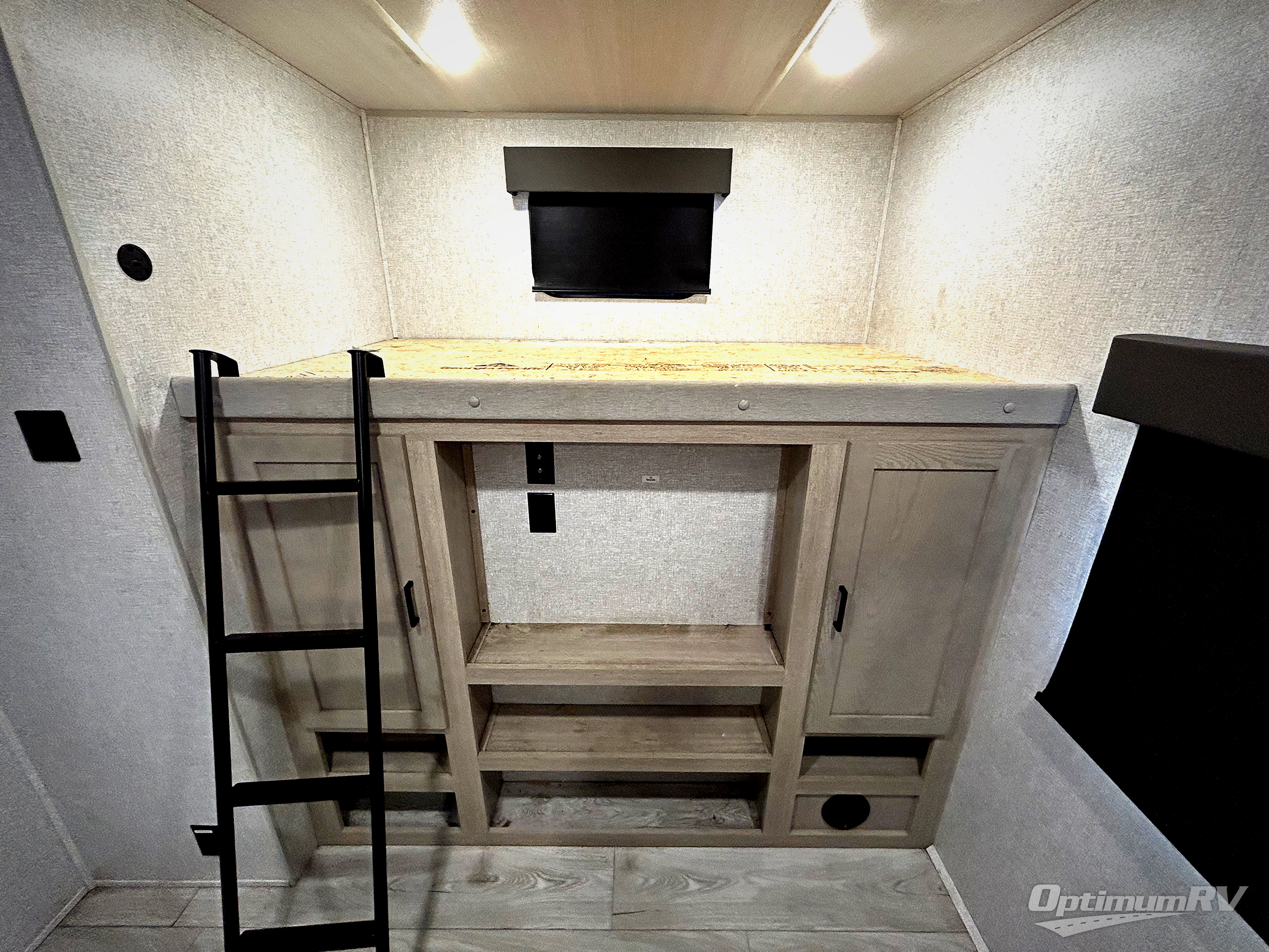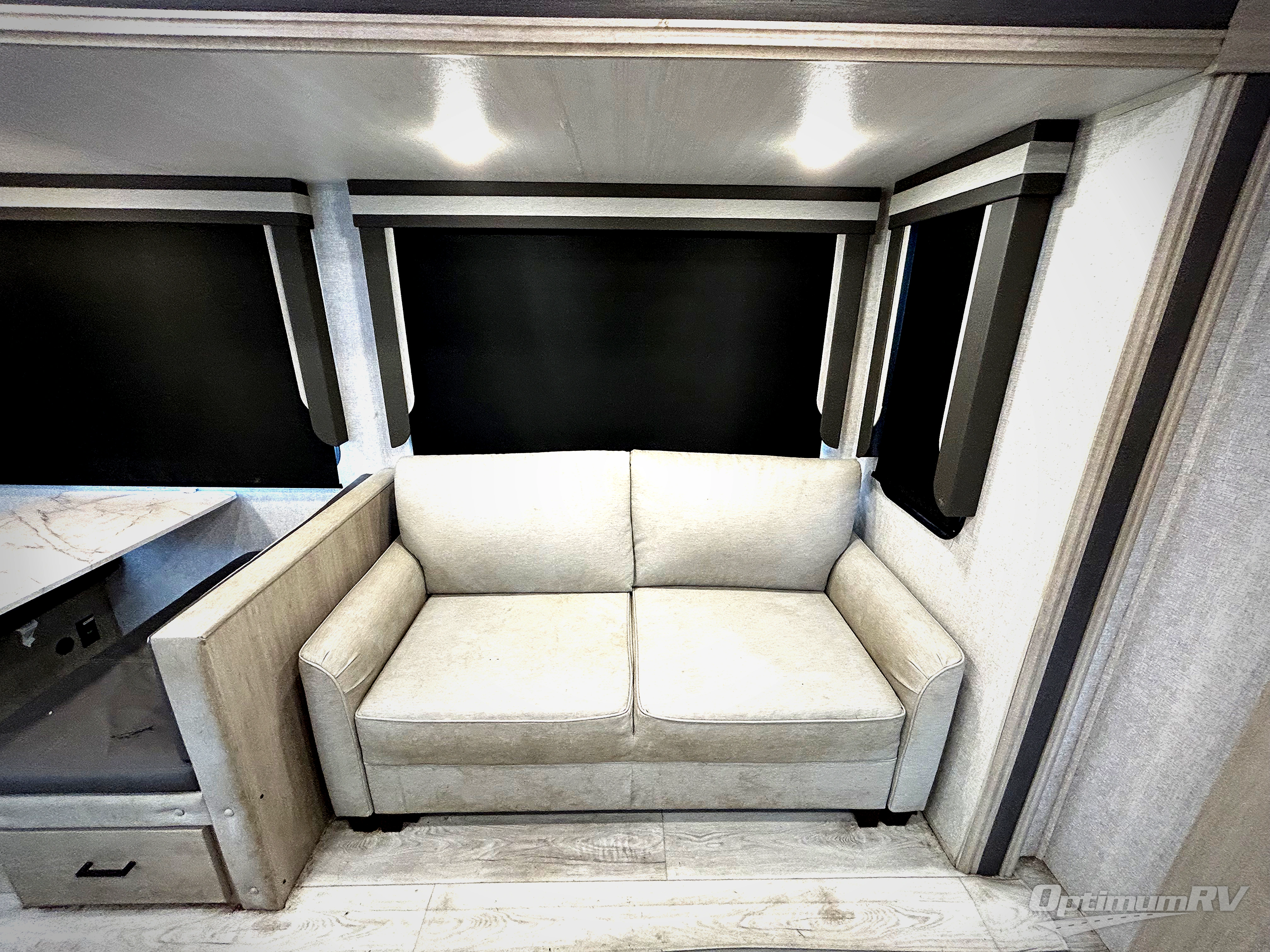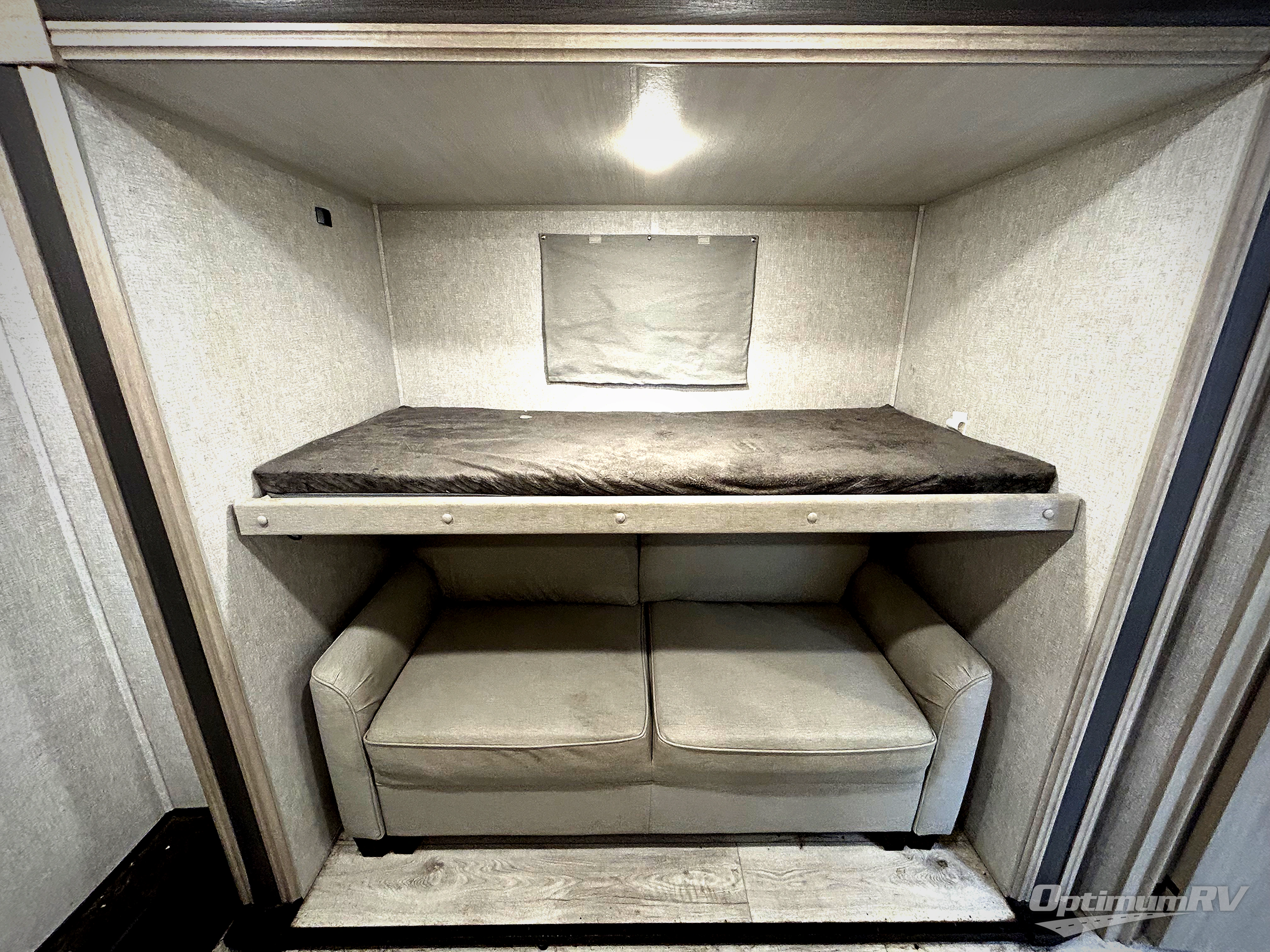 If you're looking for a travel trailer to take tailgating, this Alta model is the one! After you've unloaded the pass-through storage and set up the 21' power awning, start lunch on the outside kitchen! Since there are dual entry doors you can enter in through the main living area, or the full bath for convenience. The little ones are sure to spend most of their time in the rear bunkhouse that includes a flip-up bunk under the sofa, plus a second bunk across the room. The adults can visit at the booth dinette or on the tri-fold sofa, and check out the front private bedroom with sliding doors and a king bed for all-around comfort!