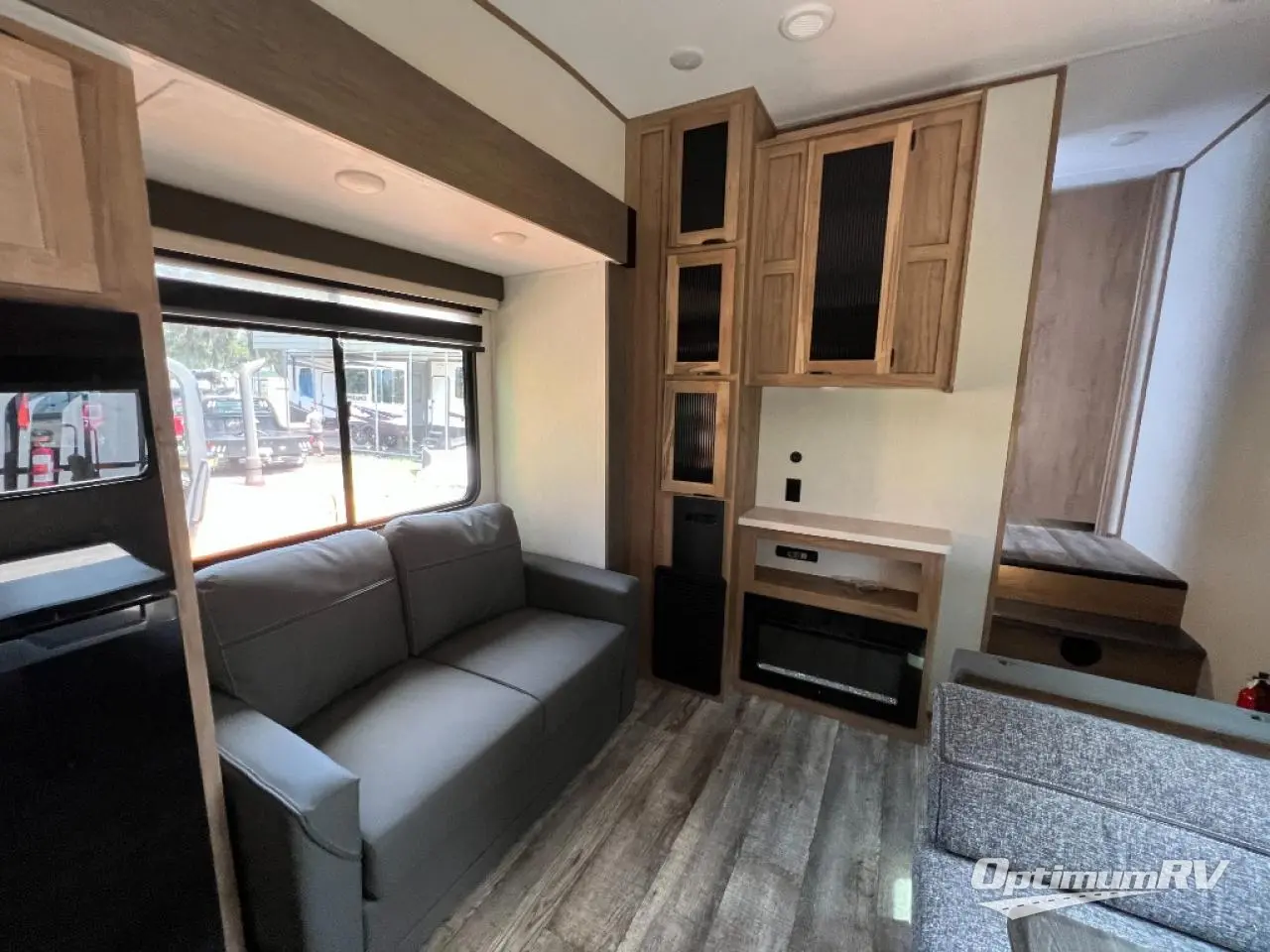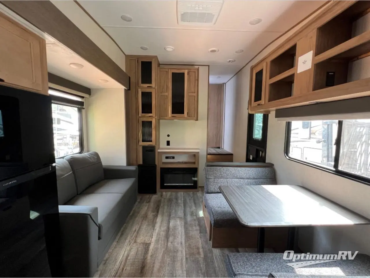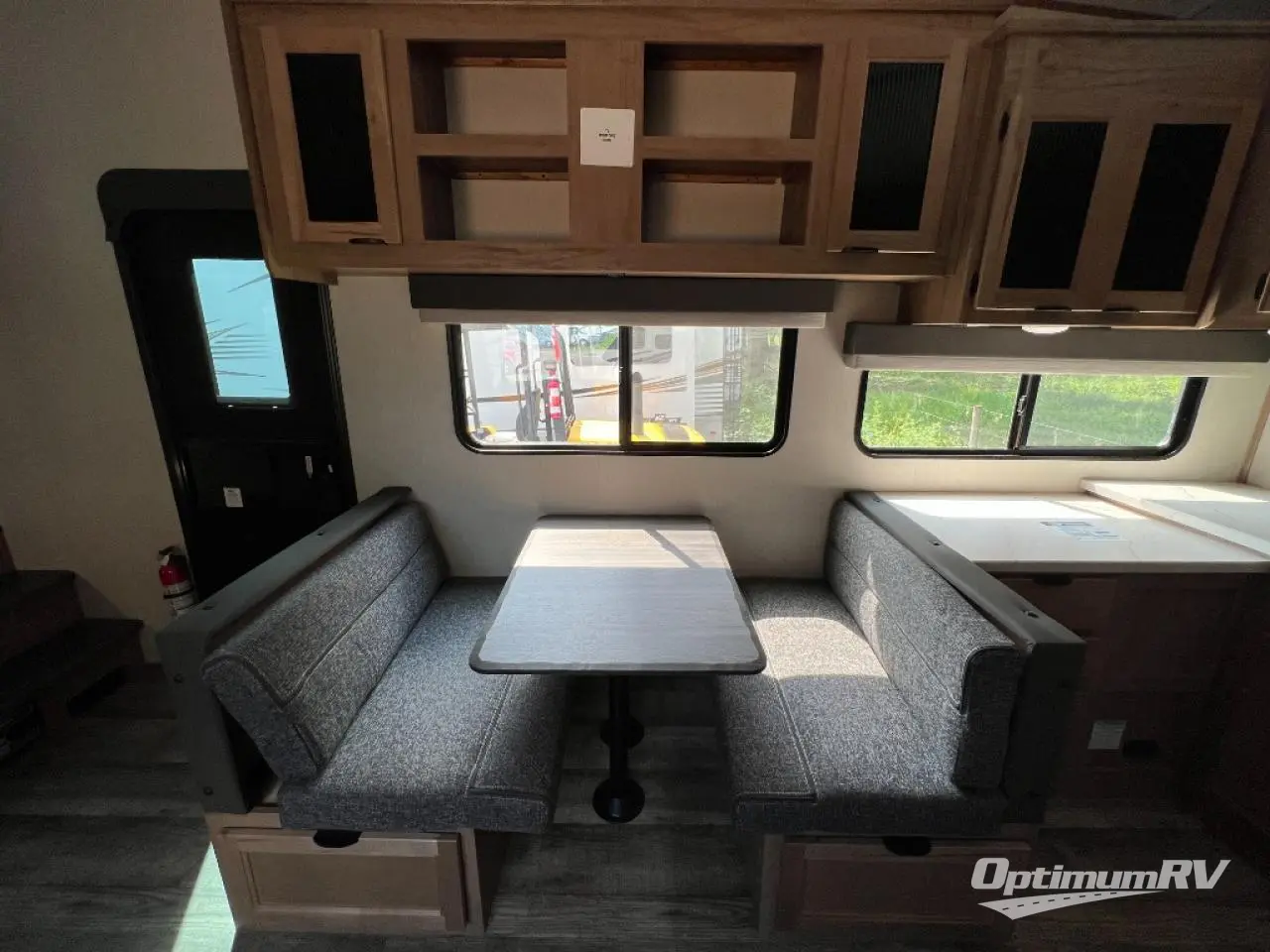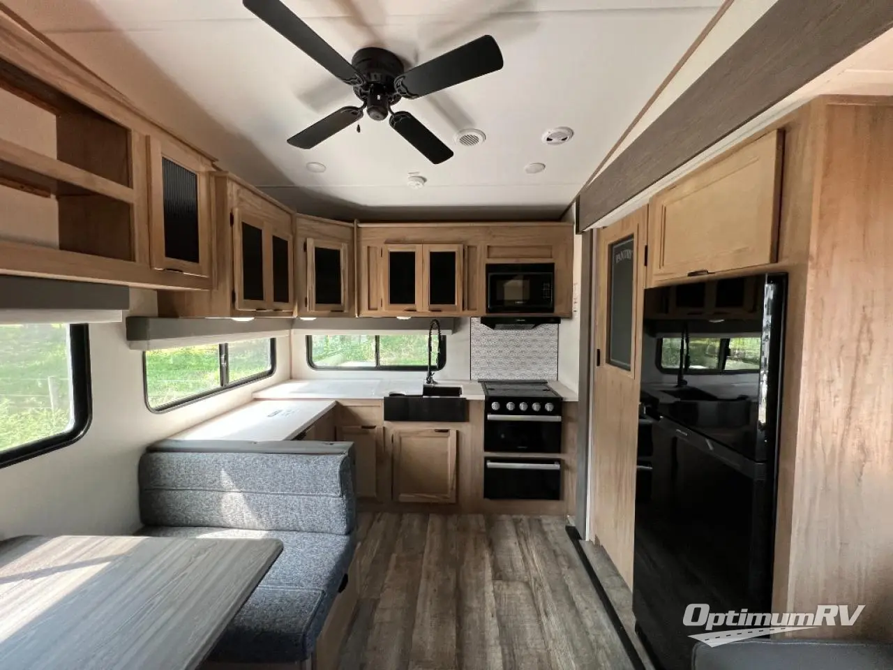 You and your spouse will love camping in this fifth wheel! The front private bedroom has a queen bed for a good night's rest with wardrobes and USB ports on either side for your electronics to charge while you do. Inside the full bathroom is a shower with a removable shower rod for hang-drying your clothes. The centralized ceiling fan will help to circulate the cool air from the 15,000 BTU air conditioner so you can stay cool as you prepare delicious meals in the rear kitchen. You even have two pantries for all of your snacks, a hutch for your dishes, and an electric fireplace to enjoy either on the tri-fold sofa or booth dinette. The outside kitchen is under the 20' awning so you can stay protected while you cook in the great outdoors!