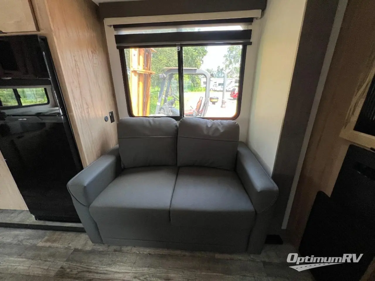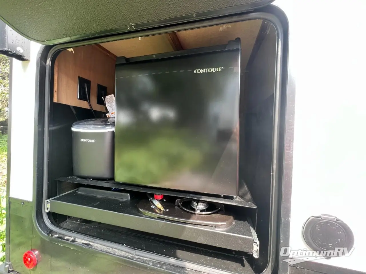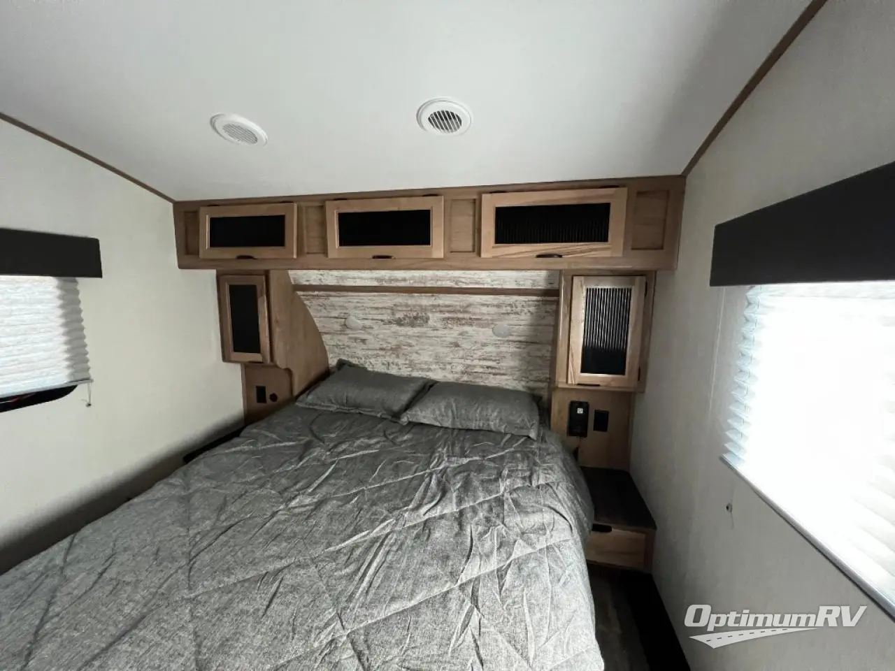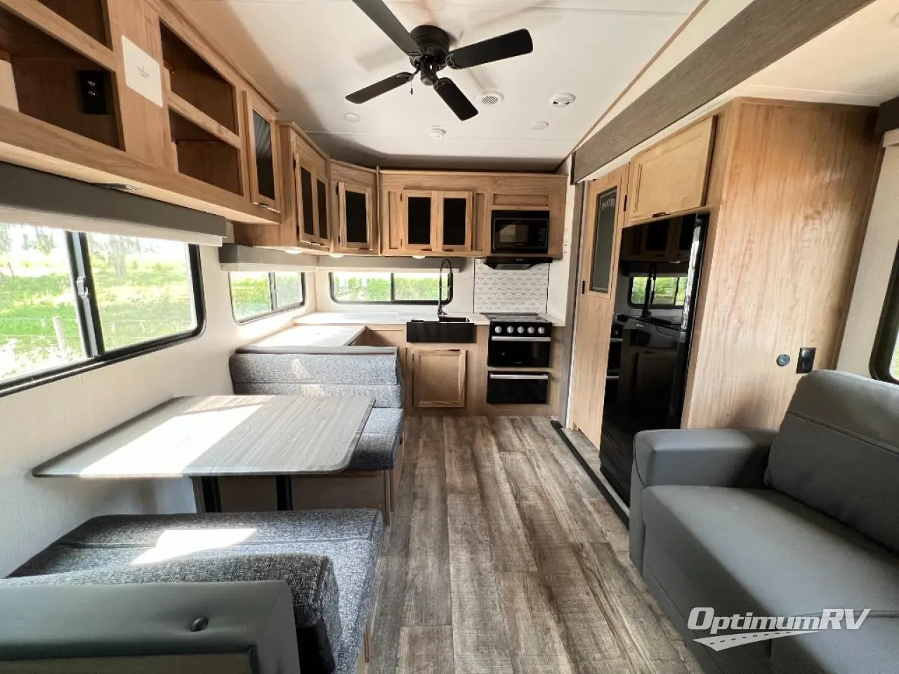 You and your spouse will love camping in this fifth wheel! The front private bedroom has a queen bed for a good night's rest with wardrobes and USB ports on either side for your electronics to charge while you do. Inside the full bathroom is a shower with a removable shower rod for hang-drying your clothes. The centralized ceiling fan will help to circulate the cool air from the 15,000 BTU air conditioner so you can stay cool as you prepare delicious meals in the rear kitchen. You even have two pantries for all of your snacks, a hutch for your dishes, and an electric fireplace to enjoy either on the tri-fold sofa or booth dinette. The outside kitchen is under the 20' awning so you can stay protected while you cook in the great outdoors!