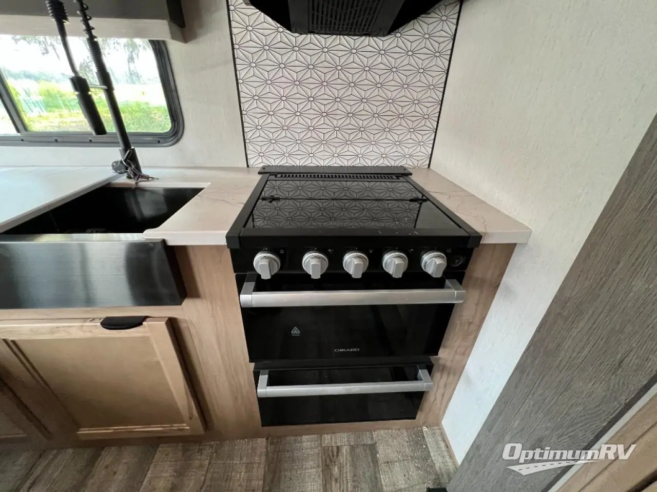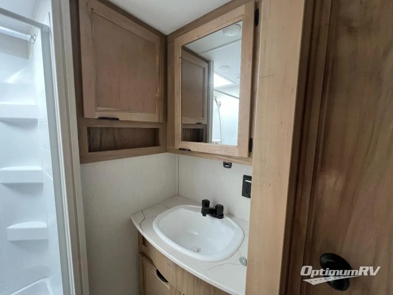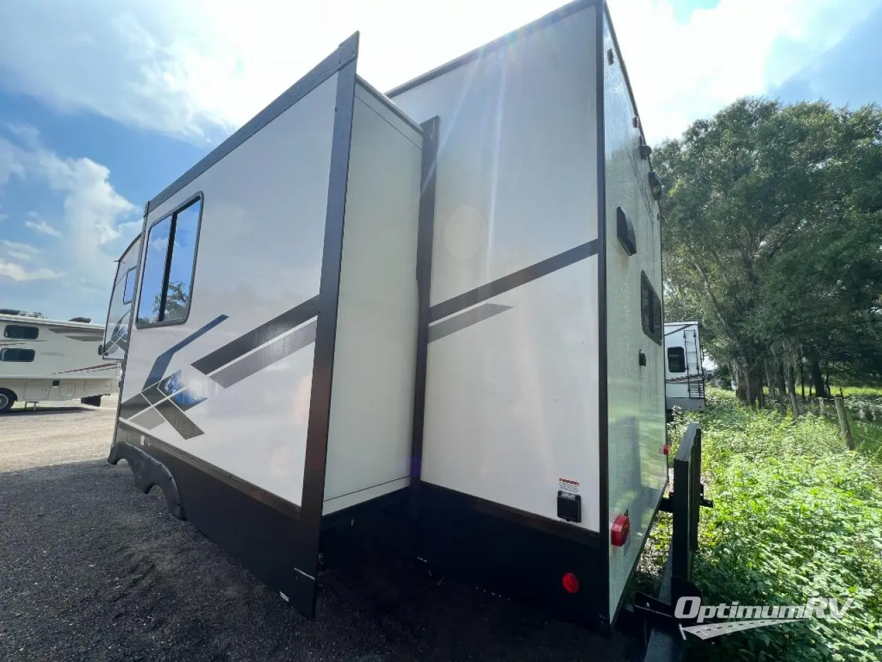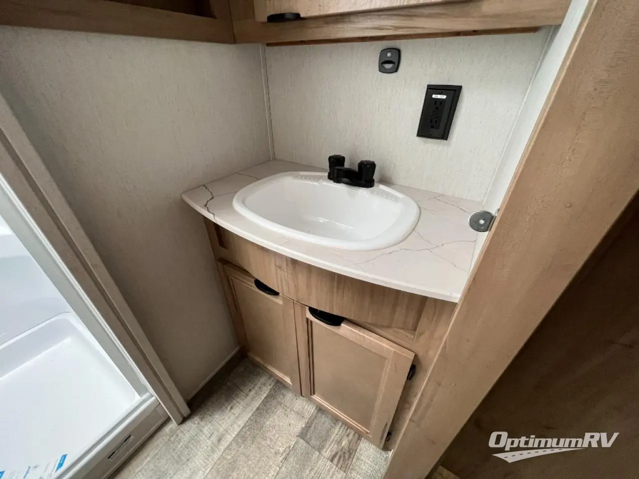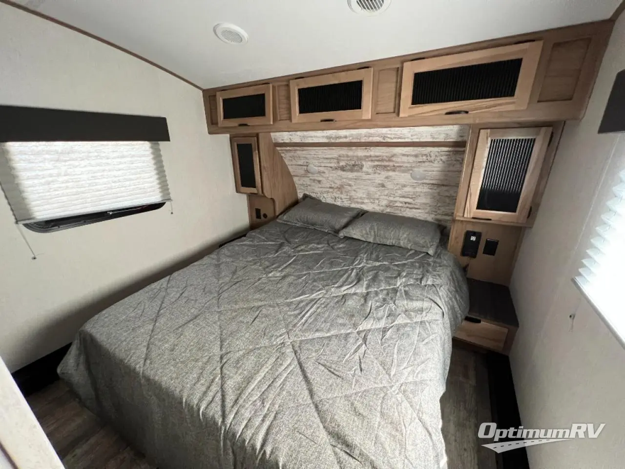 You and your spouse will love camping in this fifth wheel! The front private bedroom has a queen bed for a good night's rest with wardrobes and USB ports on either side for your electronics to charge while you do. Inside the full bathroom is a shower with a removable shower rod for hang-drying your clothes. The centralized ceiling fan will help to circulate the cool air from the 15,000 BTU air conditioner so you can stay cool as you prepare delicious meals in the rear kitchen. You even have two pantries for all of your snacks, a hutch for your dishes, and an electric fireplace to enjoy either on the tri-fold sofa or booth dinette. The outside kitchen is under the 20' awning so you can stay protected while you cook in the great outdoors!