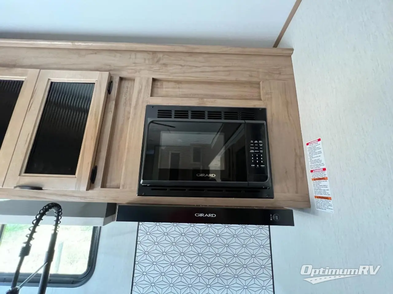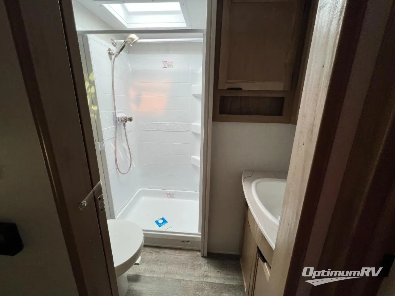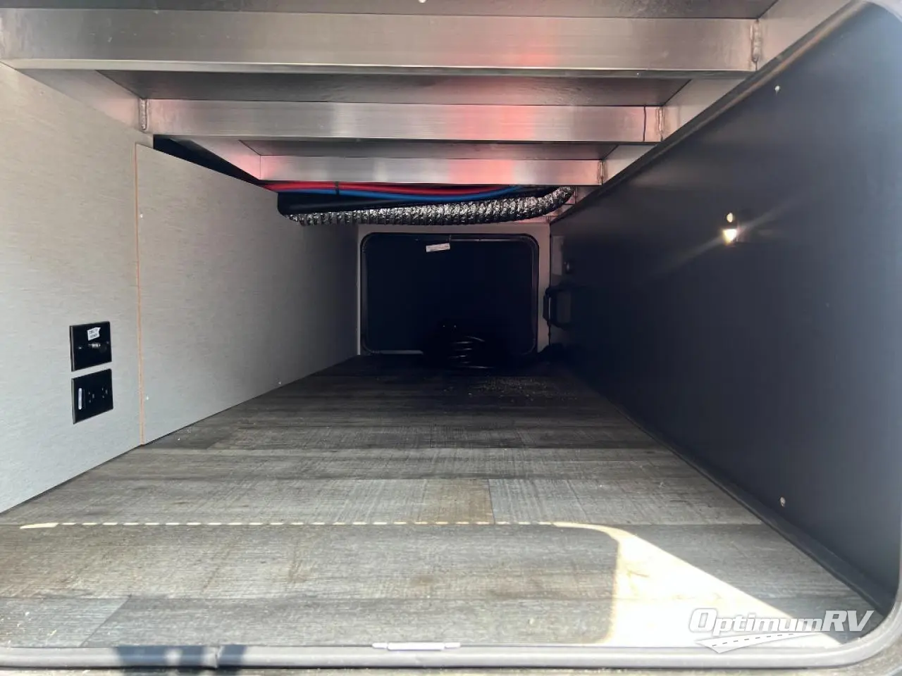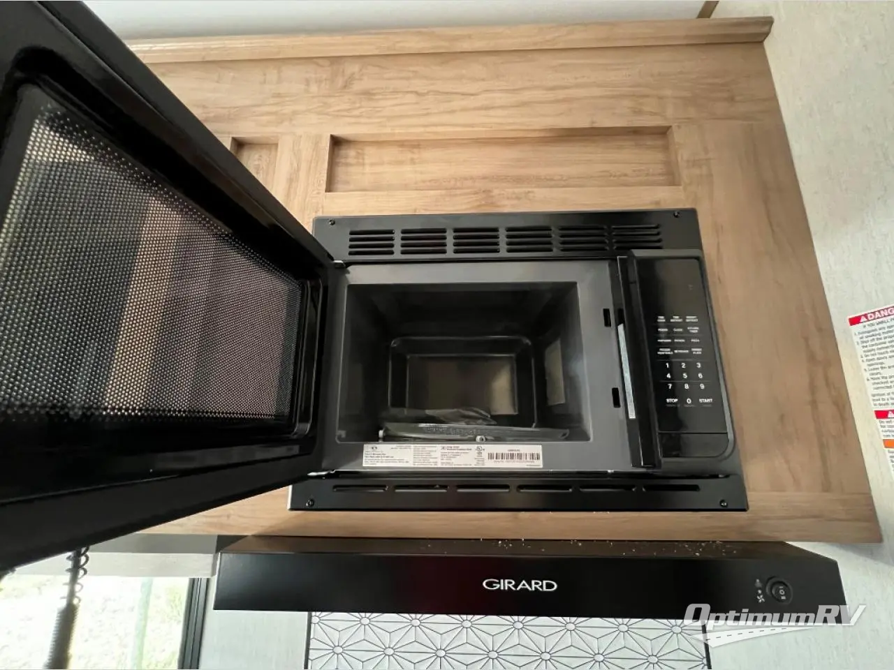 You and your spouse will love camping in this fifth wheel! The front private bedroom has a queen bed for a good night's rest with wardrobes and USB ports on either side for your electronics to charge while you do. Inside the full bathroom is a shower with a removable shower rod for hang-drying your clothes. The centralized ceiling fan will help to circulate the cool air from the 15,000 BTU air conditioner so you can stay cool as you prepare delicious meals in the rear kitchen. You even have two pantries for all of your snacks, a hutch for your dishes, and an electric fireplace to enjoy either on the tri-fold sofa or booth dinette. The outside kitchen is under the 20' awning so you can stay protected while you cook in the great outdoors!