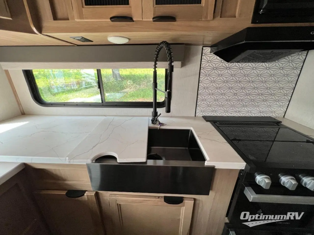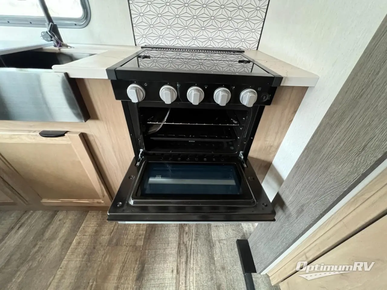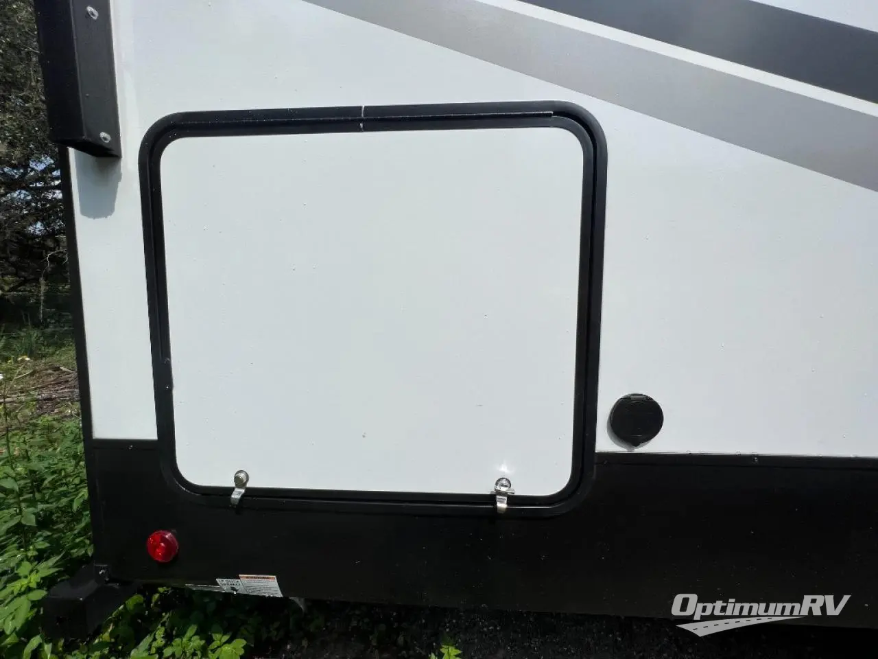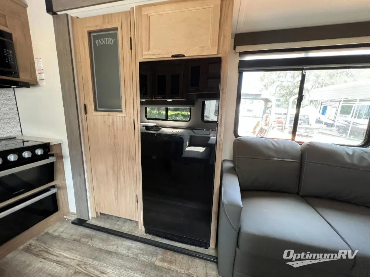 You and your spouse will love camping in this fifth wheel! The front private bedroom has a queen bed for a good night's rest with wardrobes and USB ports on either side for your electronics to charge while you do. Inside the full bathroom is a shower with a removable shower rod for hang-drying your clothes. The centralized ceiling fan will help to circulate the cool air from the 15,000 BTU air conditioner so you can stay cool as you prepare delicious meals in the rear kitchen. You even have two pantries for all of your snacks, a hutch for your dishes, and an electric fireplace to enjoy either on the tri-fold sofa or booth dinette. The outside kitchen is under the 20' awning so you can stay protected while you cook in the great outdoors!