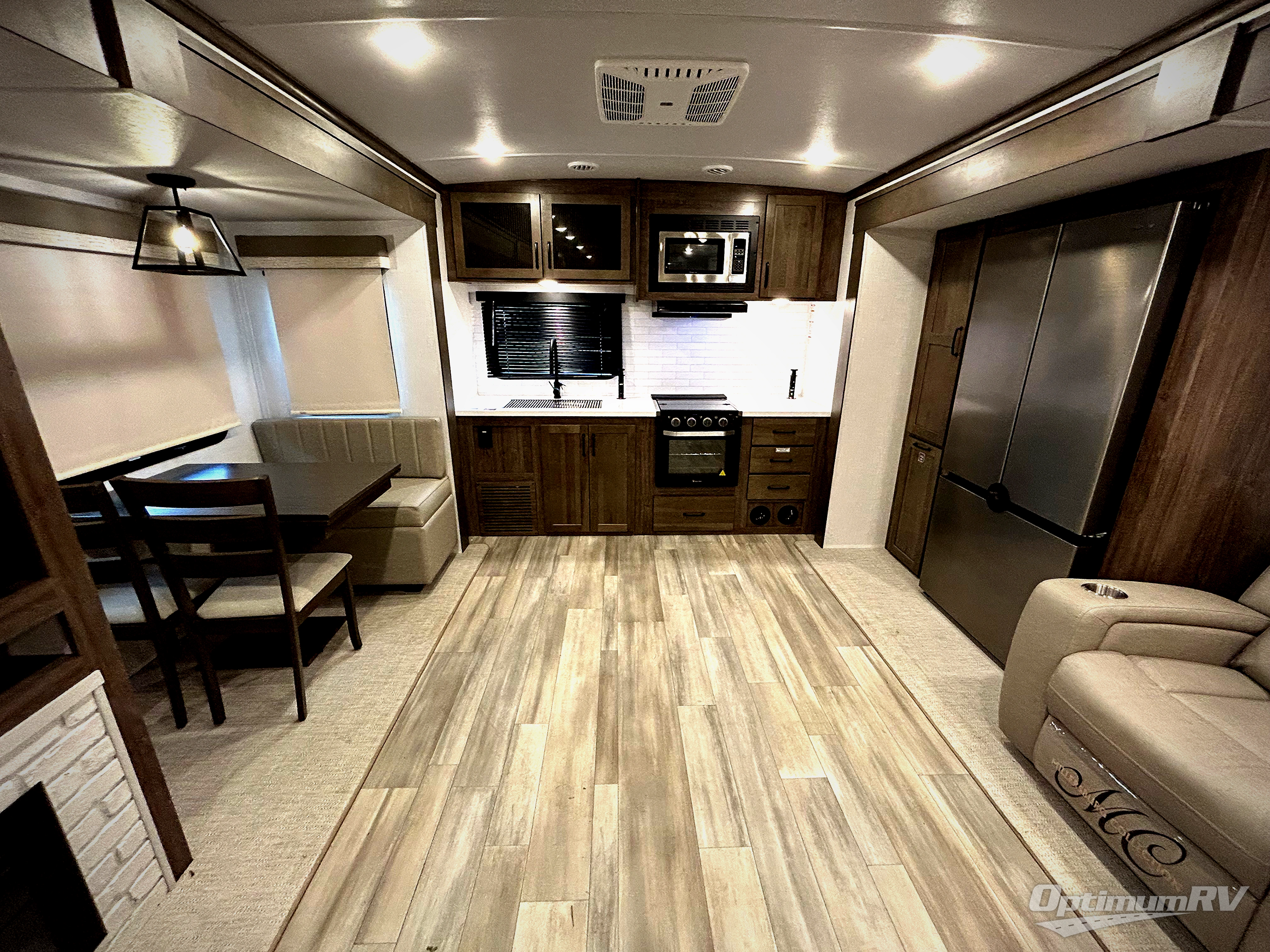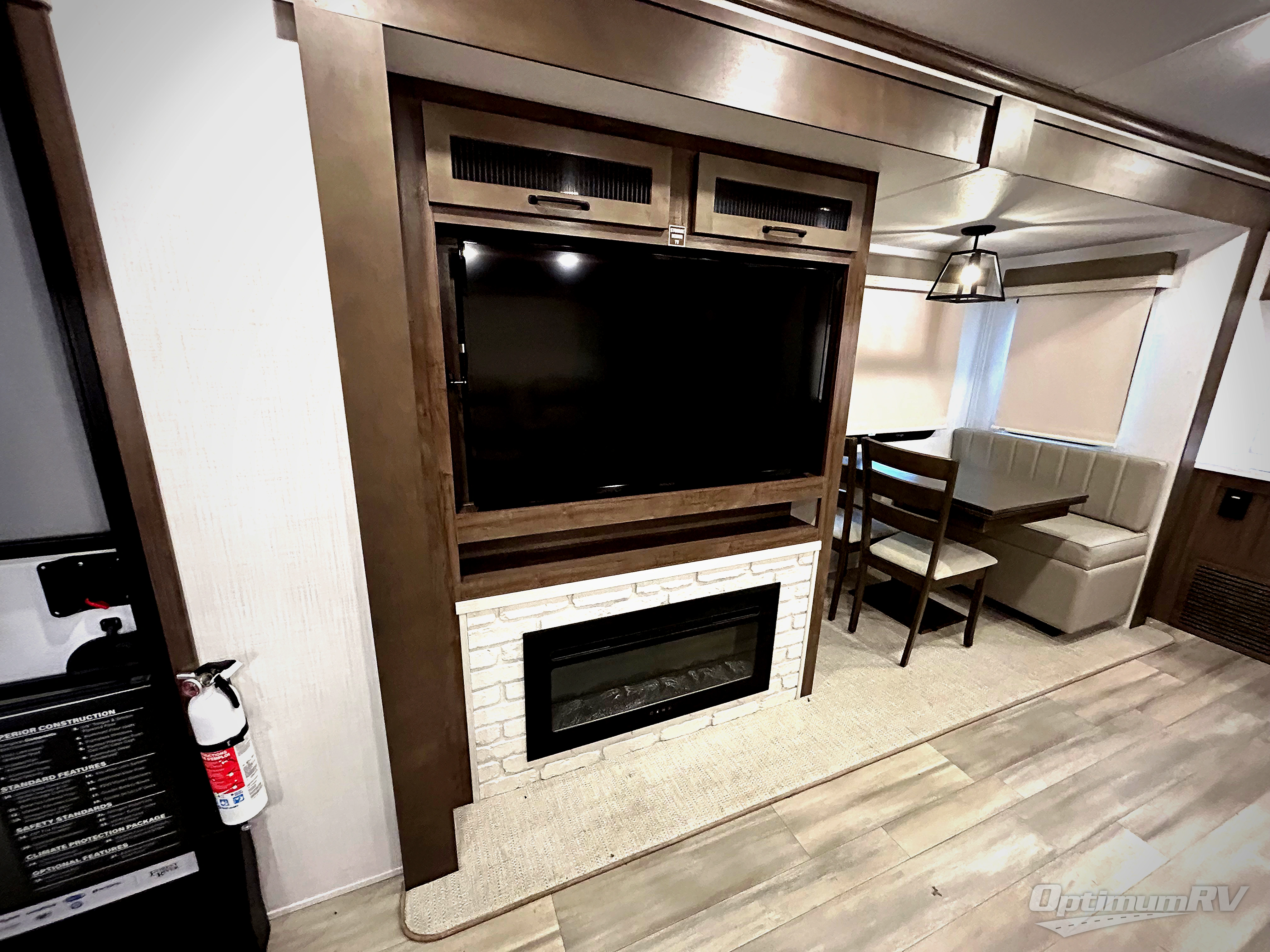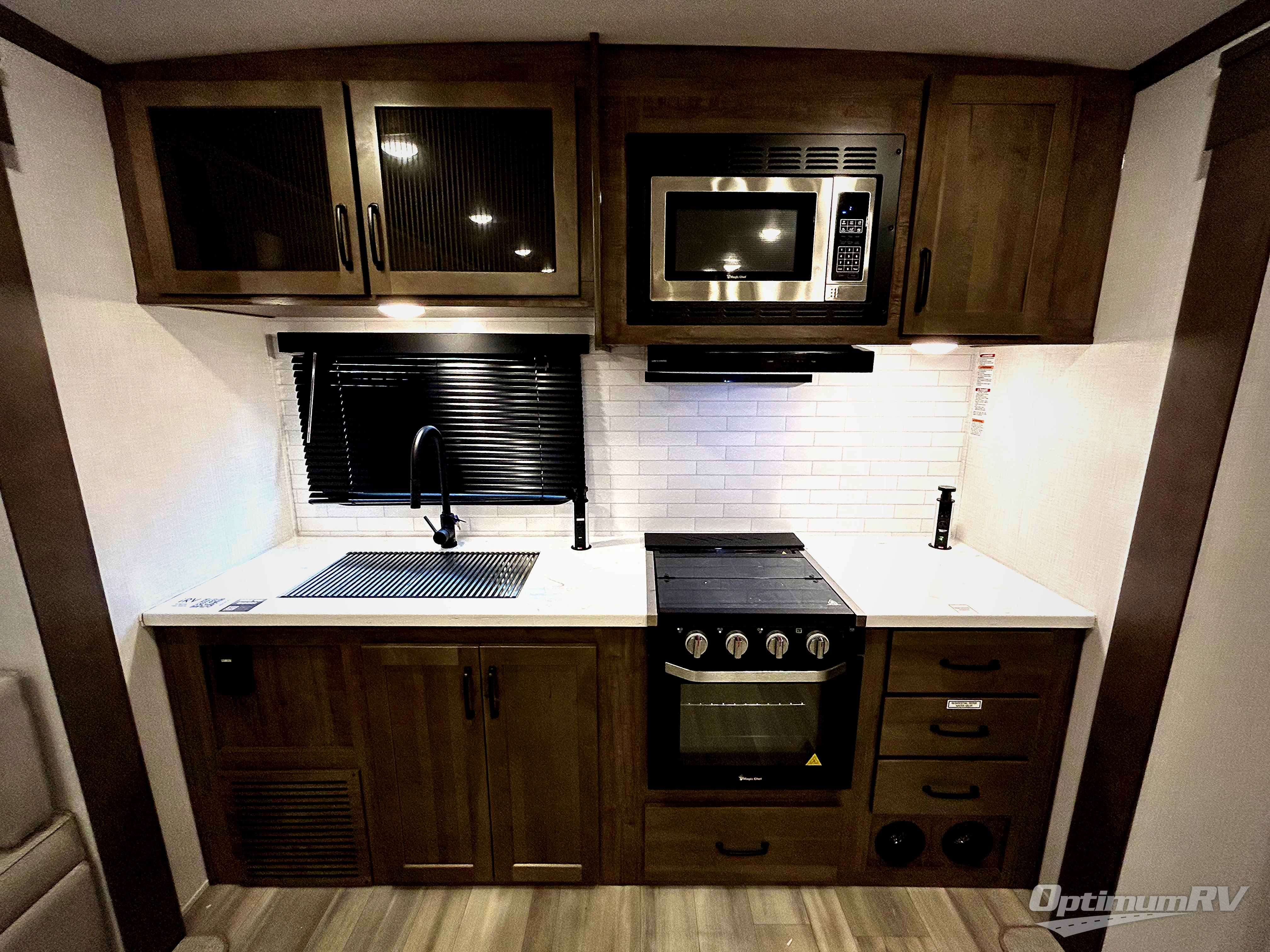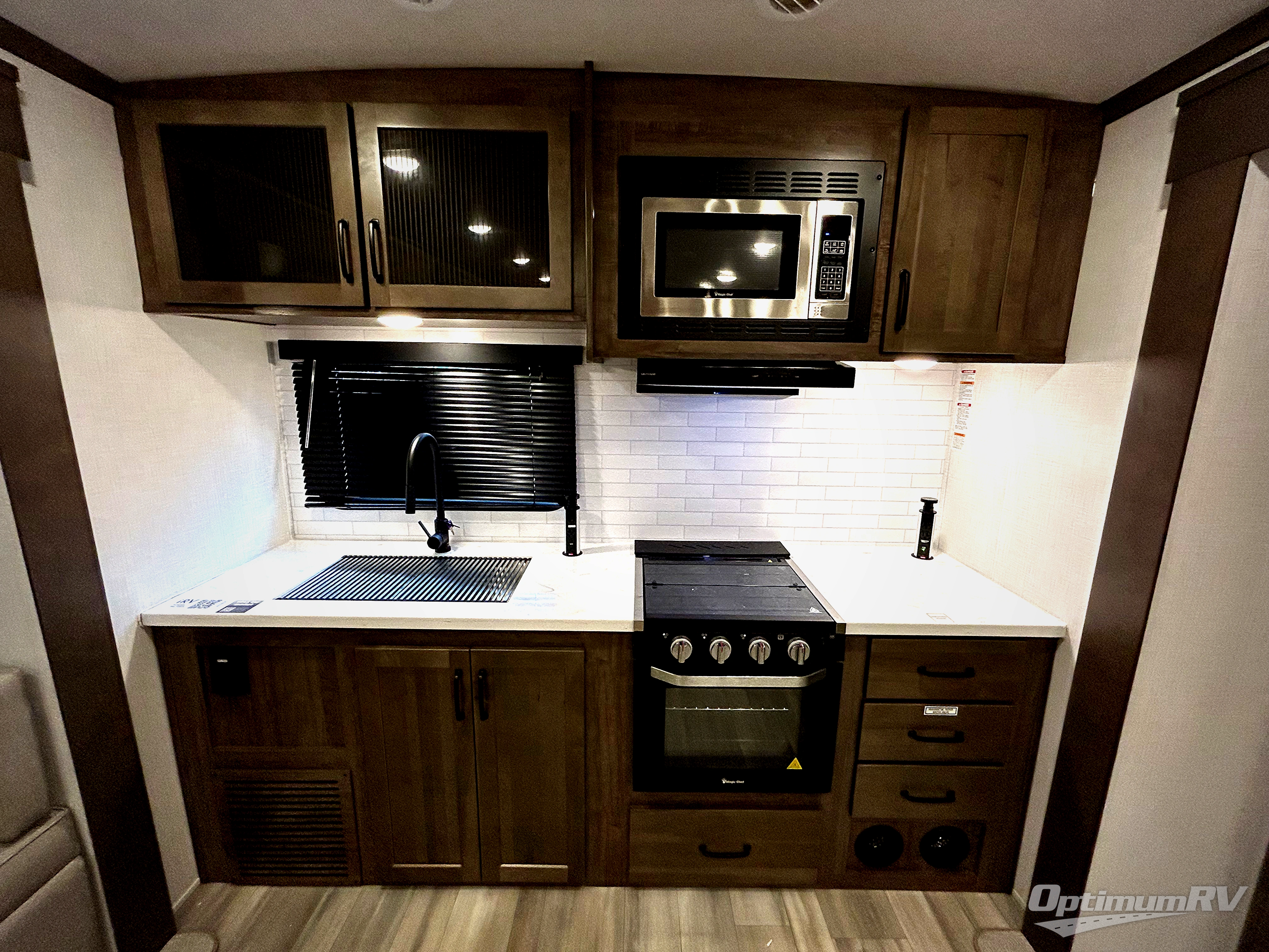 Three slides in this travel trailer provide more interior space! The rear kitchen has everything the chef will need to prepare home-cooked meals and a large pantry to store everyone's favorite snacks, or they can head to the outside kitchen and breathe in some fresh air while they cook. The 44" booth dinette is not only great for enjoying meals and playing card games, but it is also great for transforming into an extra sleeping space. You can even transform the 60" hide-a-bed sofa into a sleeping space too. The dual-entry bathroom is easy for everyone to access especially those staying in the front private bedroom. In the bedroom is a queen bed slide to lay your head at night, a dresser with an area prepped for an optional TV, and a front wardrobe with washer and dryer prep.