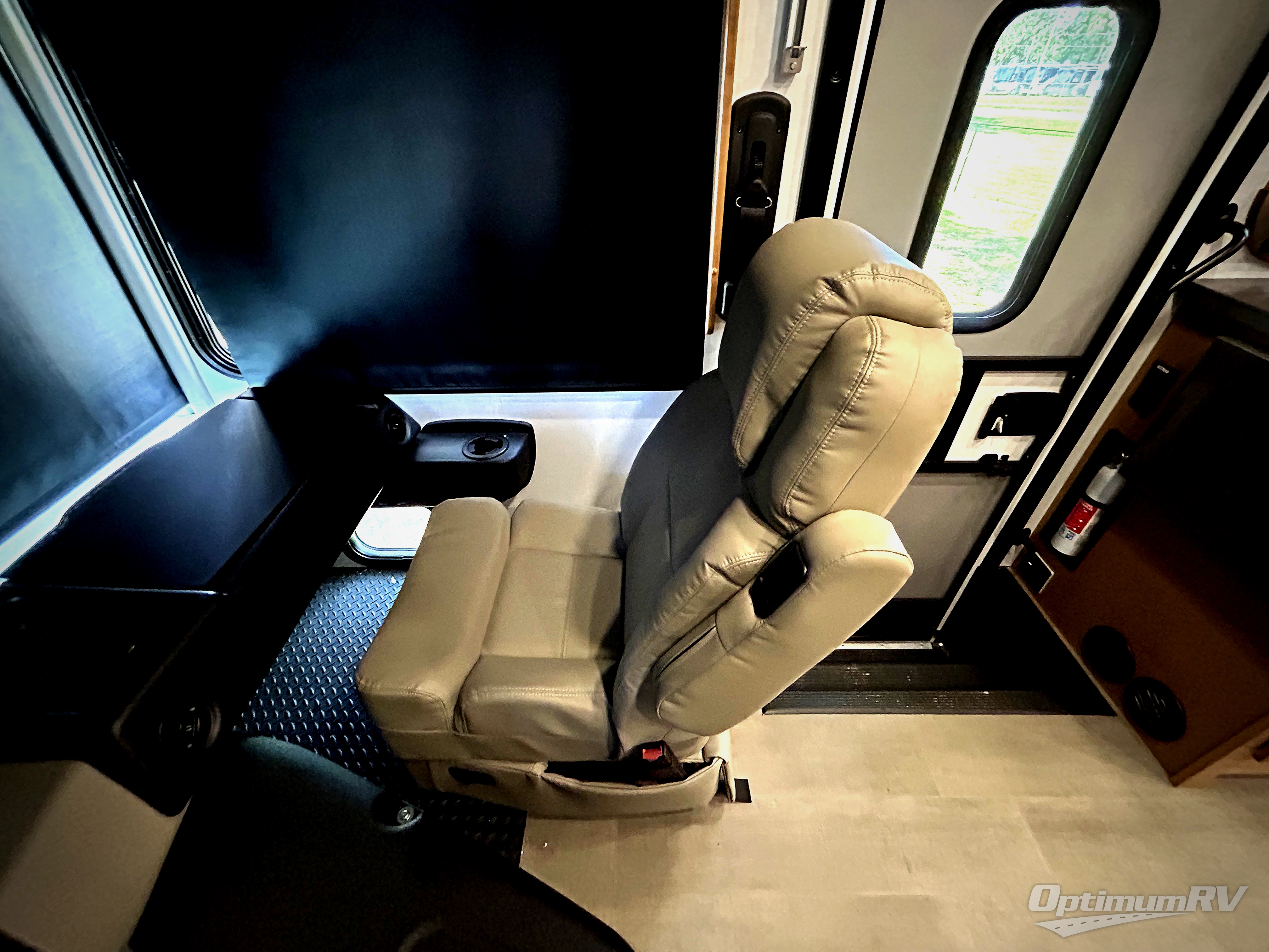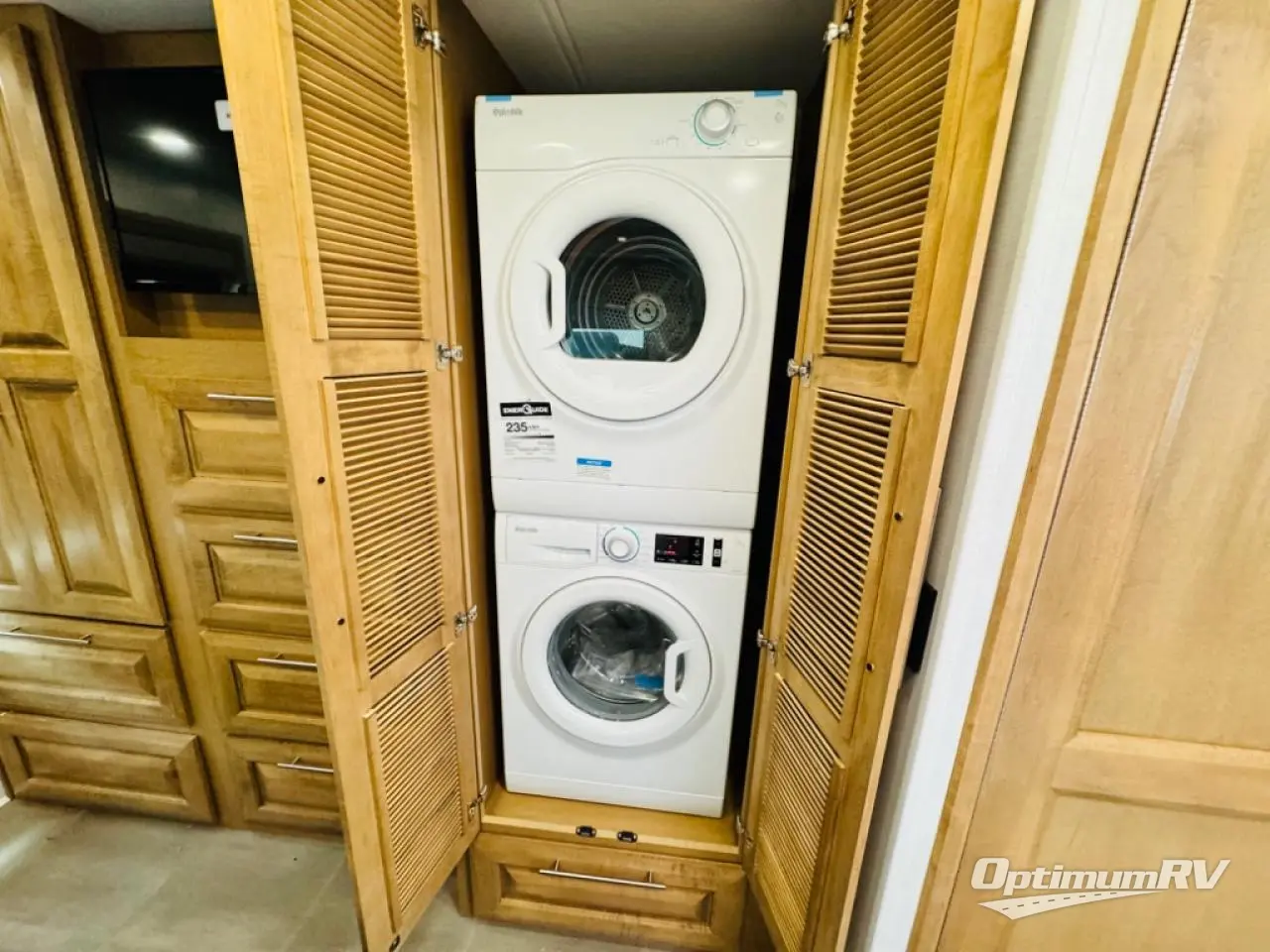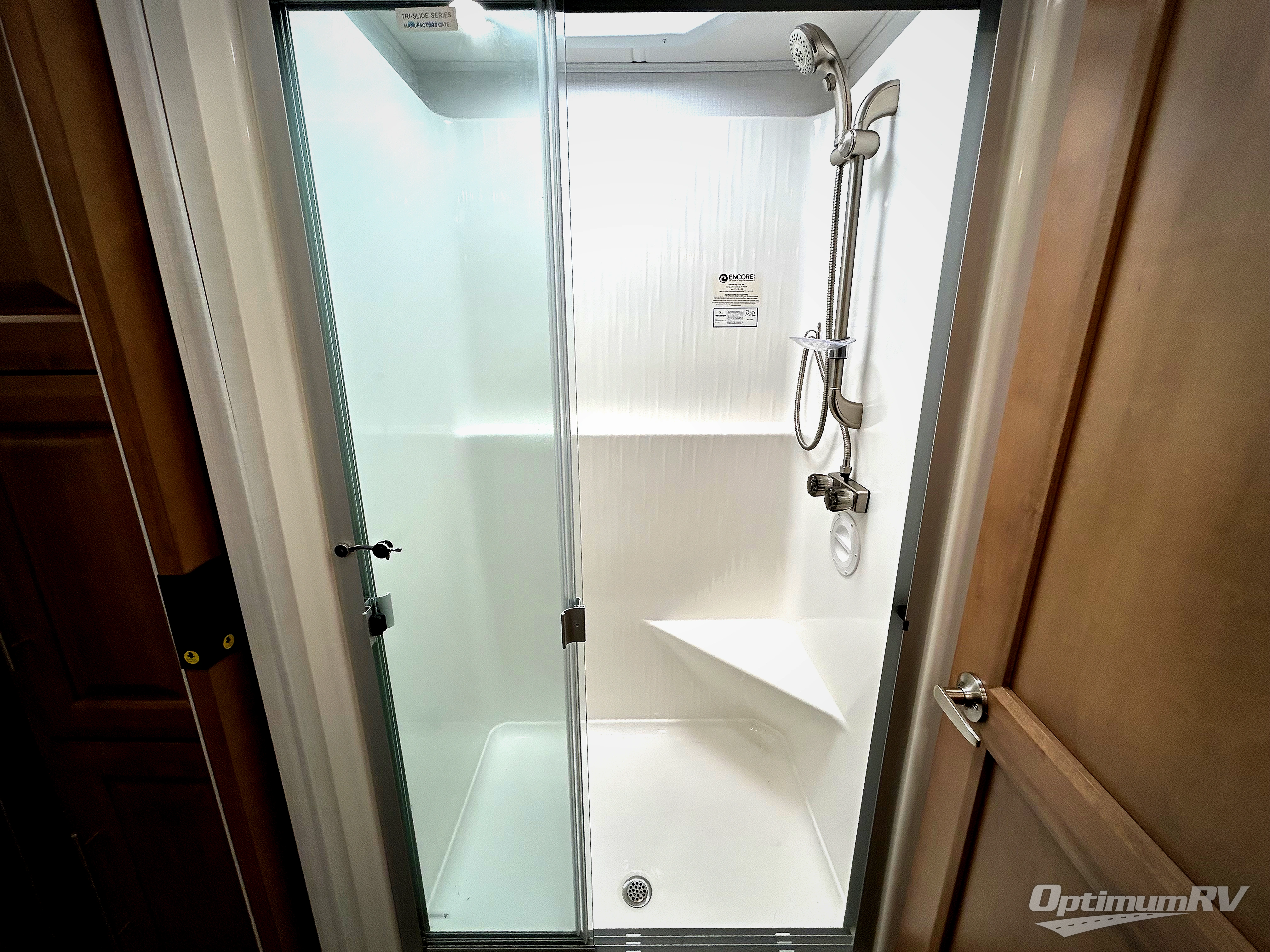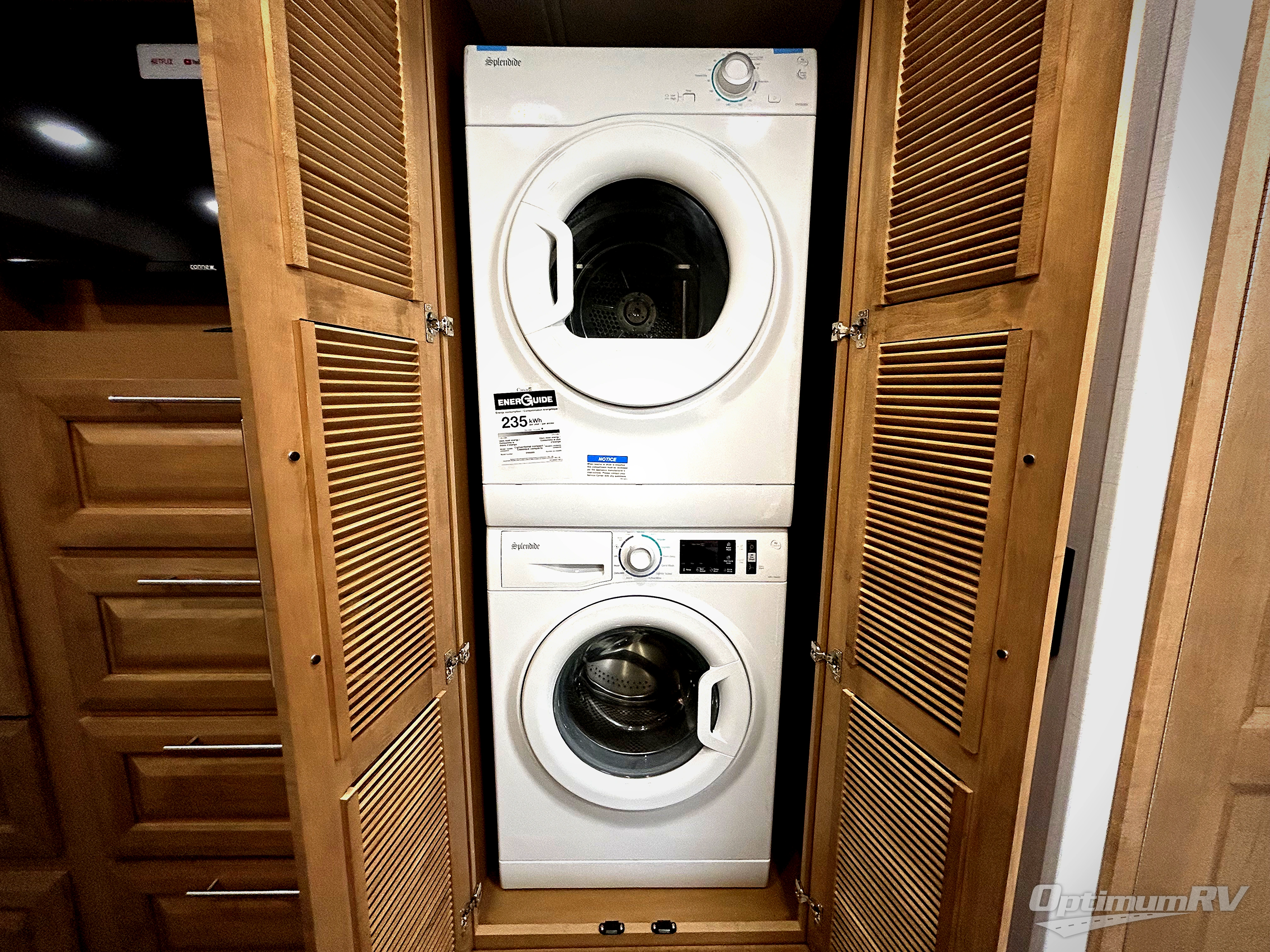 Comfort is found throughout this spacious coach for six! Once you arrive at the campground, the swivel captain's seats can become a part of the living area, and your guests can sit on the theater seating or booth dinette. The full kitchen includes a recessed three burner LP cooktop, a stainless steel microwave, plus an 18 cu. ft. three door residential refrigerator with water and ice. You will find a private sink and toilet, with the shower across the hall so two people can freshen up at once, and the rear bedroom will have you feeling at home. Here, you'll find a king bed slide out, a wardrobe, a second wardrobe with an optional washer and dryer, plus a dresser and 32" LED TV!