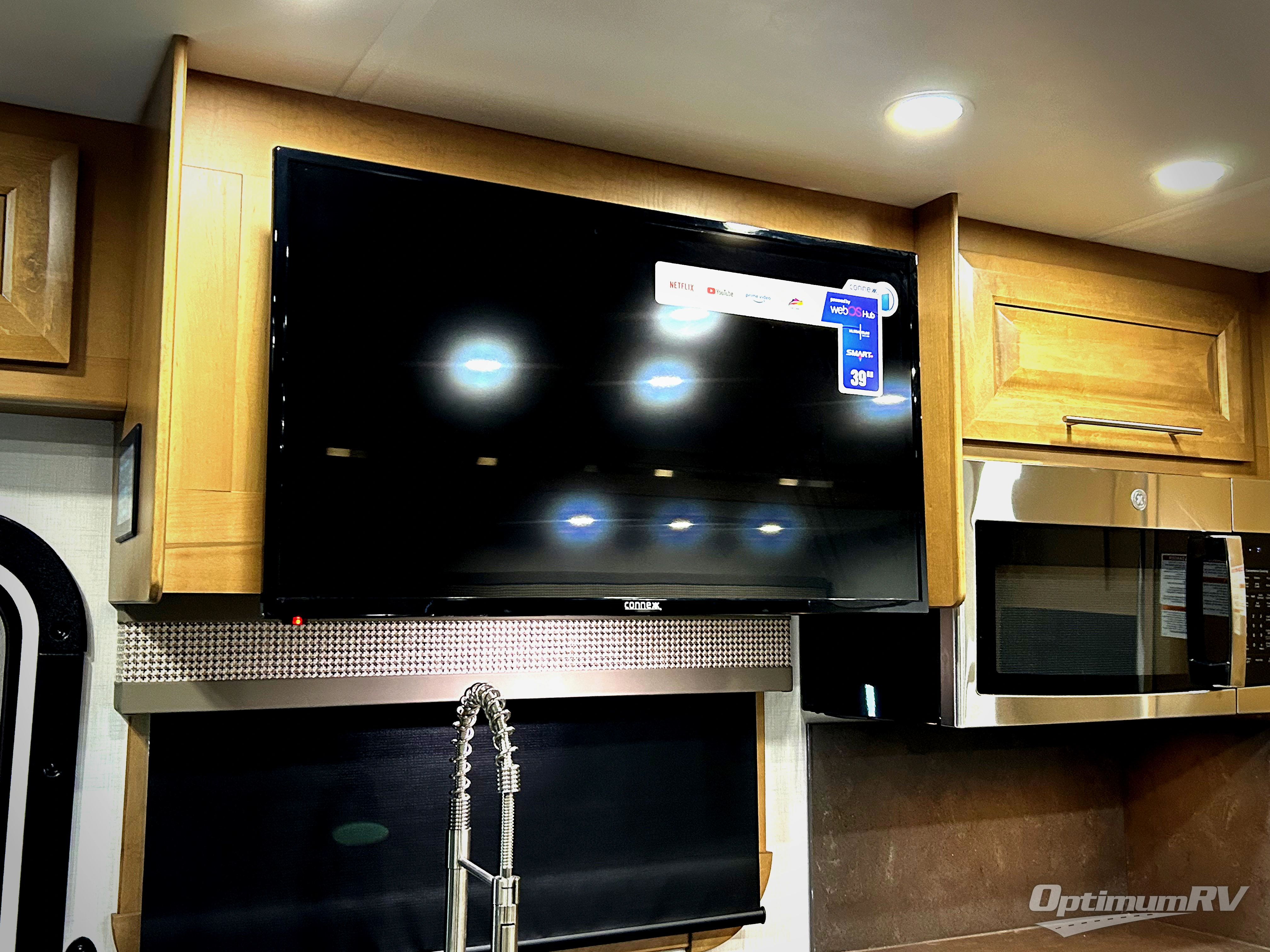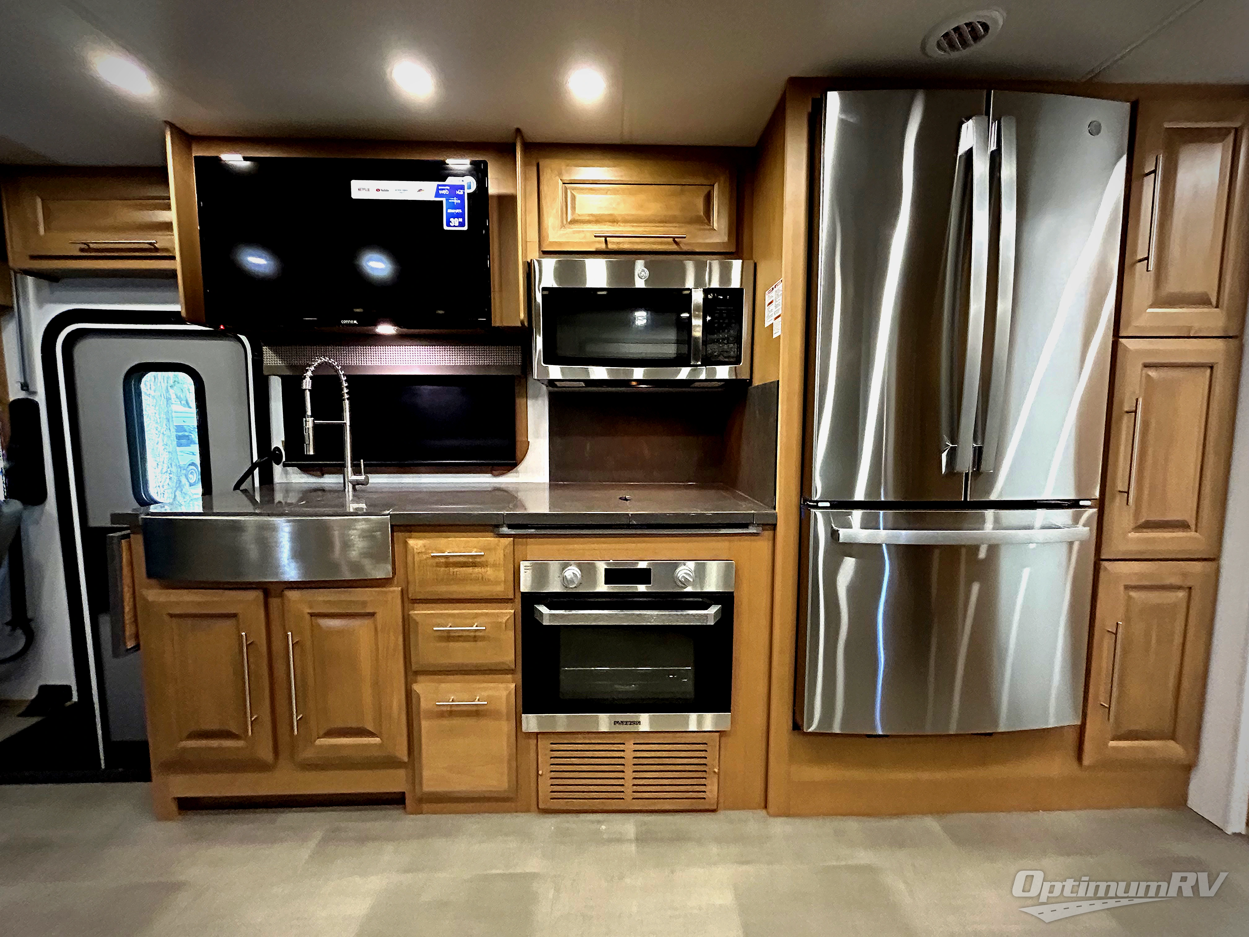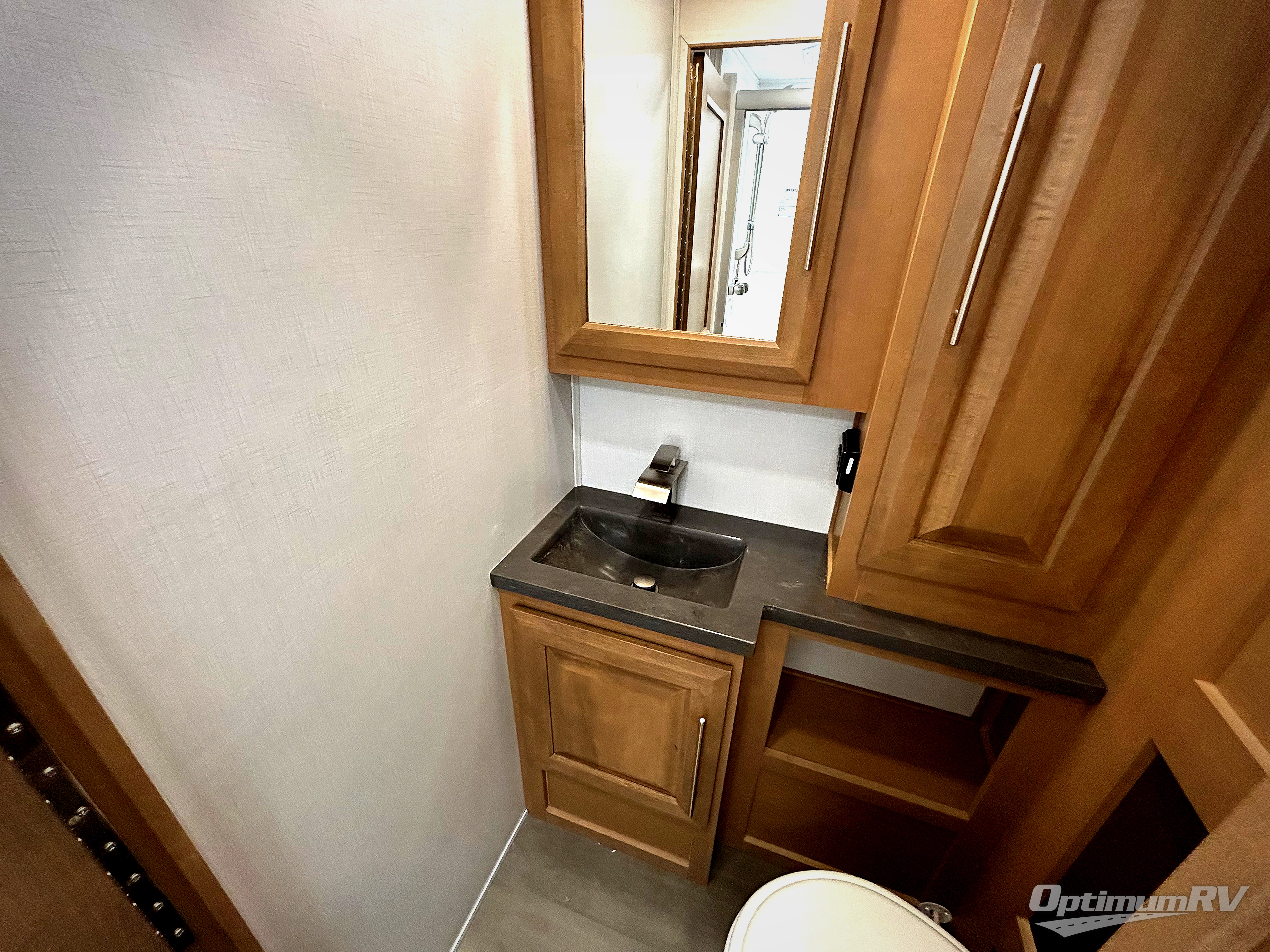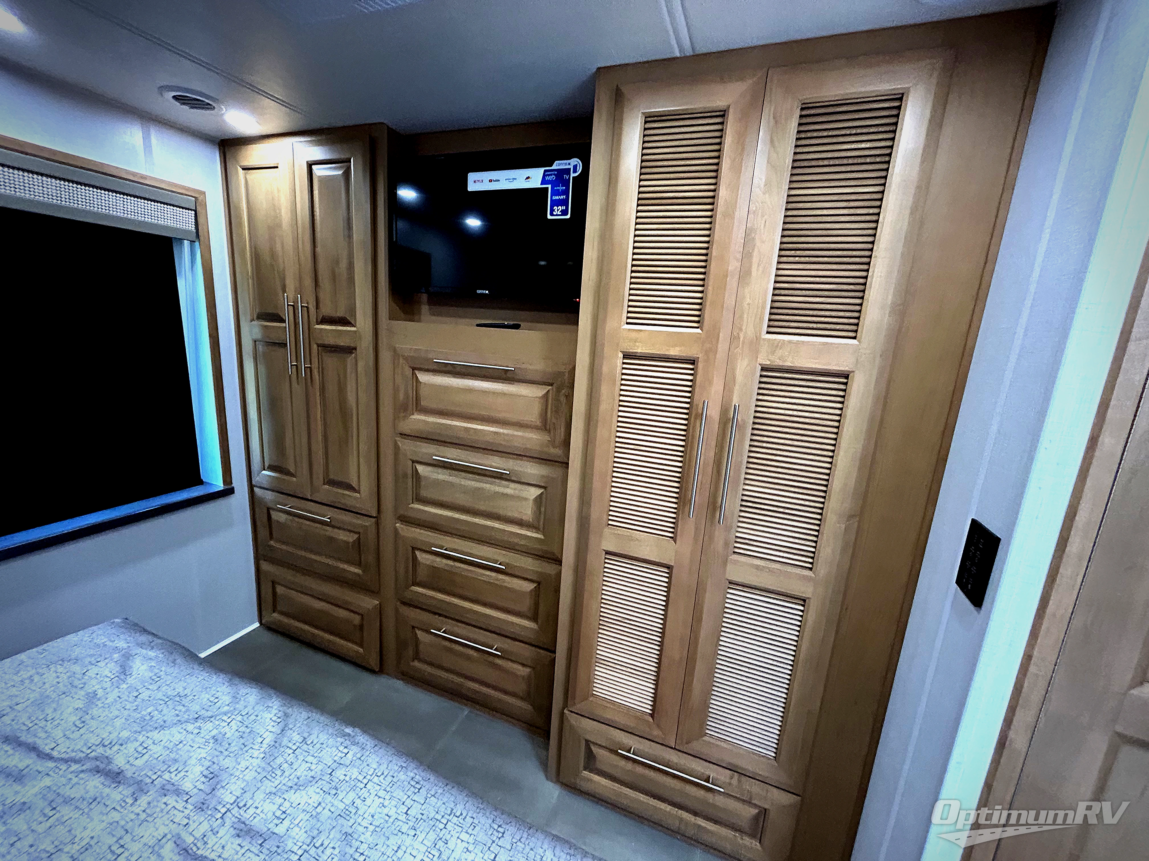 Comfort is found throughout this spacious coach for six! Once you arrive at the campground, the swivel captain's seats can become a part of the living area, and your guests can sit on the theater seating or booth dinette. The full kitchen includes a recessed three burner LP cooktop, a stainless steel microwave, plus an 18 cu. ft. three door residential refrigerator with water and ice. You will find a private sink and toilet, with the shower across the hall so two people can freshen up at once, and the rear bedroom will have you feeling at home. Here, you'll find a king bed slide out, a wardrobe, a second wardrobe with an optional washer and dryer, plus a dresser and 32" LED TV!