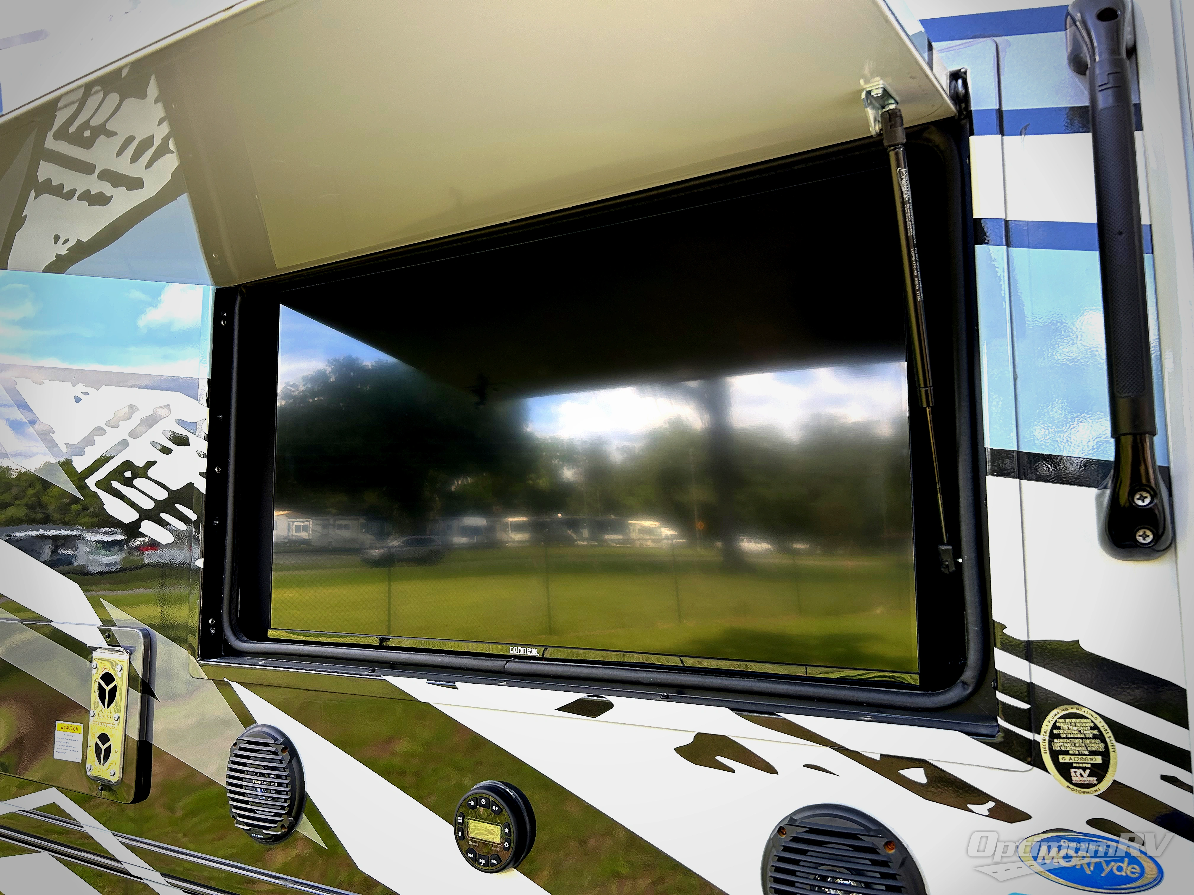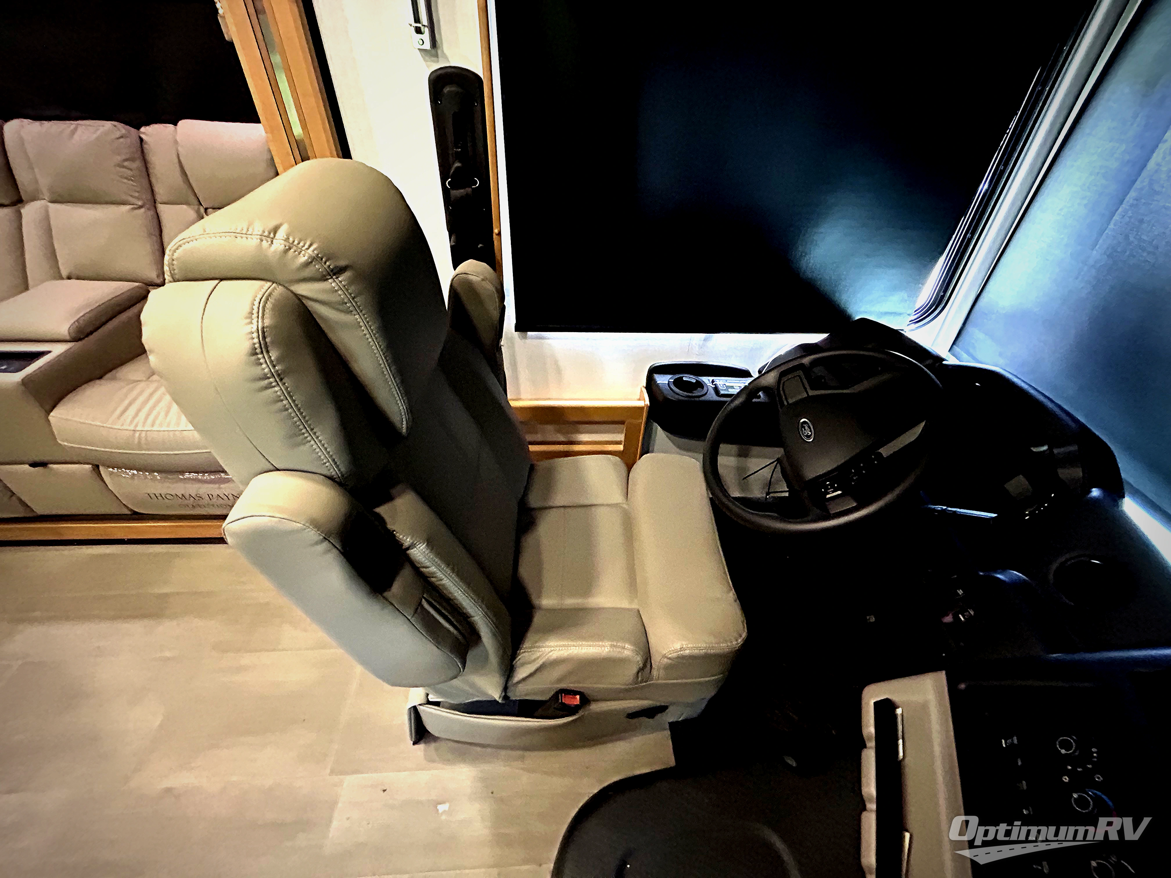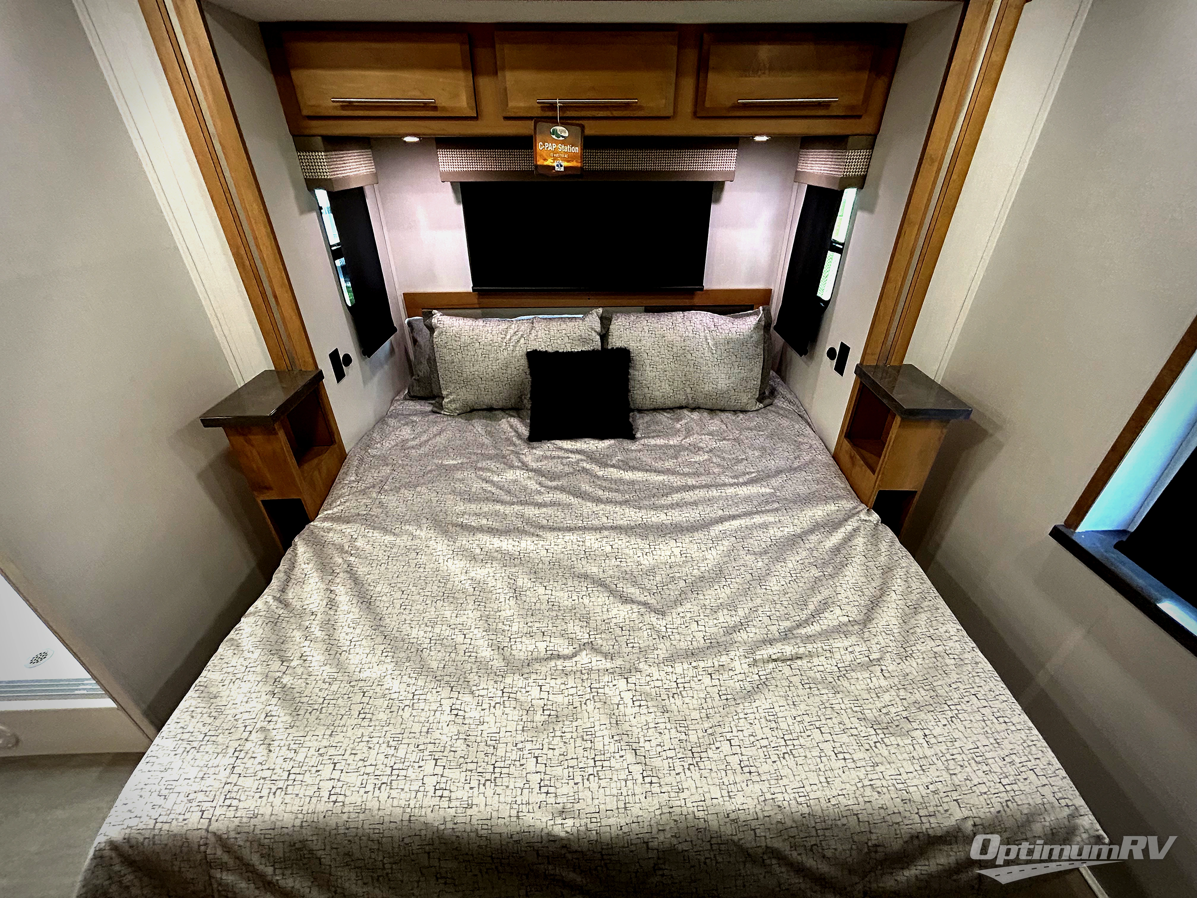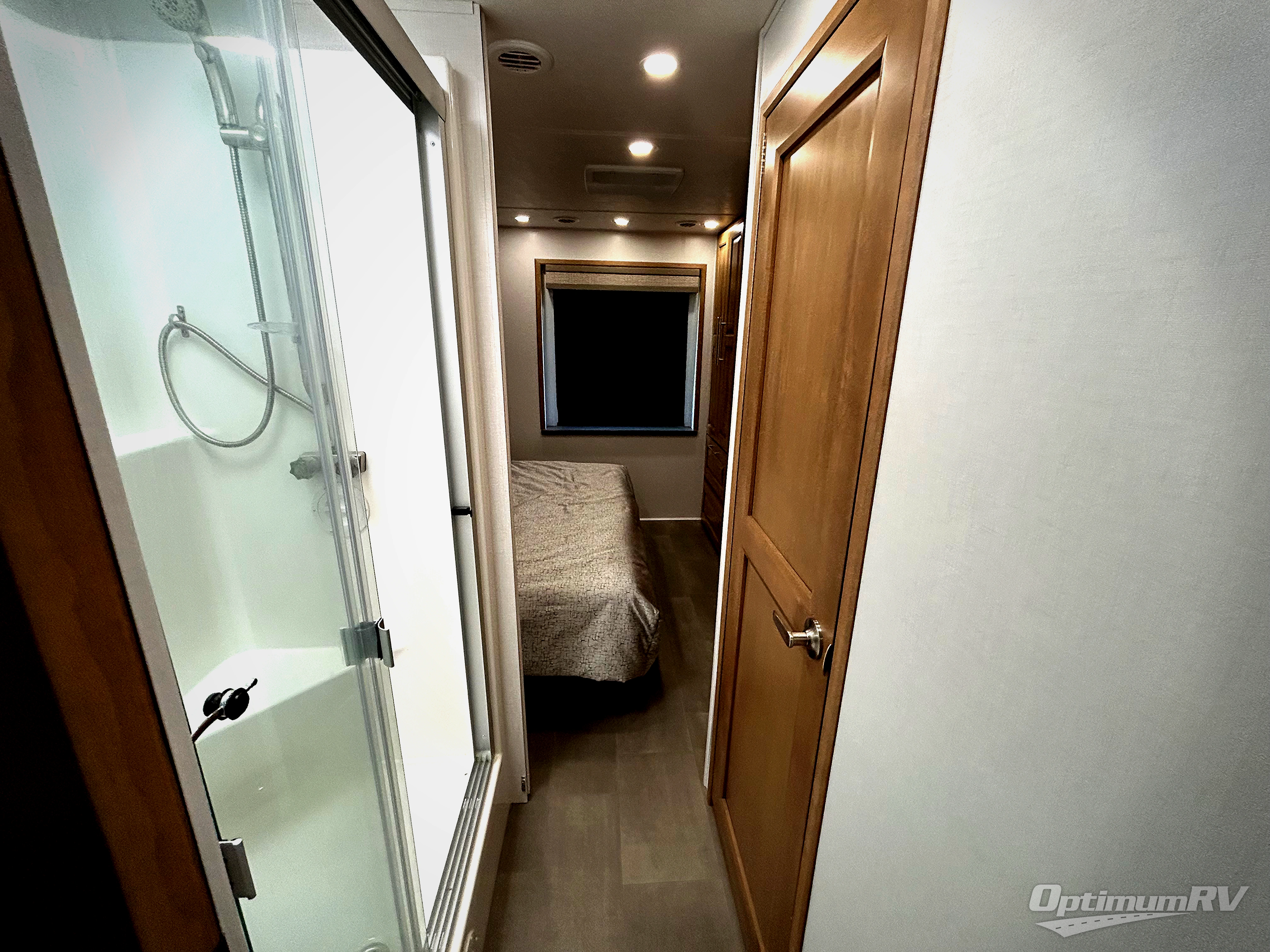 Comfort is found throughout this spacious coach for six! Once you arrive at the campground, the swivel captain's seats can become a part of the living area, and your guests can sit on the theater seating or booth dinette. The full kitchen includes a recessed three burner LP cooktop, a stainless steel microwave, plus an 18 cu. ft. three door residential refrigerator with water and ice. You will find a private sink and toilet, with the shower across the hall so two people can freshen up at once, and the rear bedroom will have you feeling at home. Here, you'll find a king bed slide out, a wardrobe, a second wardrobe with an optional washer and dryer, plus a dresser and 32" LED TV!