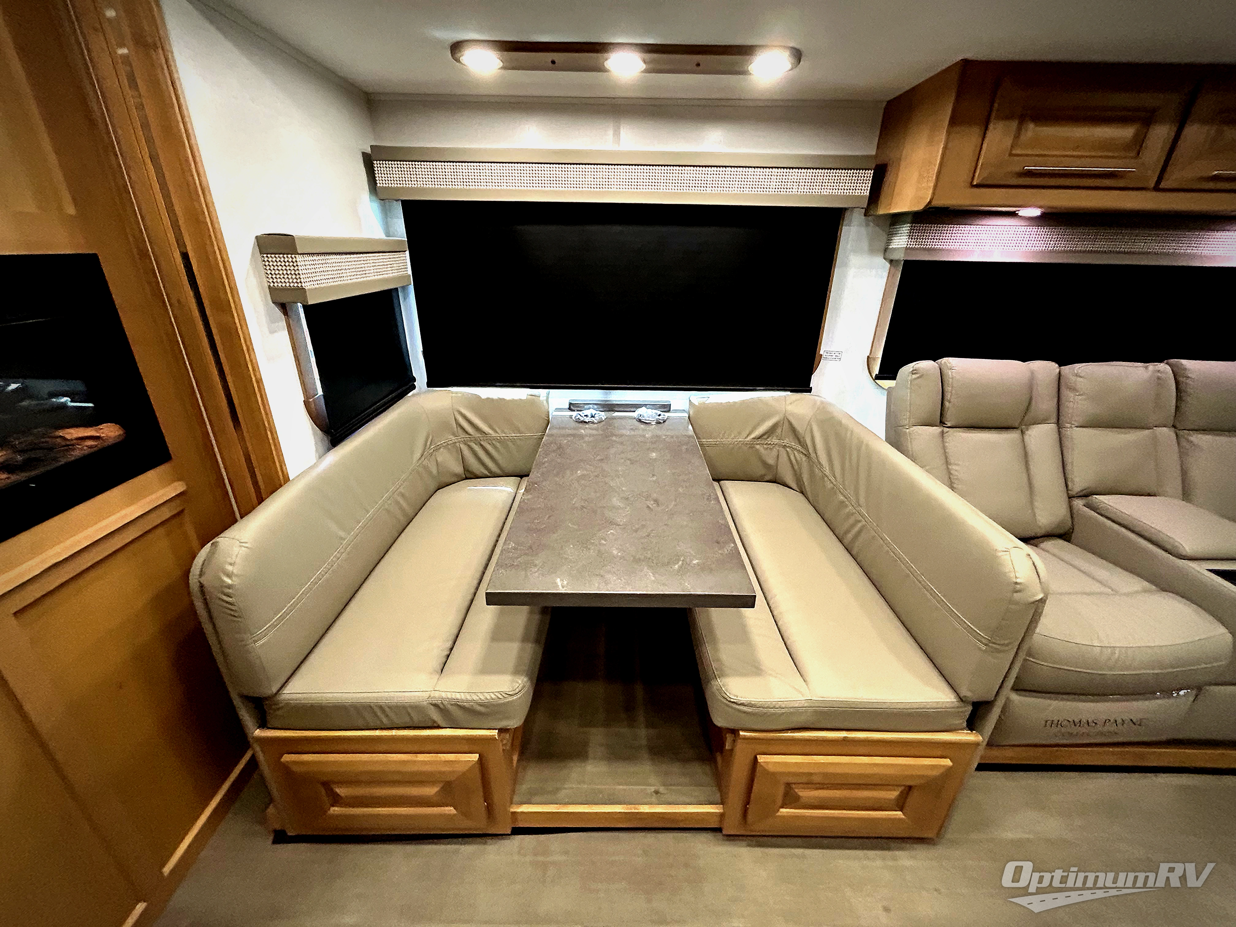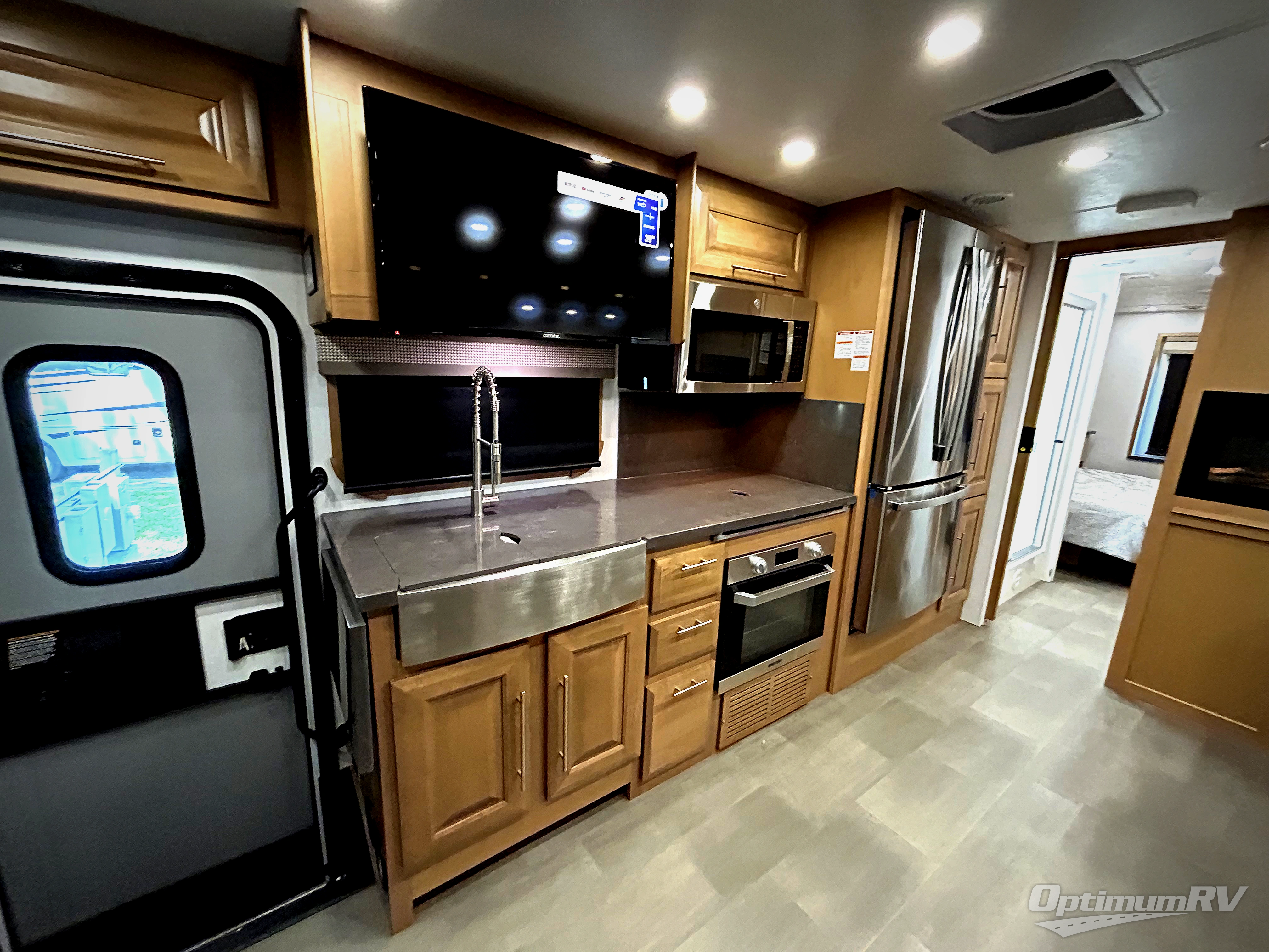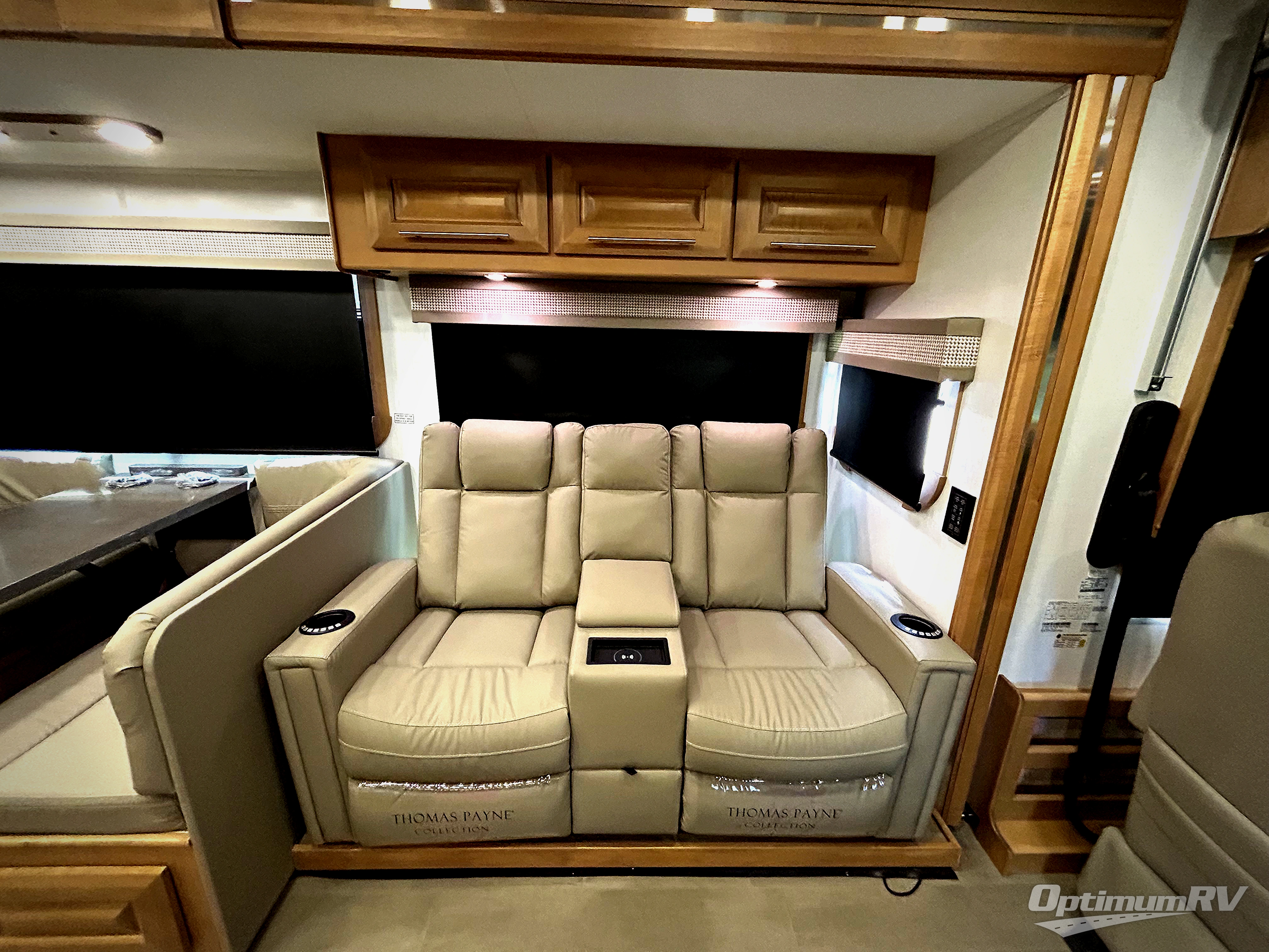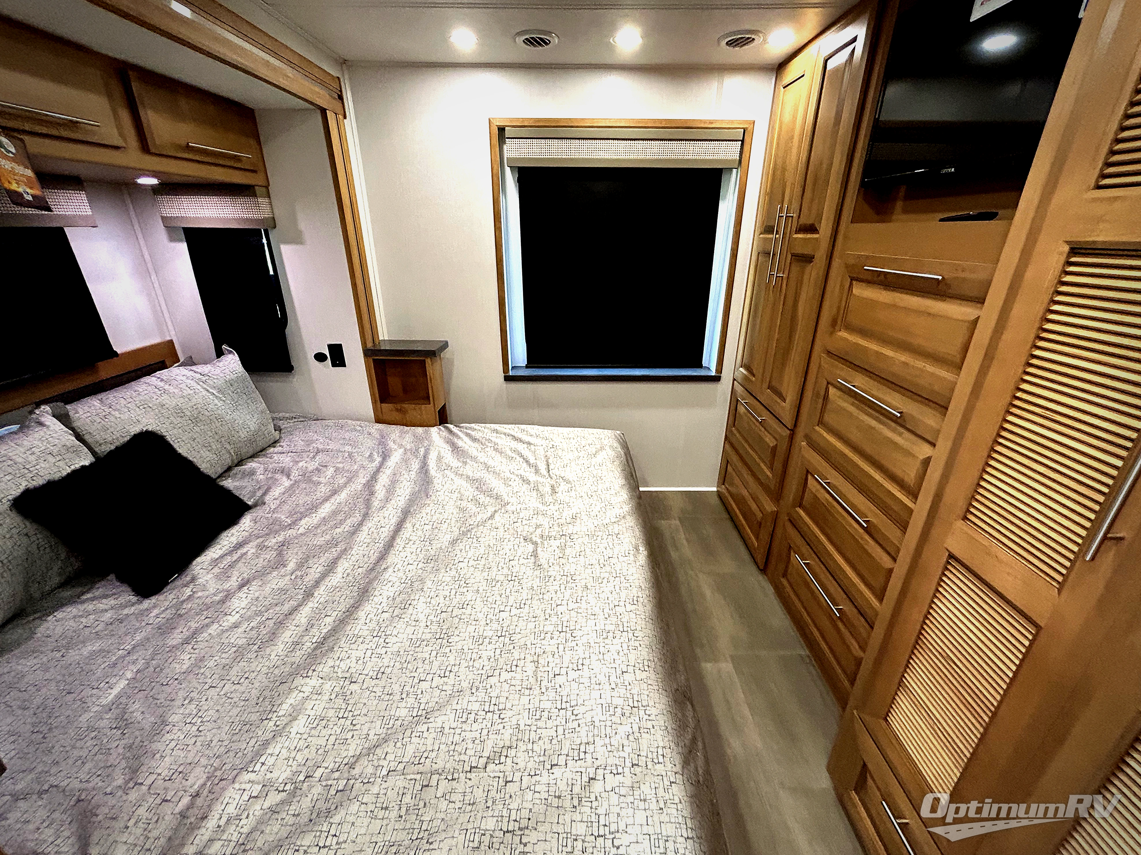 Comfort is found throughout this spacious coach for six! Once you arrive at the campground, the swivel captain's seats can become a part of the living area, and your guests can sit on the theater seating or booth dinette. The full kitchen includes a recessed three burner LP cooktop, a stainless steel microwave, plus an 18 cu. ft. three door residential refrigerator with water and ice. You will find a private sink and toilet, with the shower across the hall so two people can freshen up at once, and the rear bedroom will have you feeling at home. Here, you'll find a king bed slide out, a wardrobe, a second wardrobe with an optional washer and dryer, plus a dresser and 32" LED TV!