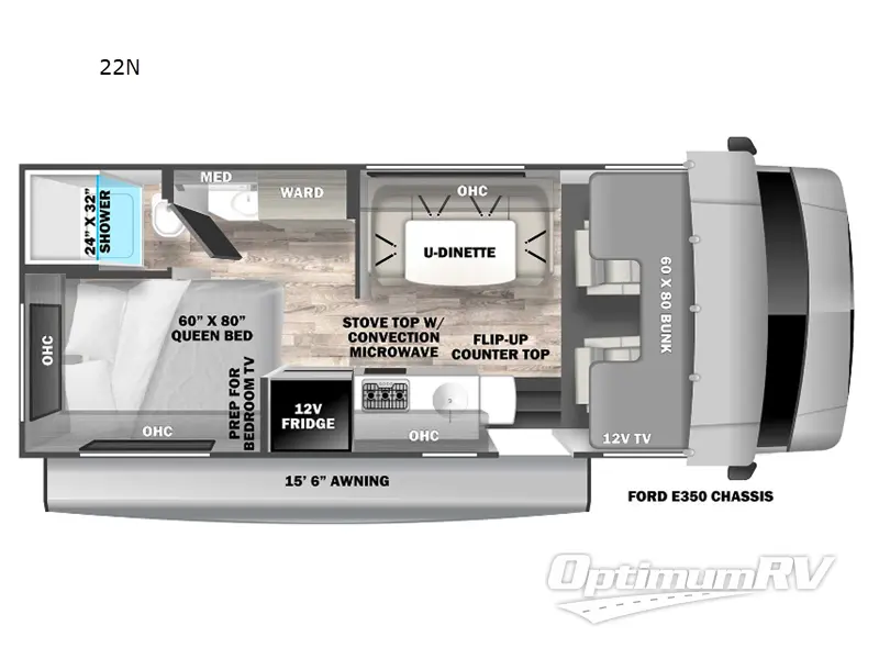 Start traveling in true luxury with this motorhome! The corner queen bed offers a comfortable night's rest, and is conveniently next to the rear corner bathroom which has a 24" x 32" shower and a vanity sink just outside it next to a wardrobe. Keep your bellies full with home cooked meals prepared with the three burner cooktop, the 10.7 cu. ft. 12V refrigerator, and use the flip-up countertop for more counter space. You can eat your meals at the U-shaped dinette and transform it into an extra sleeping space too. The 60" x 80" bunk over cab also offers a comfortable sleeping space with a 12V TV for entertainment! This model is also available with a Chevy 3500 chassis; see model 22N Chevy for more details.