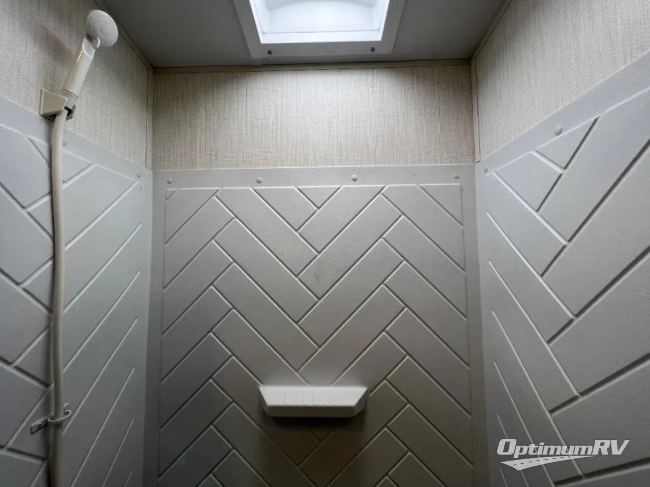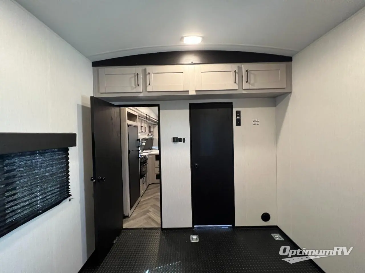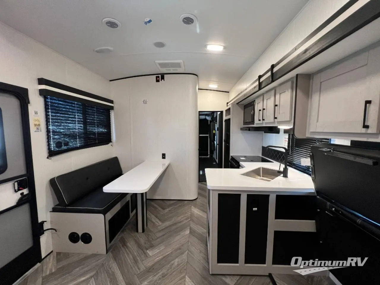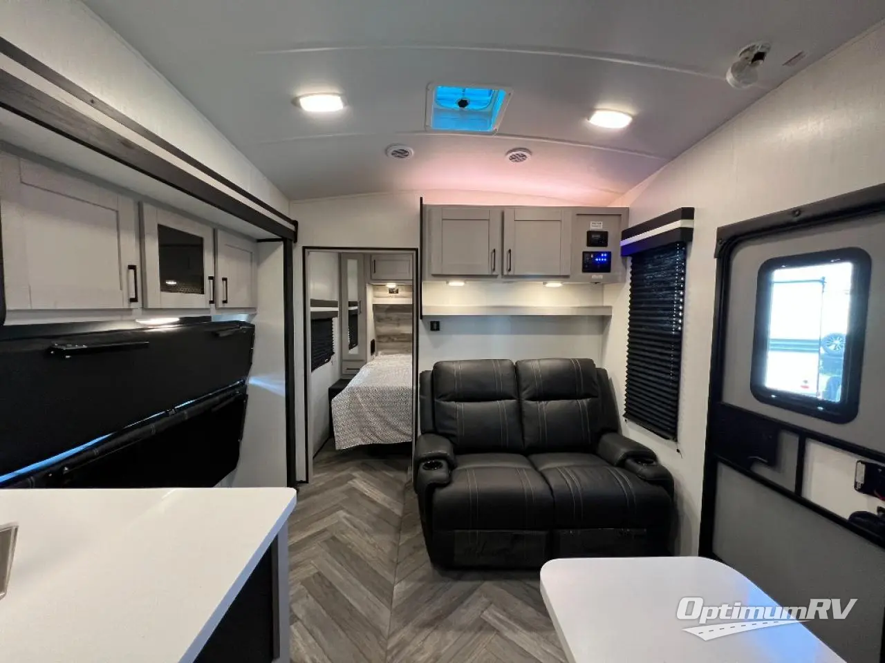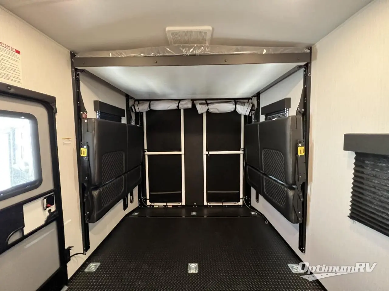 Bring the whole gang with you and your off-road toys in this toy hauler with a 13' garage area! Once your toys are unloaded, you can set up the power queen bed above the sofa with a dinette, plus there is one of the dual entry doors to the unit. You can prepare home cooked meals with the three burner cooktop and then eat them either in the garage dinette or the one sided booth dinette seating with a table across from the kitchen. After stuffing yourself full, let your stomach settle on either the sofa or the theater seating then freshen up in the dual entry bathroom with the shower that has a skylight above it for added natural lighting. Enjoy a good night's rest each night on the king bed in the front private bedroom!