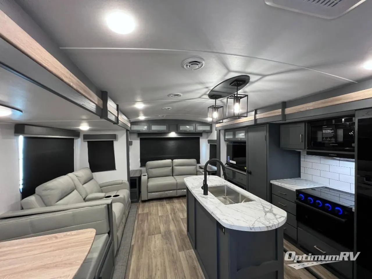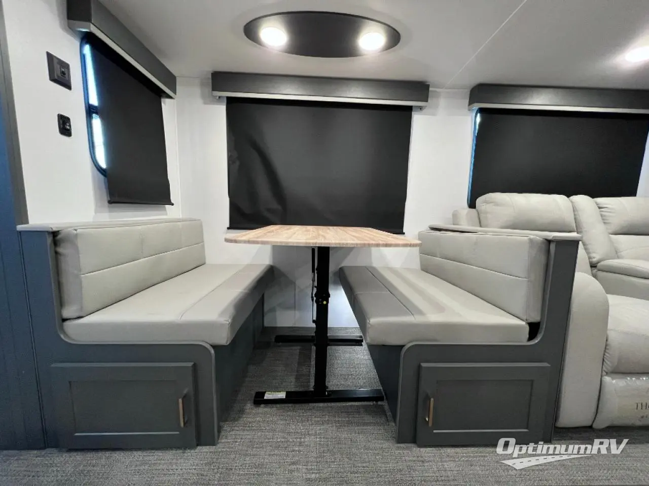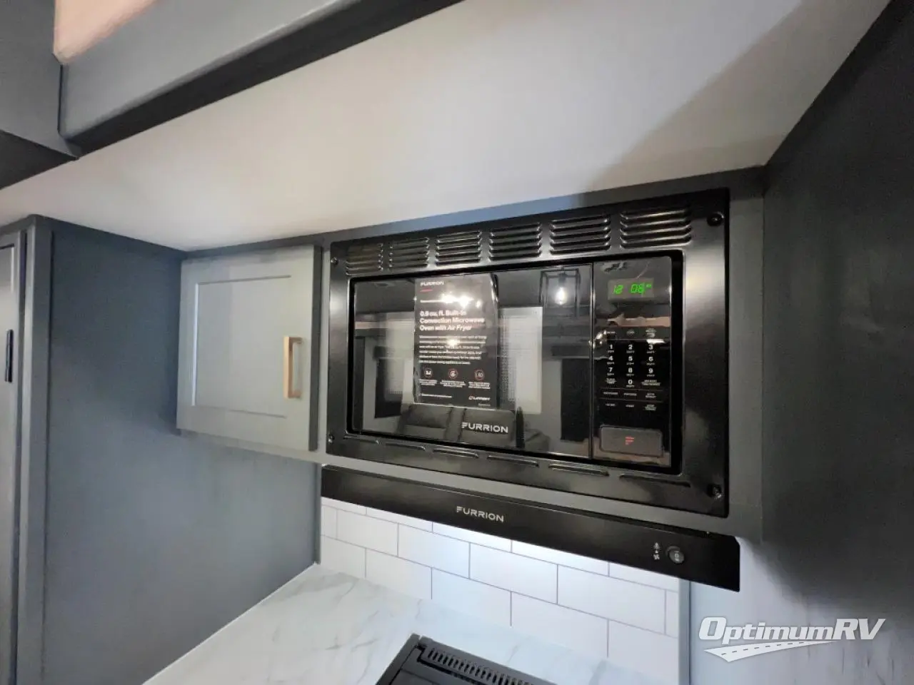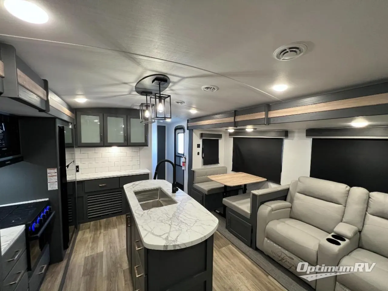There's not much about this trailer that you won't like! The rear living area will be a favorite place to hang out with its theater seats, tri-fold sofa sleeper, and TV with a soundbar. There is also a fireplace to make this area more cozy and a booth dinette where you can dine together each day. A kitchen island provide more space to set items and prep dinner, and there is a curio cabinet to showcase your nice dishes. Having a front private bedroom with a queen bed will have you feeling at home, plus there are dual nightstands, dual wardrobes, and a closet to keep your clothes wrinkle-free! And of course there is a full bath to freshen up in each day!