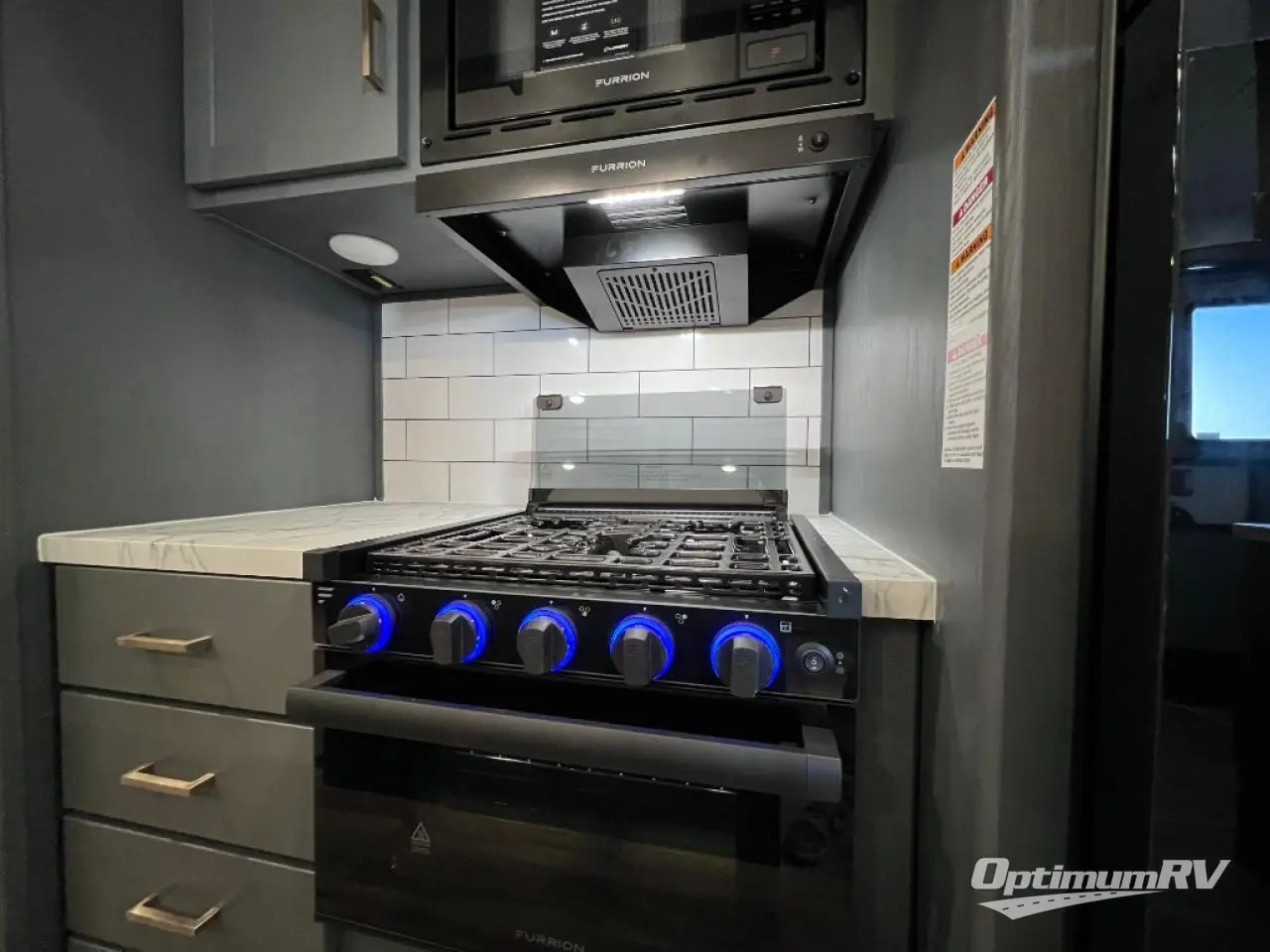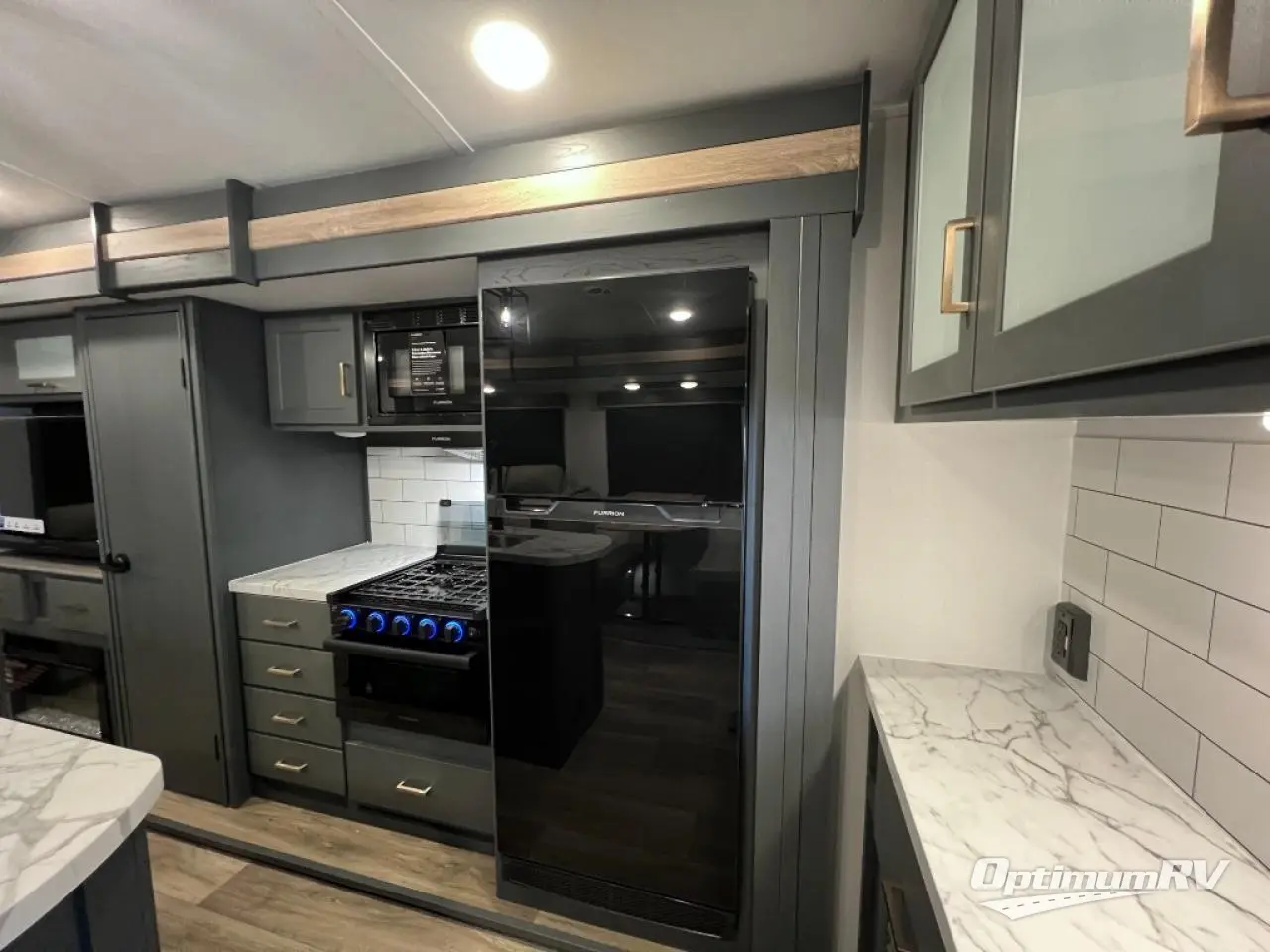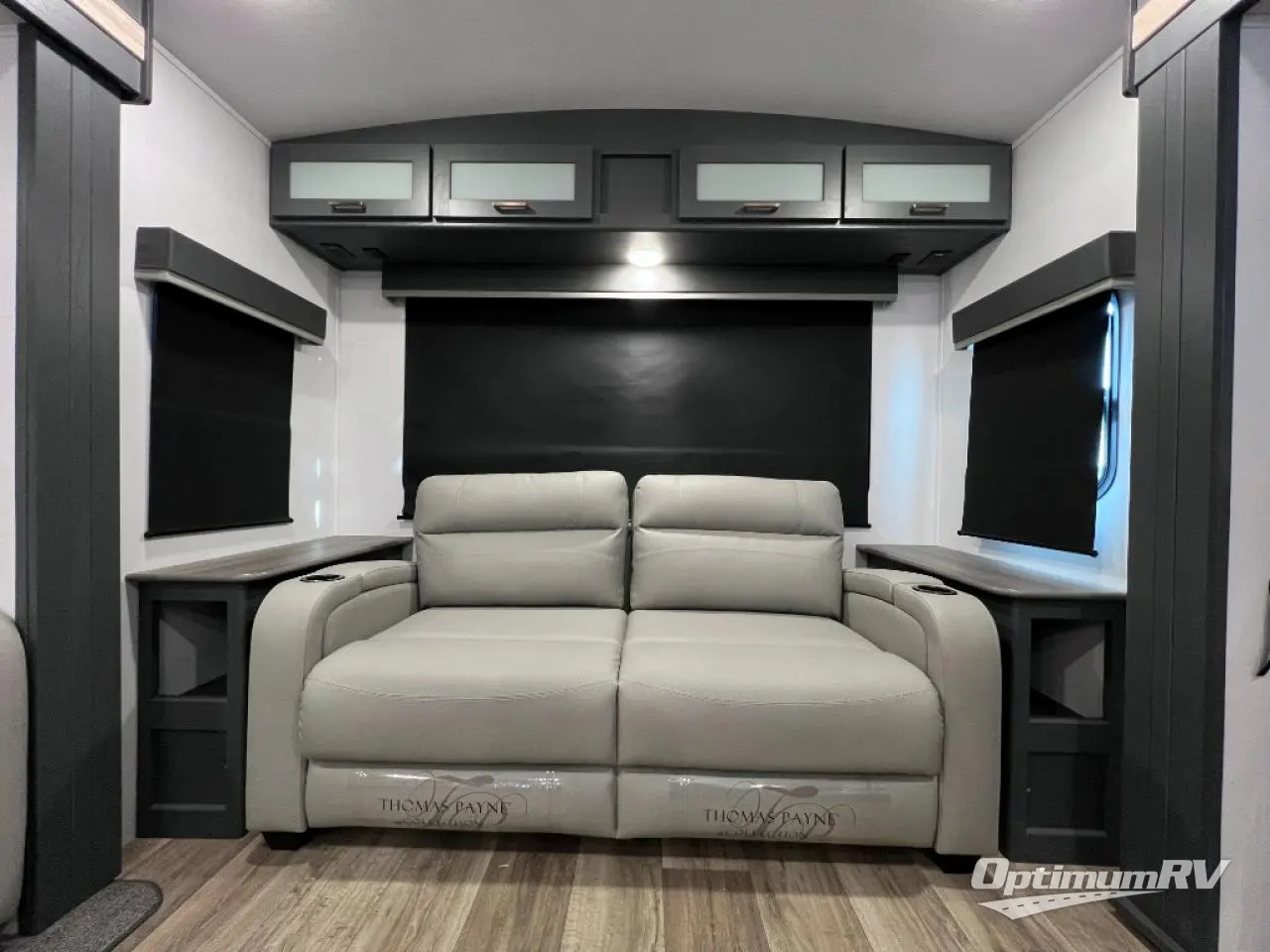There's not much about this trailer that you won't like! The rear living area will be a favorite place to hang out with its theater seats, tri-fold sofa sleeper, and TV with a soundbar. There is also a fireplace to make this area more cozy and a booth dinette where you can dine together each day. A kitchen island provide more space to set items and prep dinner, and there is a curio cabinet to showcase your nice dishes. Having a front private bedroom with a queen bed will have you feeling at home, plus there are dual nightstands, dual wardrobes, and a closet to keep your clothes wrinkle-free! And of course there is a full bath to freshen up in each day!