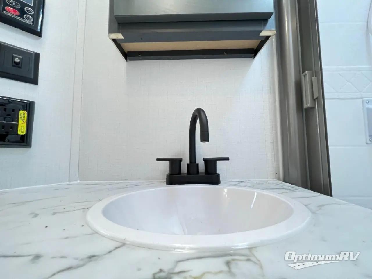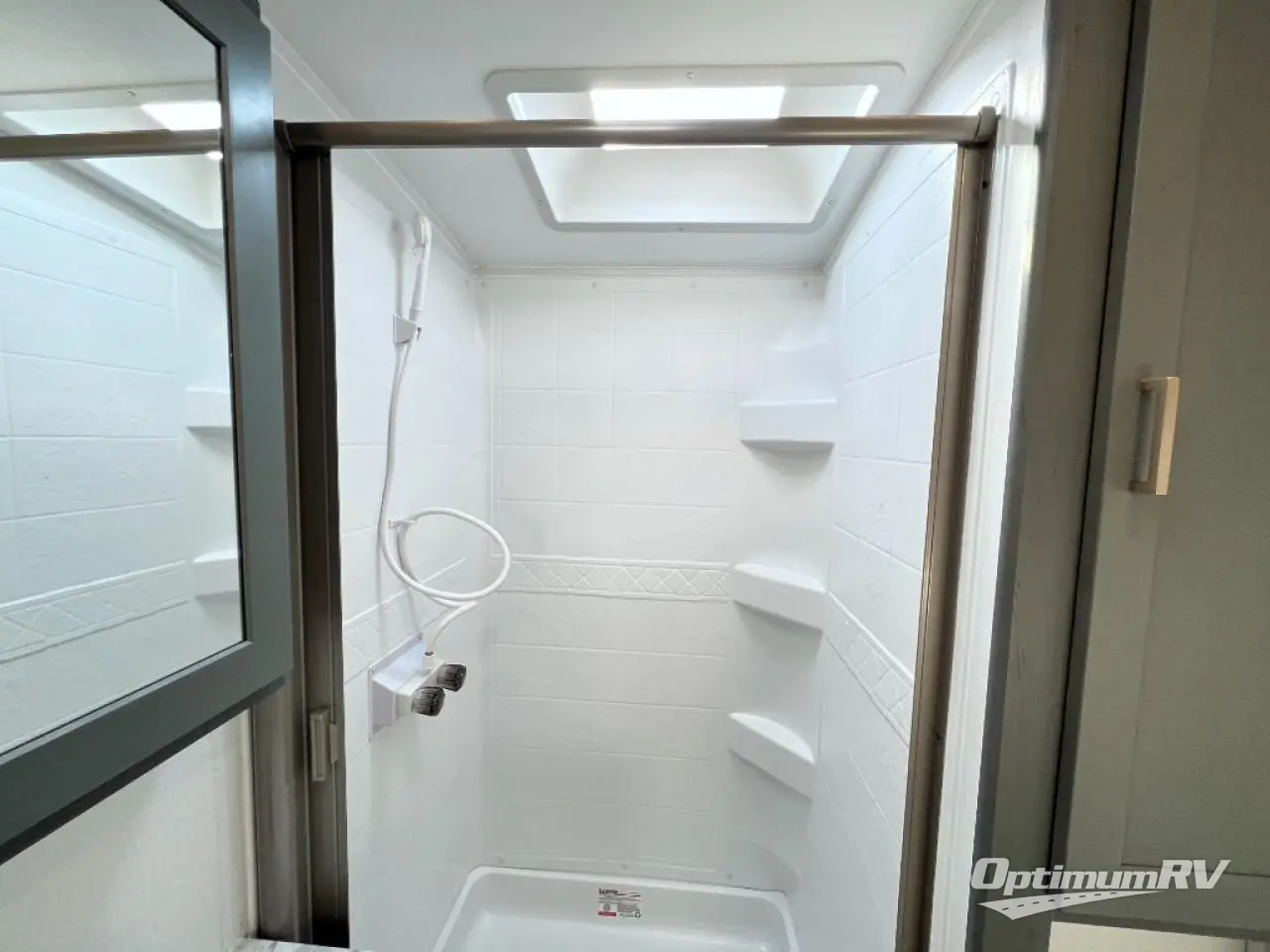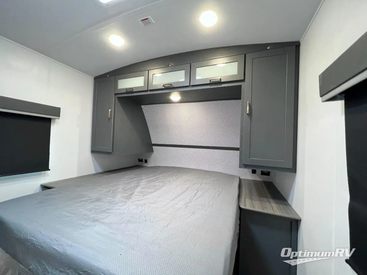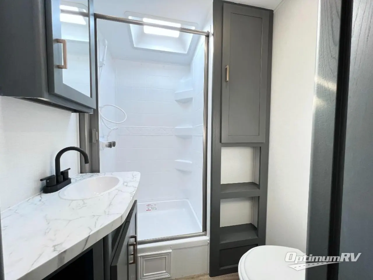 There's not much about this trailer that you won't like! The rear living area will be a favorite place to hang out with its theater seats, tri-fold sofa sleeper, and TV with a soundbar. There is also a fireplace to make this area more cozy and a booth dinette where you can dine together each day. A kitchen island provide more space to set items and prep dinner, and there is a curio cabinet to showcase your nice dishes. Having a front private bedroom with a queen bed will have you feeling at home, plus there are dual nightstands, dual wardrobes, and a closet to keep your clothes wrinkle-free! And of course there is a full bath to freshen up in each day!