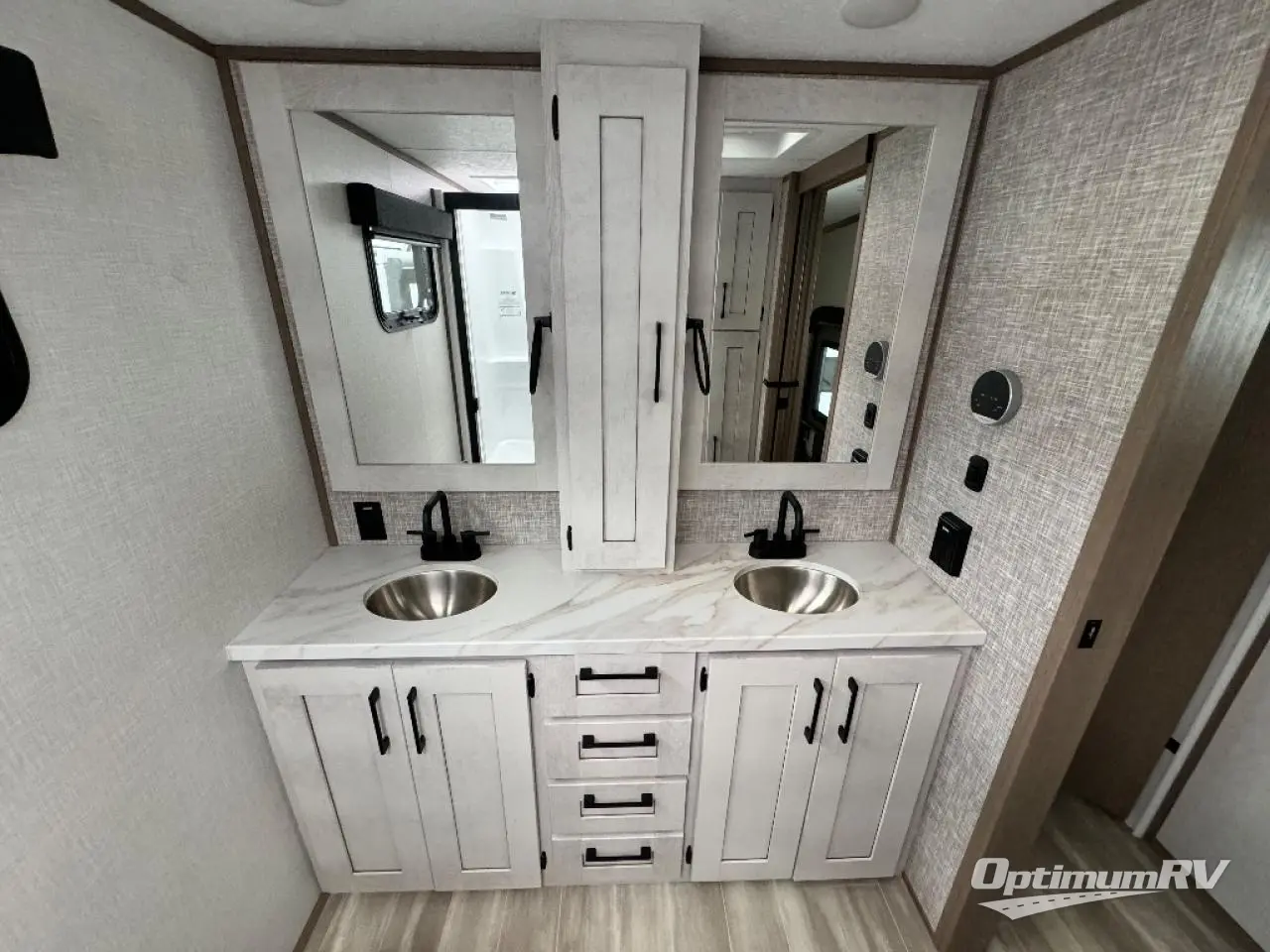 Don't pass up your chance to camp in true luxury with this fifth wheel! There is a kitchen island with two bar stools for others to help prepare dinner which can be either cooked on the four burner range or inside the 24" oven. The hutch can store your dishes and the large pantry can store your favorite snacks/canned goods. After a fun day at the beach, rinse the sand out in the 48" x 30" residential shower with a seat in the full bathroom, plus it has a dual sink vanity for two to get ready at once in the morning. When it's time to relax either lay down on the king bed slide in the front private bedroom or head to the rear living area where you can lay on the hide-a-bed sofa or sit in the theater seating with USB charging. There is also an entertainment center with a 40" fireplace and 43" smart LED TV to watch a movie!