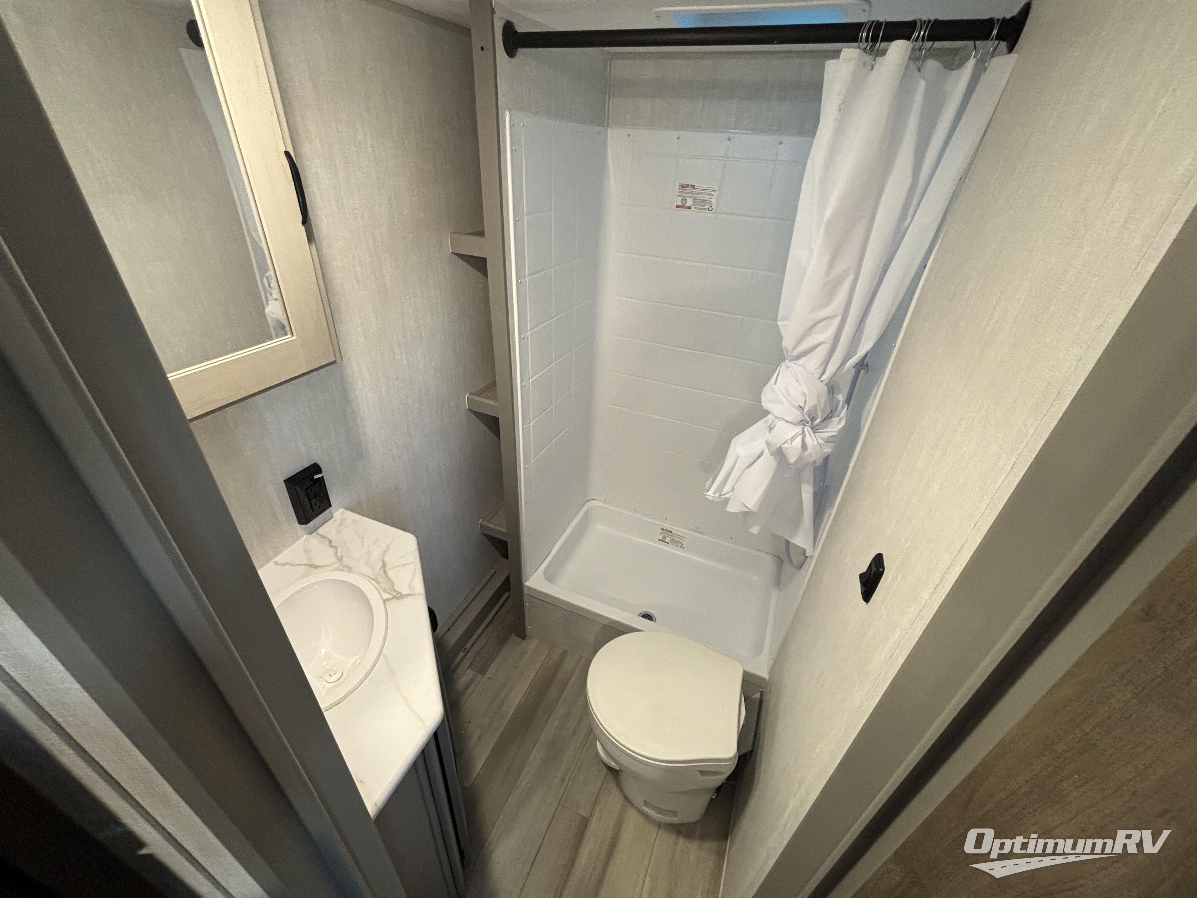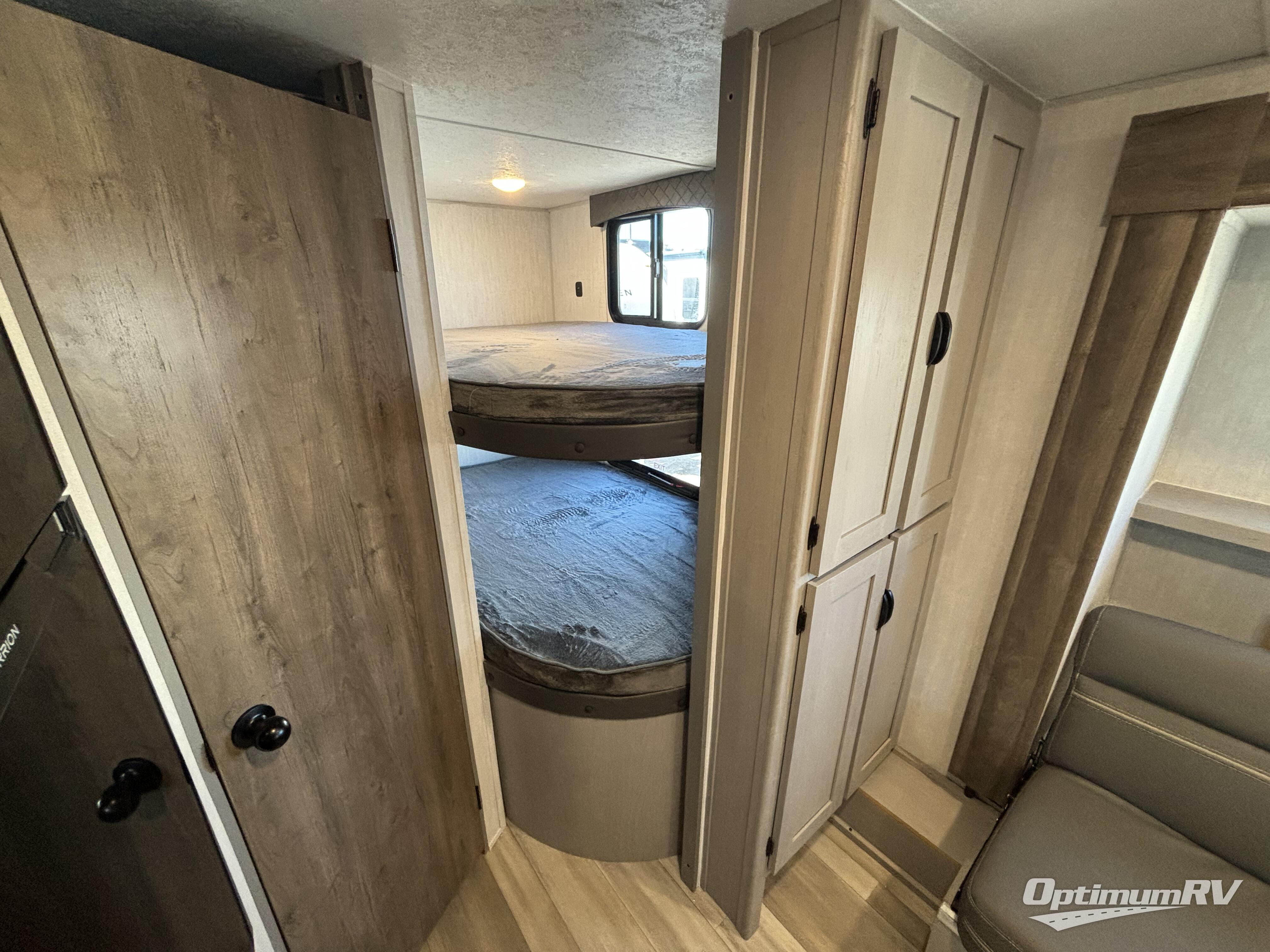 This trailer easily sleeps a family of eight and provides plenty of seating thanks to the versatile space saving Murphy wall-bed behind the U-dinette. During the day, the U-dinette provides seating for the whole gang. At night, move the table and cushions and flip down a comfortable 54" x 74" bed. There is a jackknife sofa slide, and opposite you will find the kitchen area allowing you to easily whip up meals and snacks using the two burner cooktop, sink, overhead microwave oven, and refrigerator. A pantry cabinet is also available for all of your dry goods. At the rear of this unit, you will find sleeping for four on the 42" x 72" bunks along the roadside corner, and a full bath with shower, toilet, and vanity with sink and medicine cabinet along the curbside corner. The bath features a skylight for more headroom and natural lighting.