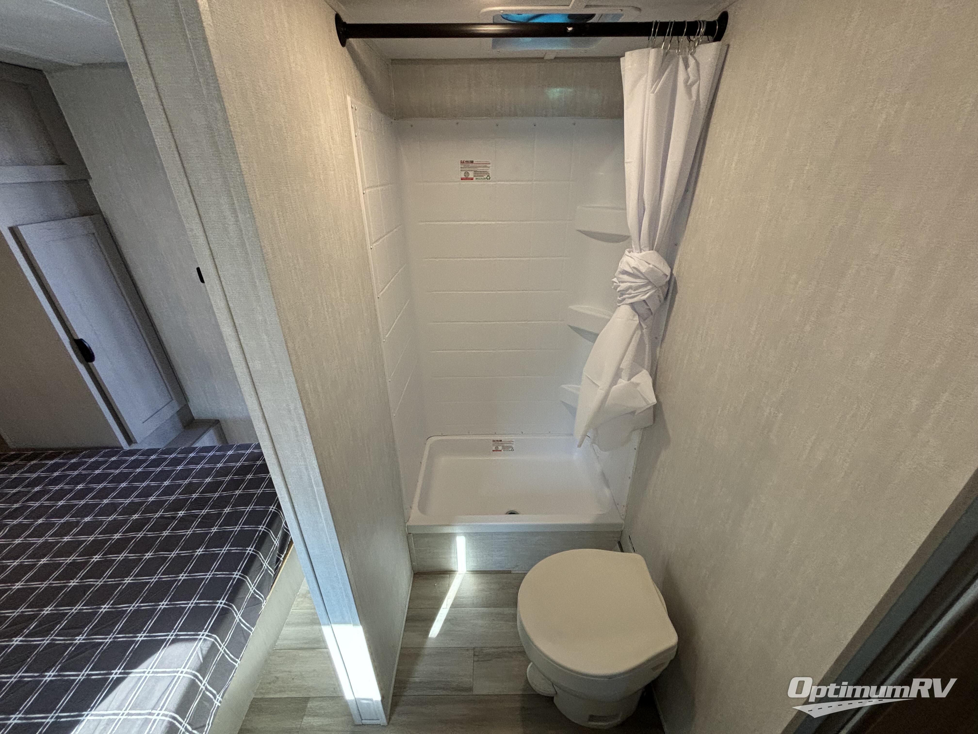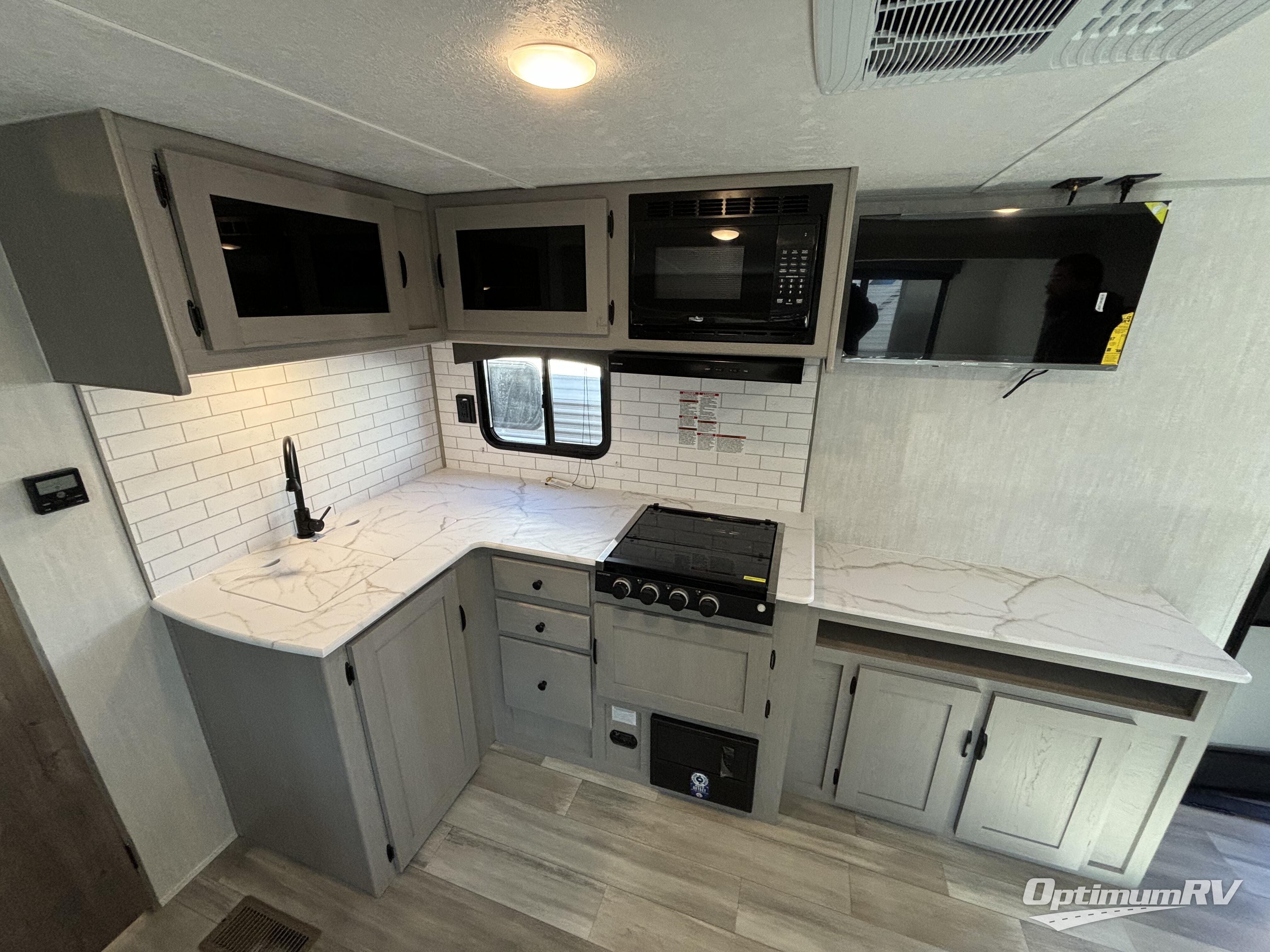 You won't believe all that this travel trailer has to offer! Starting with the front private bedroom including a 60" x 74" RV queen bed that has wardrobes on either side, one of the dual entry doors to the unit, and an entrance into the walk-thru bathroom which features a tub/shower to freshen up in each morning. The chef can prepare their best meals using the three burner cooktop and microwave oven, or if they can head outside to cook on the exterior camp kitchen if the weather is nice. You can enjoy your meals together at the U-shaped dinette and then play cards or a board game. There is also a sofa to relax on, and the kids will love the steps up to a double bed set of bunks!