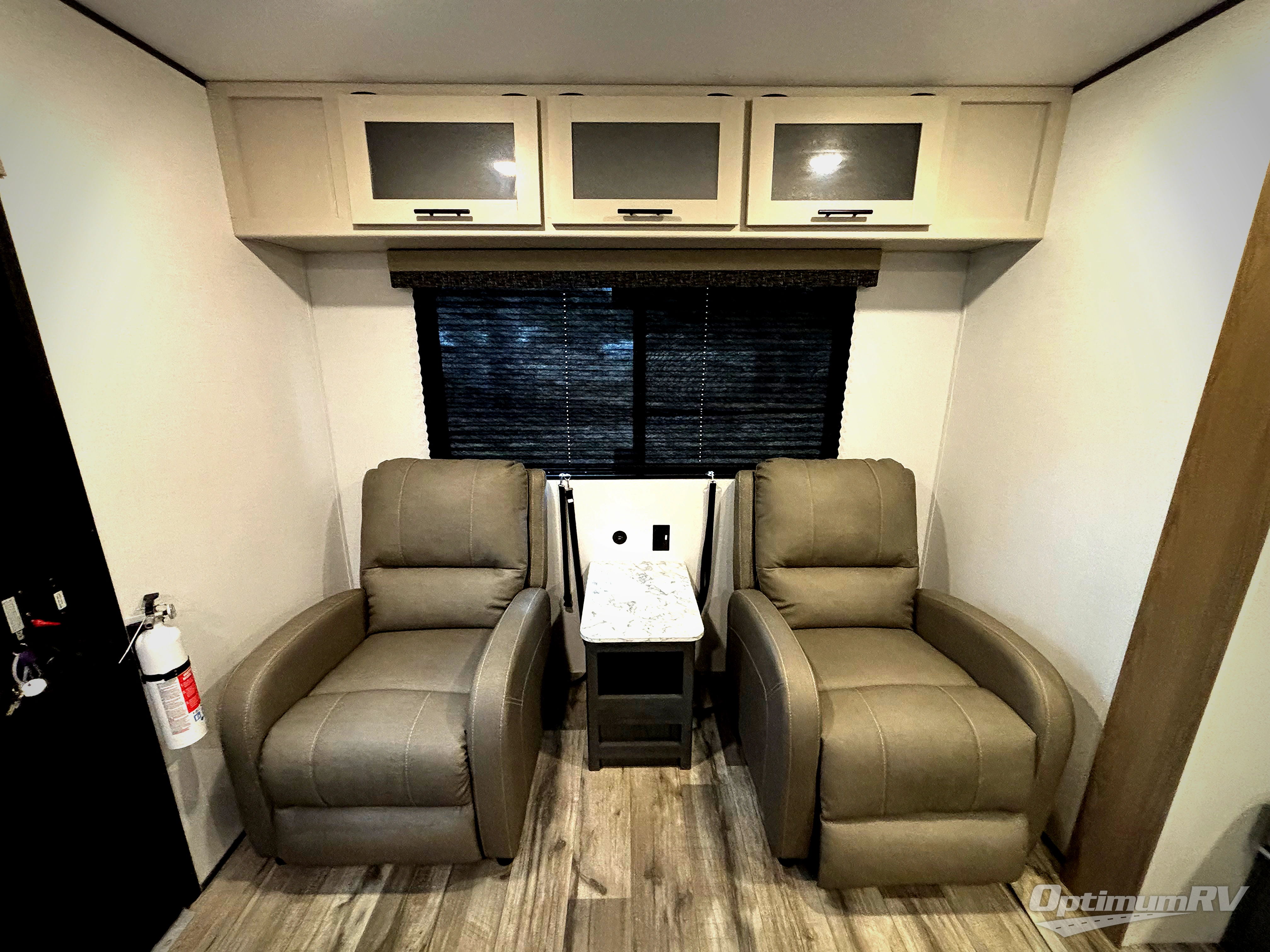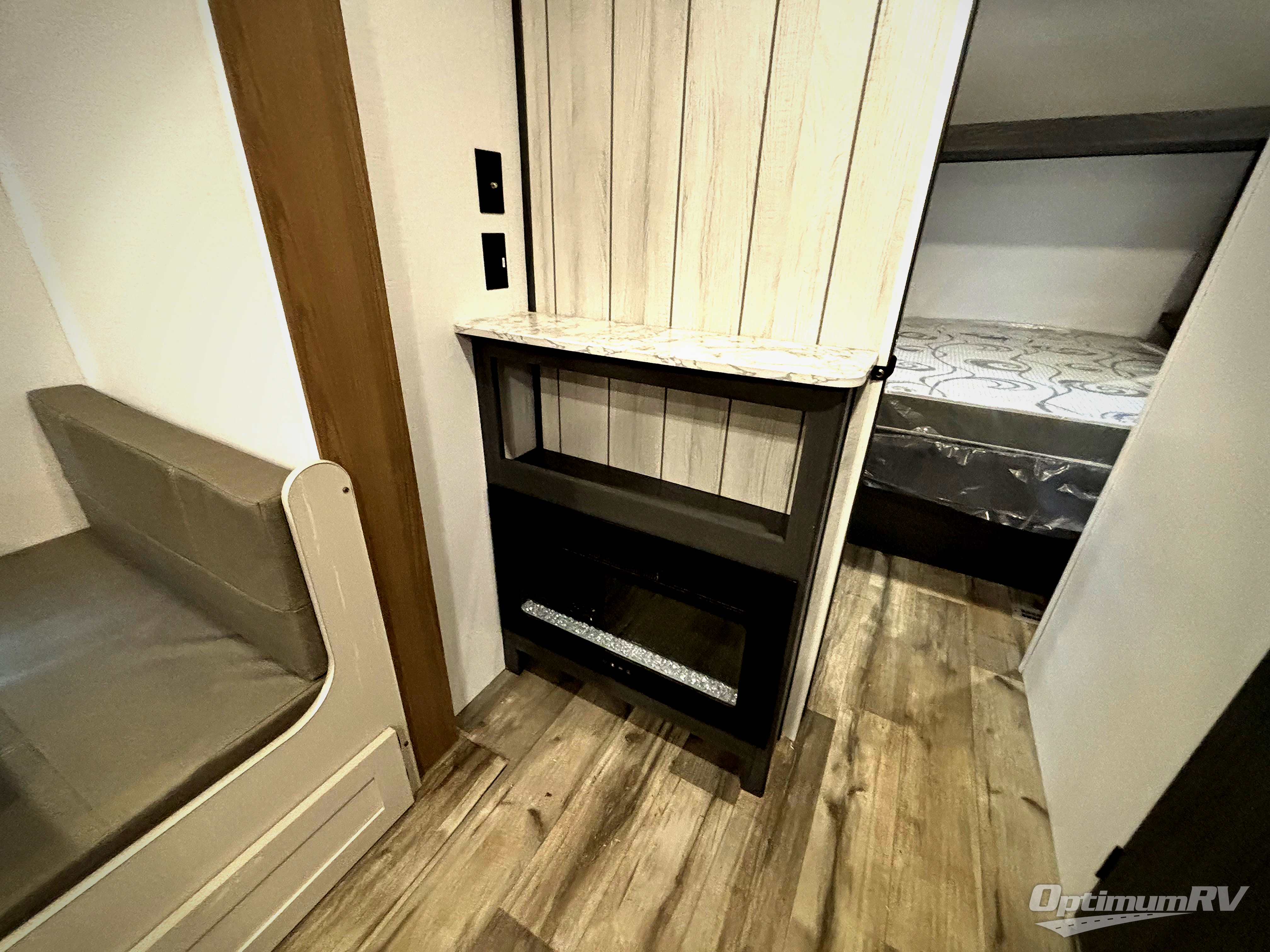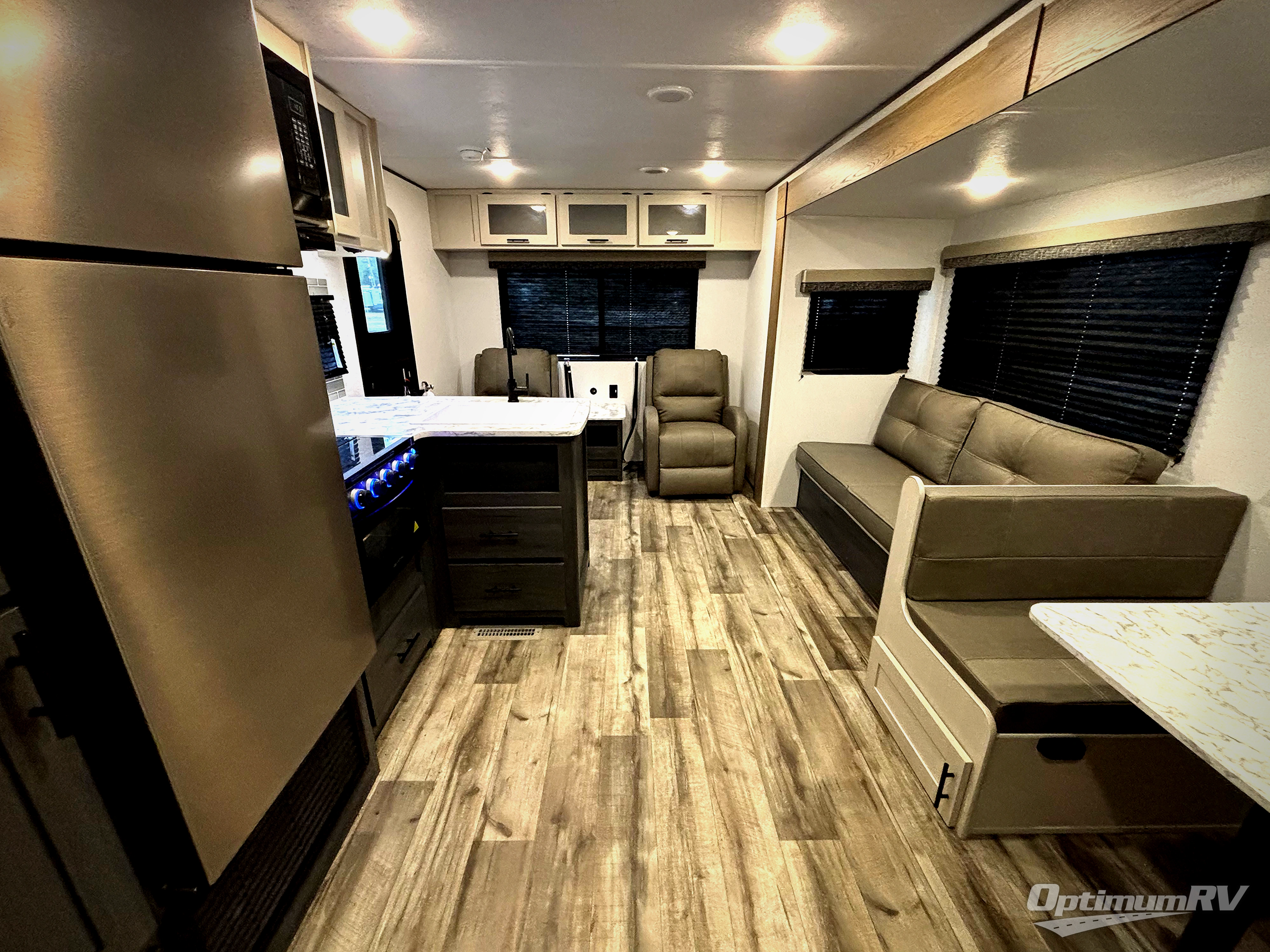 With dual entry doors, you can easily enter and exit this travel trailer! The jackknife sofa with footrest and booth dinette are next to each other near the fireplace, as well as two rear recliners allowing you to visit with other RVers or your family. The cook will have an oven and a microwave to make meals, and a 10 cu. ft. 12V refrigerator for cold items, plus a galley sink with high rise faucet to keep the dishes clean. Speaking of being clean, the full bathroom offers a shower with exhaust fan to eliminate unwanted steam as you clean yourself up after a fun day at the beach. The front private bedroom has a residential queen bed and one of the entrance/exit doors so you can slip out for an early morning fishing trip!