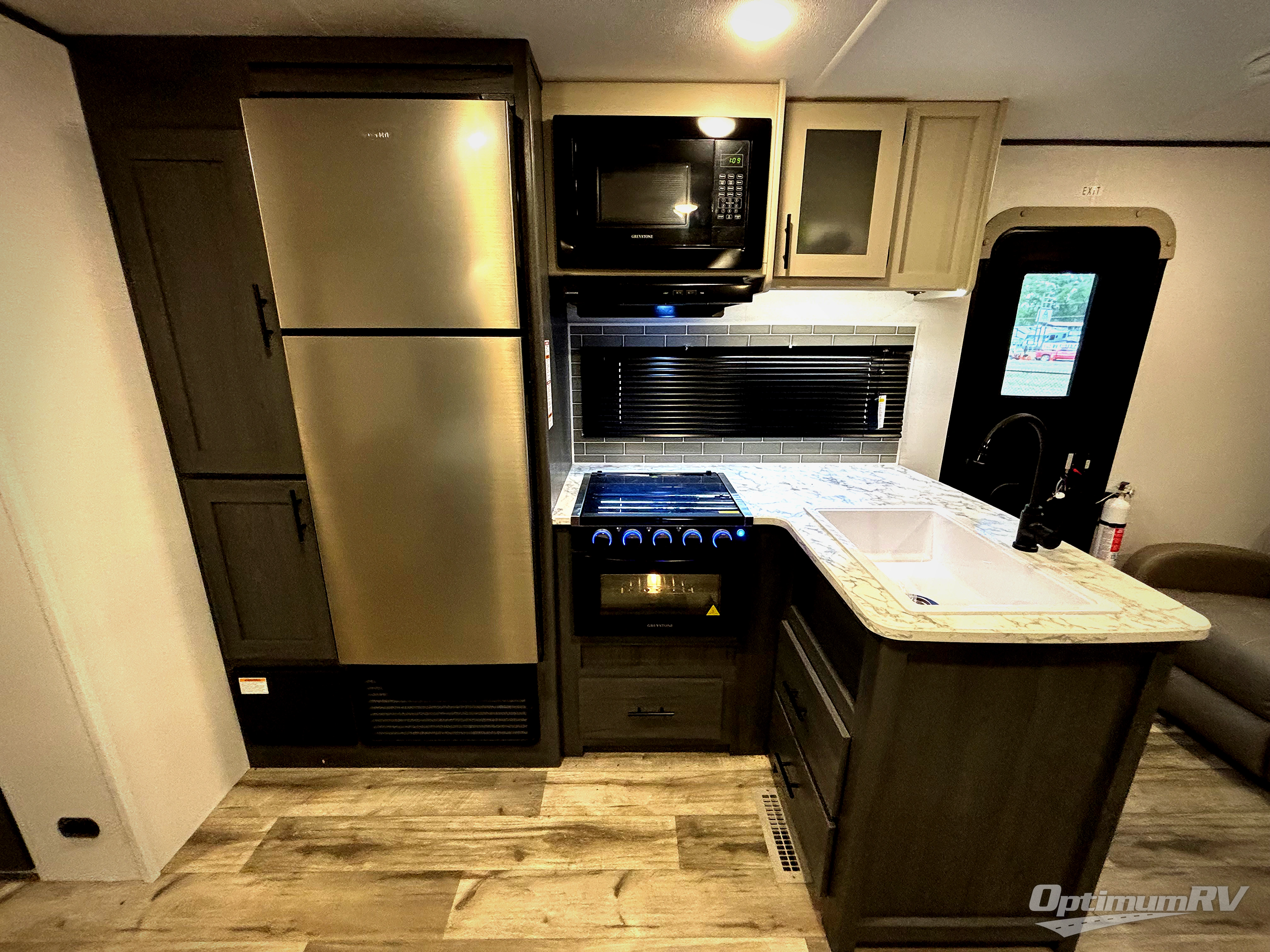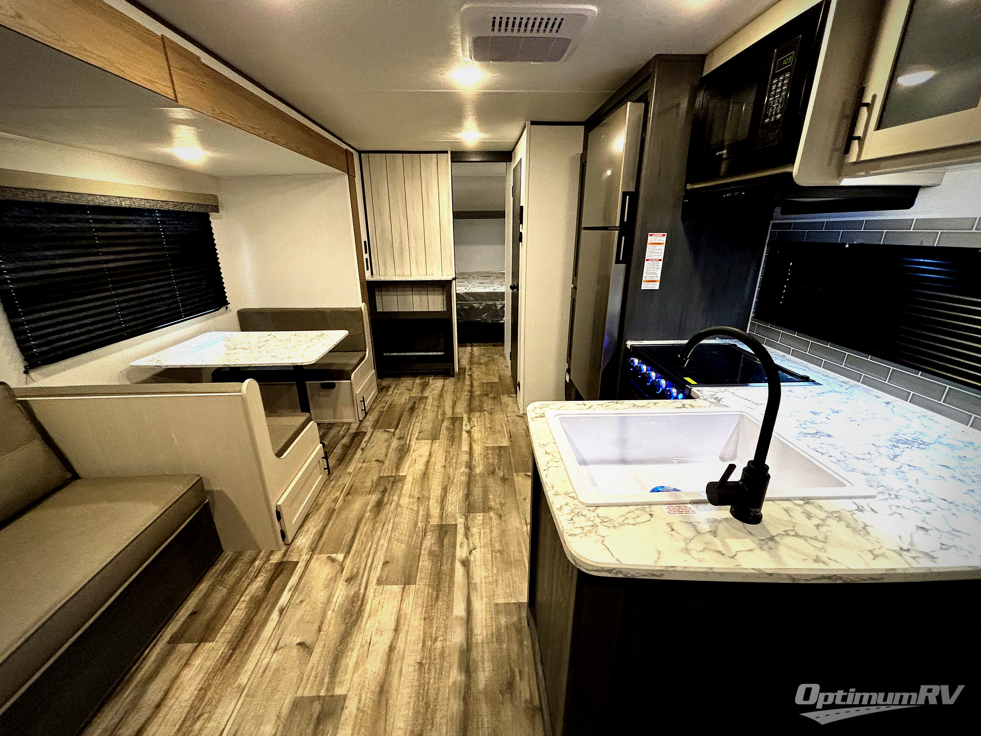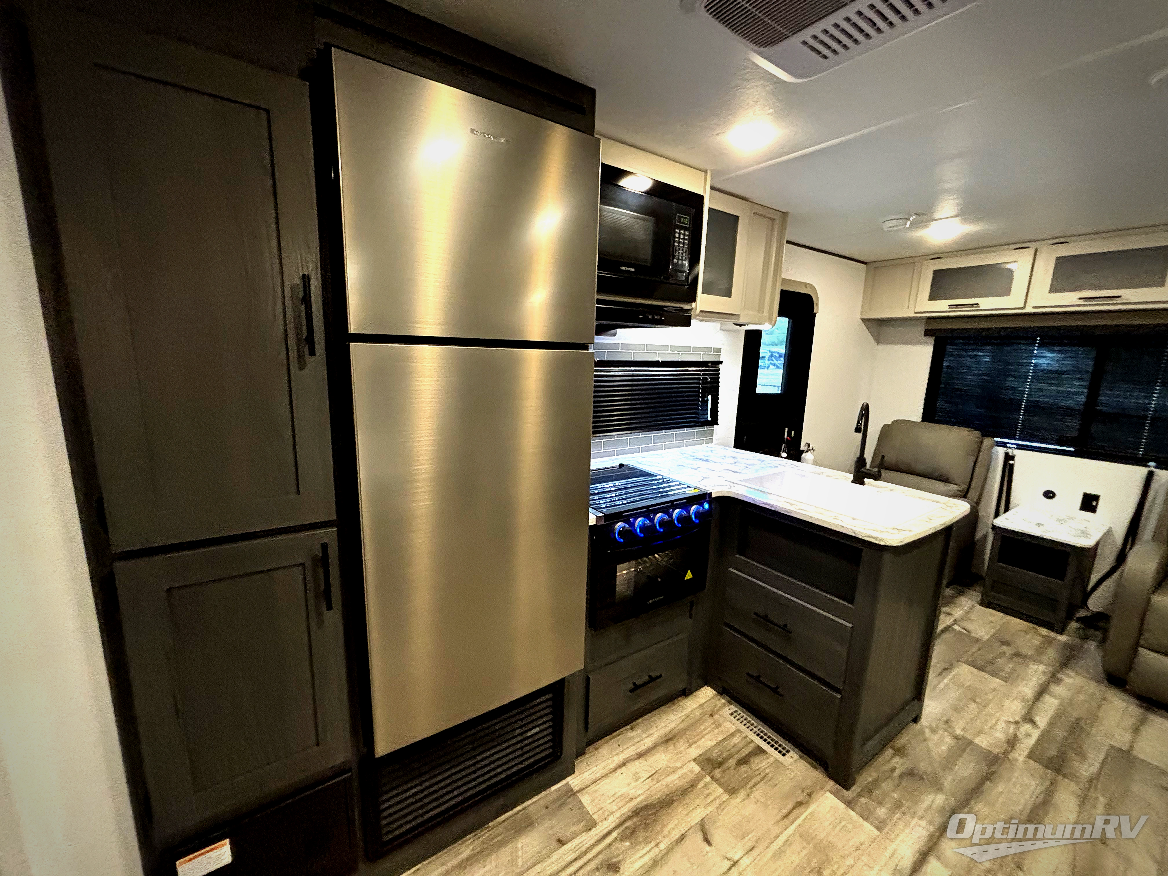 With dual entry doors, you can easily enter and exit this travel trailer! The jackknife sofa with footrest and booth dinette are next to each other near the fireplace, as well as two rear recliners allowing you to visit with other RVers or your family. The cook will have an oven and a microwave to make meals, and a 10 cu. ft. 12V refrigerator for cold items, plus a galley sink with high rise faucet to keep the dishes clean. Speaking of being clean, the full bathroom offers a shower with exhaust fan to eliminate unwanted steam as you clean yourself up after a fun day at the beach. The front private bedroom has a residential queen bed and one of the entrance/exit doors so you can slip out for an early morning fishing trip!
