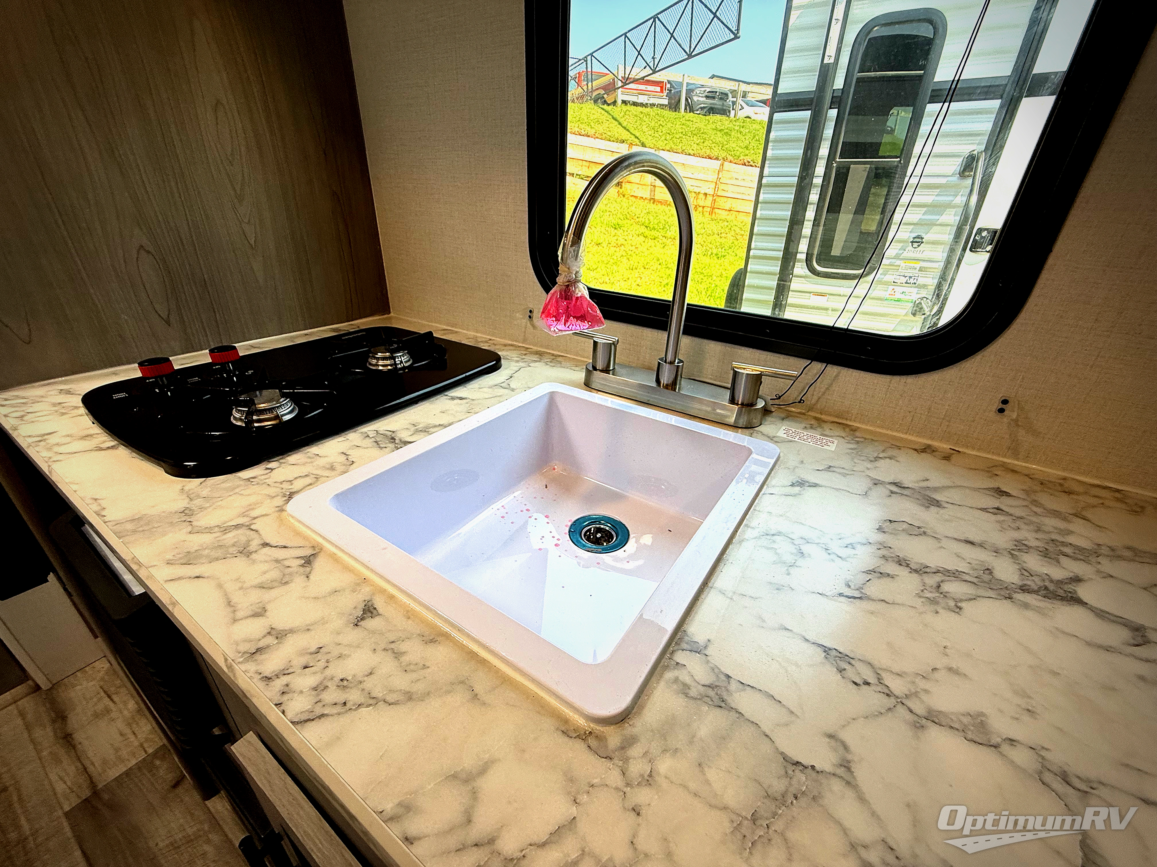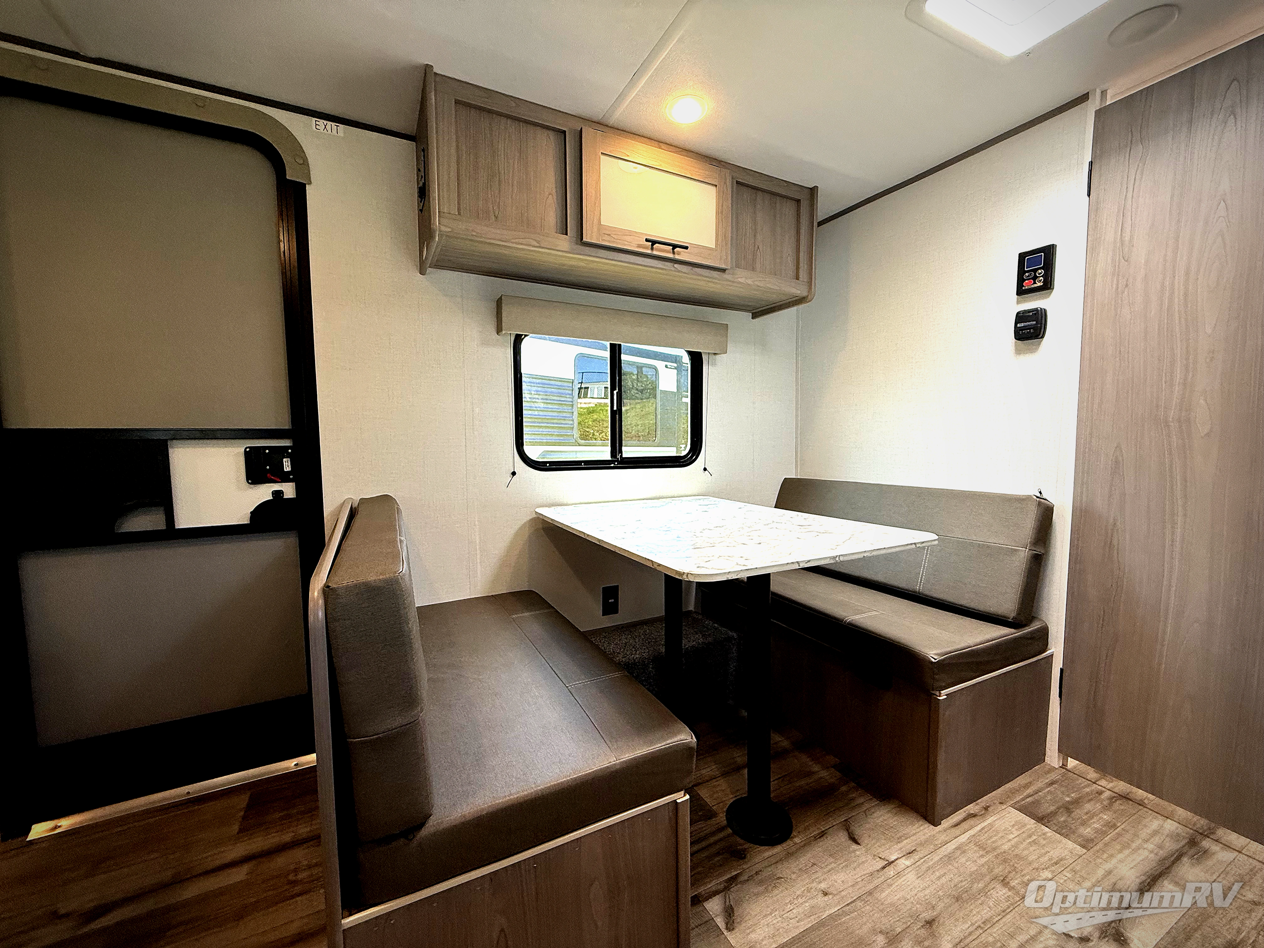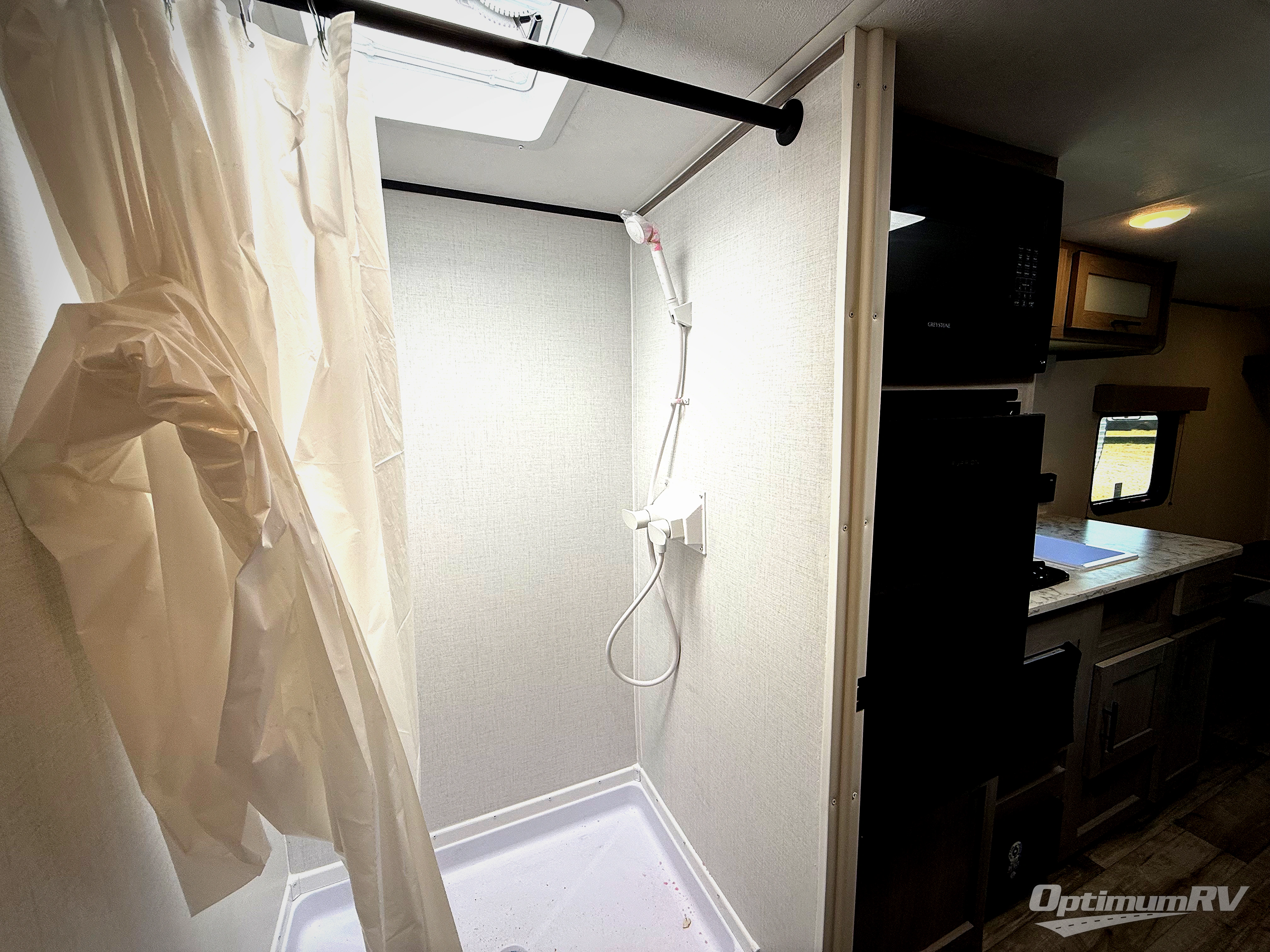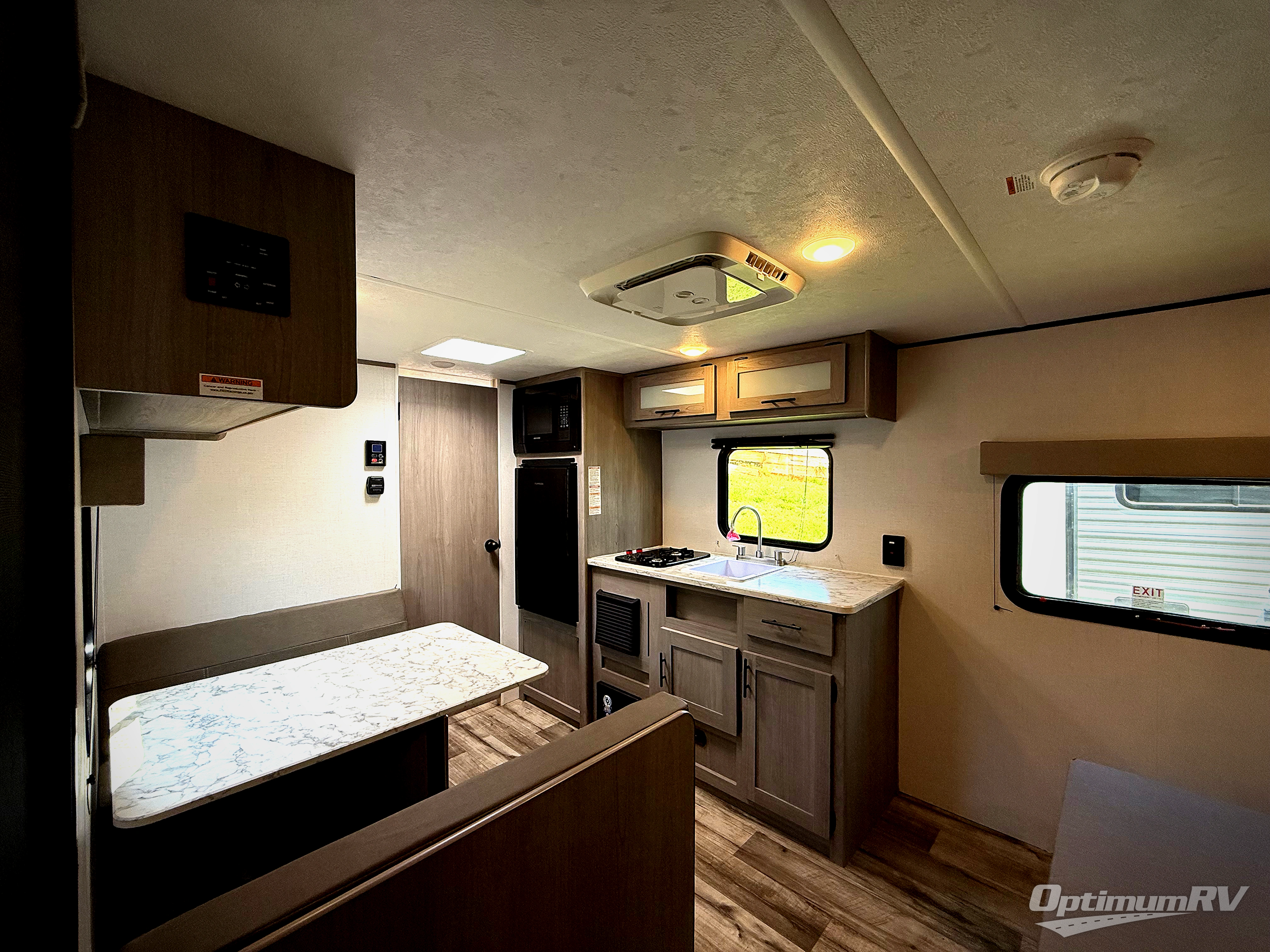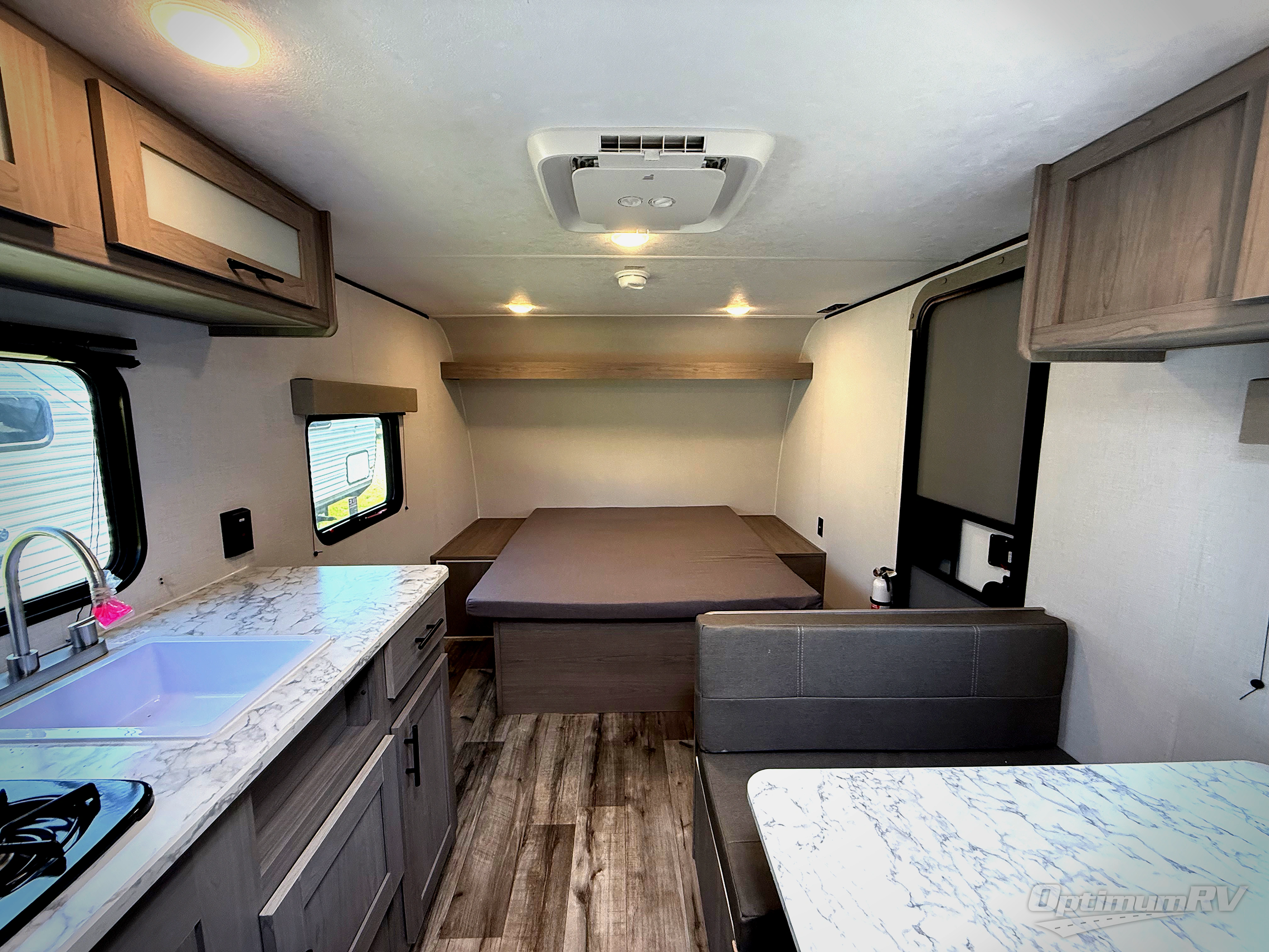 A perfect couples coach that could sleep one or two more, depending on size, using the booth dinette which can be converted at night This unit is cozy and convenient providing you just what you need to enjoy a little adventure away from home. For meals, there is a two burner cooktop and sink, plus a 3.3 cu. ft. refrigerator for your perishables. Overhead cabinetry can be found along both sides for your dishes and things. You will all appreciate the convenience of having your own private shower and toilet so that you don't need to use the campground facilities at night. You will also enjoy spending time outside with an 8' awning to provide even more living space outdoors!