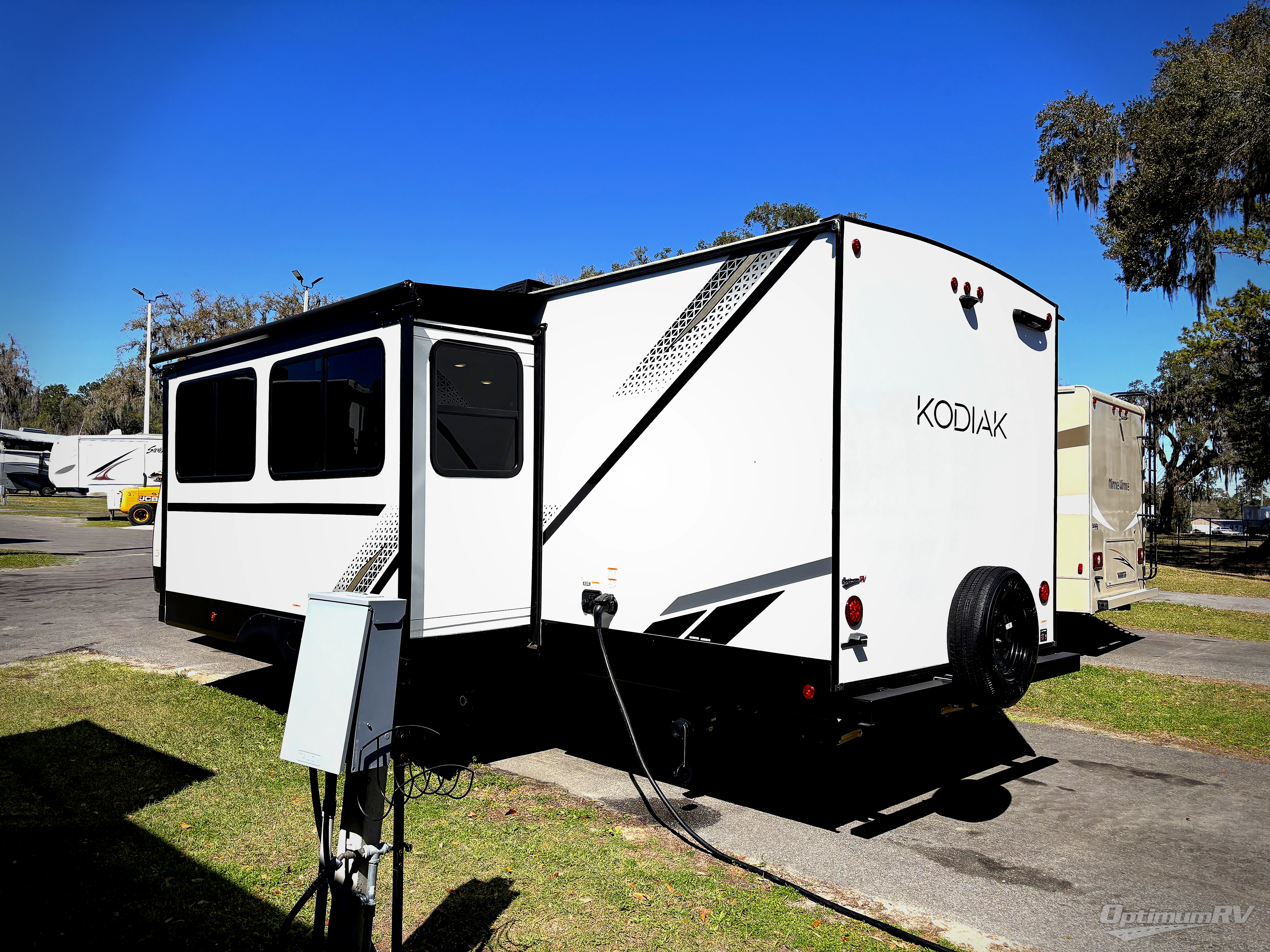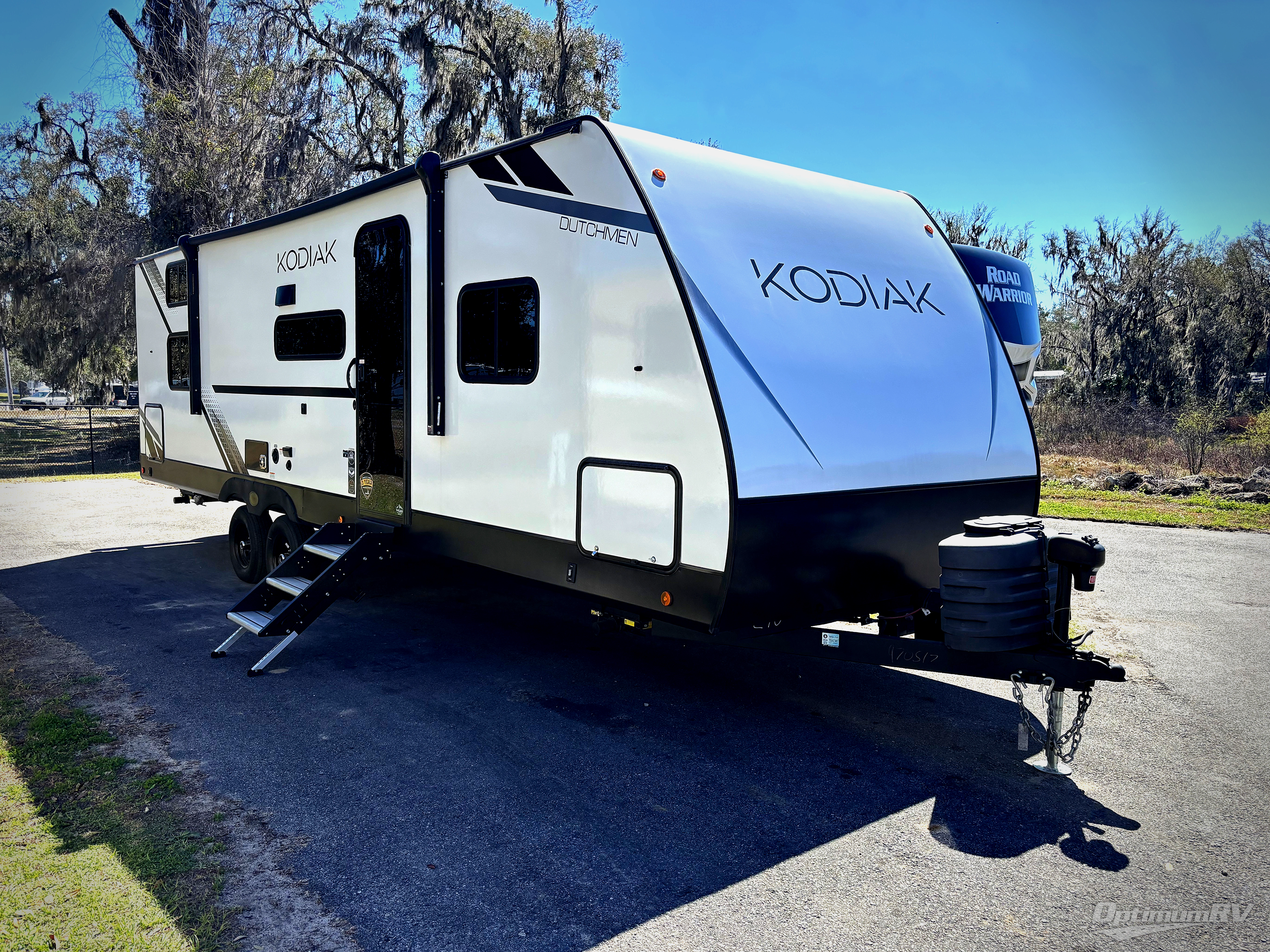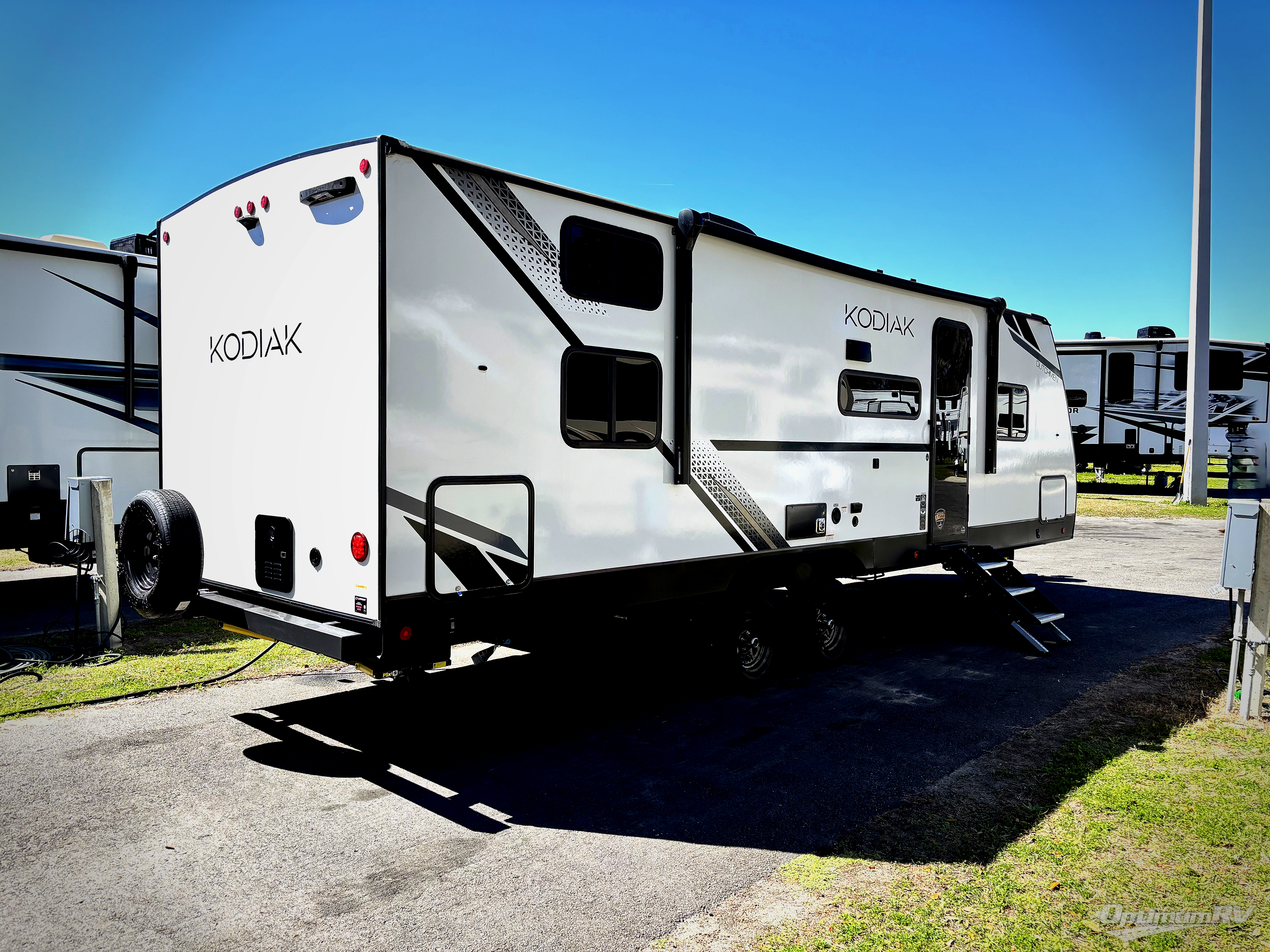 Each Kodiak travel trailer by Dutchmen includes a diamond front plate, easy lube axles, and a power tongue jack for hassle-free towing. The bear cave storage will allow you to bring along all the camp gear, and the power awning with an LED light will create an inviting outdoor space. Head inside to enjoy the designer valances, blackout roller shades, and seamless countertops. There is also HyperDeck flooring that will withstand your many adventures plus a 6' 8" interior height for more head room. A high output furnace and 13.5k BTU A/C will keep you comfortable, and the on-demand tankless water heater will provide instant hot water when you need it!