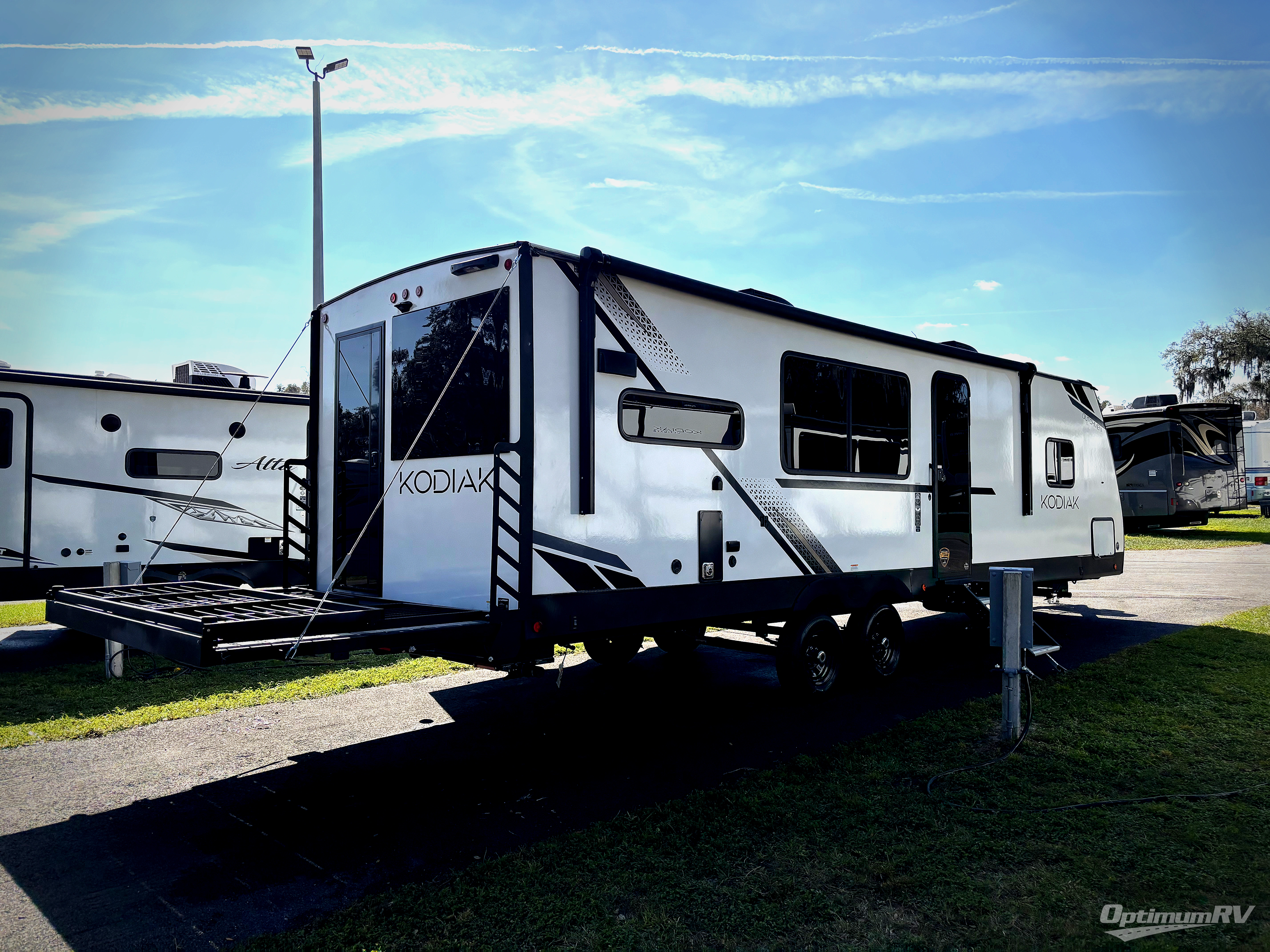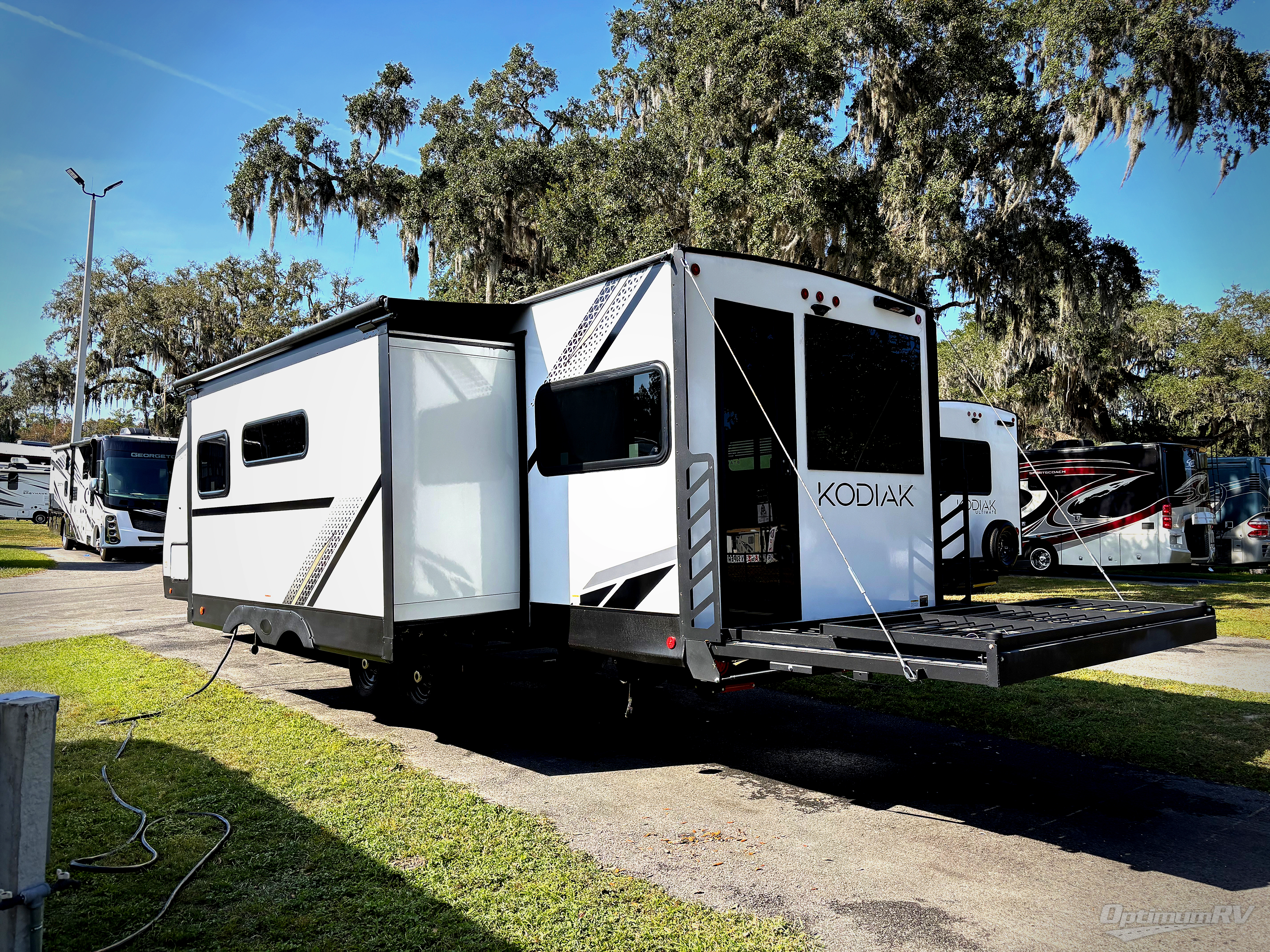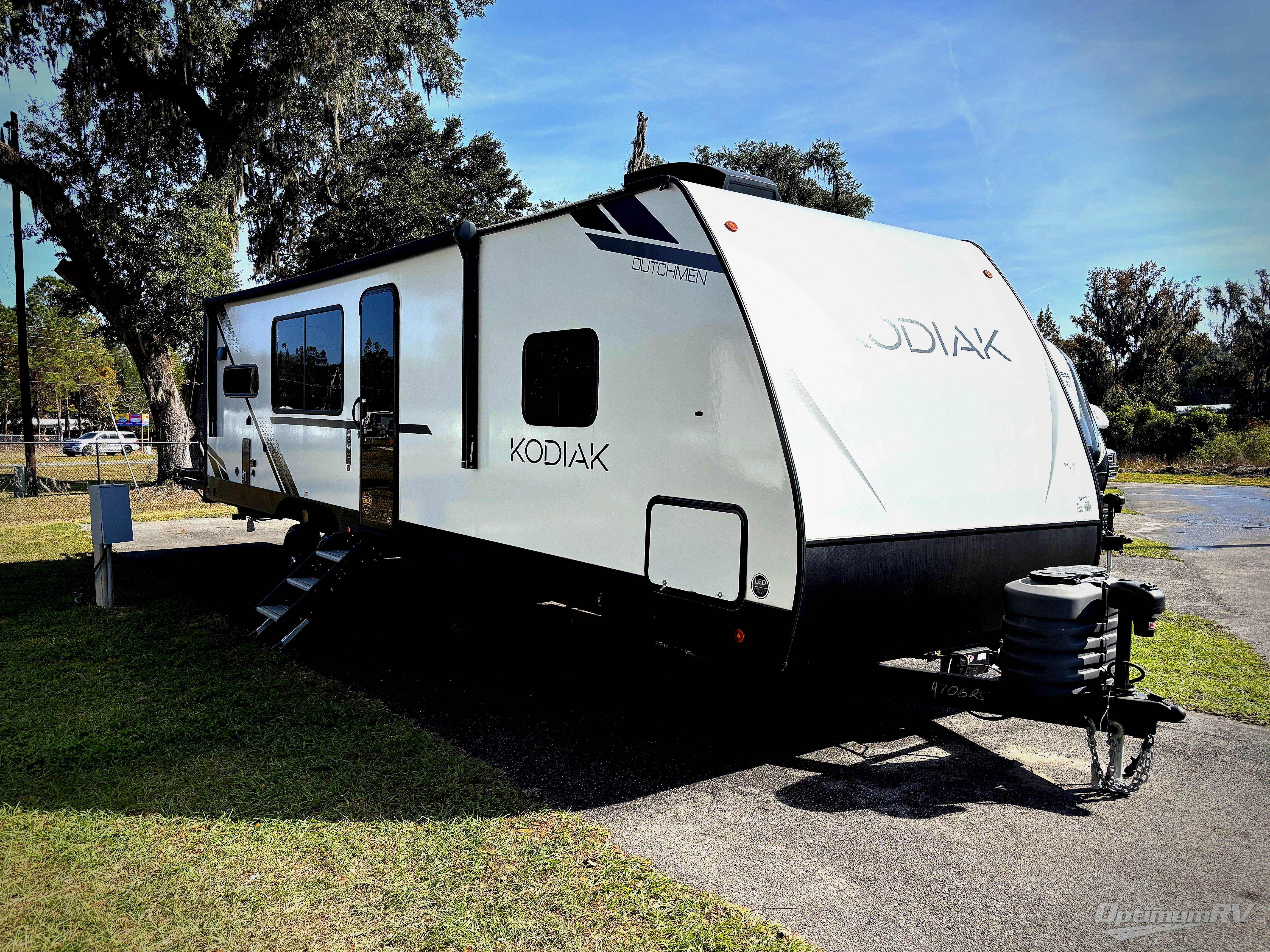 Each Kodiak travel trailer by Dutchmen includes a diamond front plate, easy lube axles, and a power tongue jack for hassle-free towing. The bear cave storage will allow you to bring along all the camp gear, and the power awning with an LED light will create an inviting outdoor space. Head inside to enjoy the designer valances, blackout roller shades, and seamless countertops. There is also HyperDeck flooring that will withstand your many adventures plus a 6' 8" interior height for more head room. A high output furnace and 13.5k BTU A/C will keep you comfortable, and the on-demand tankless water heater will provide instant hot water when you need it!