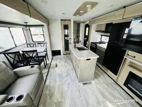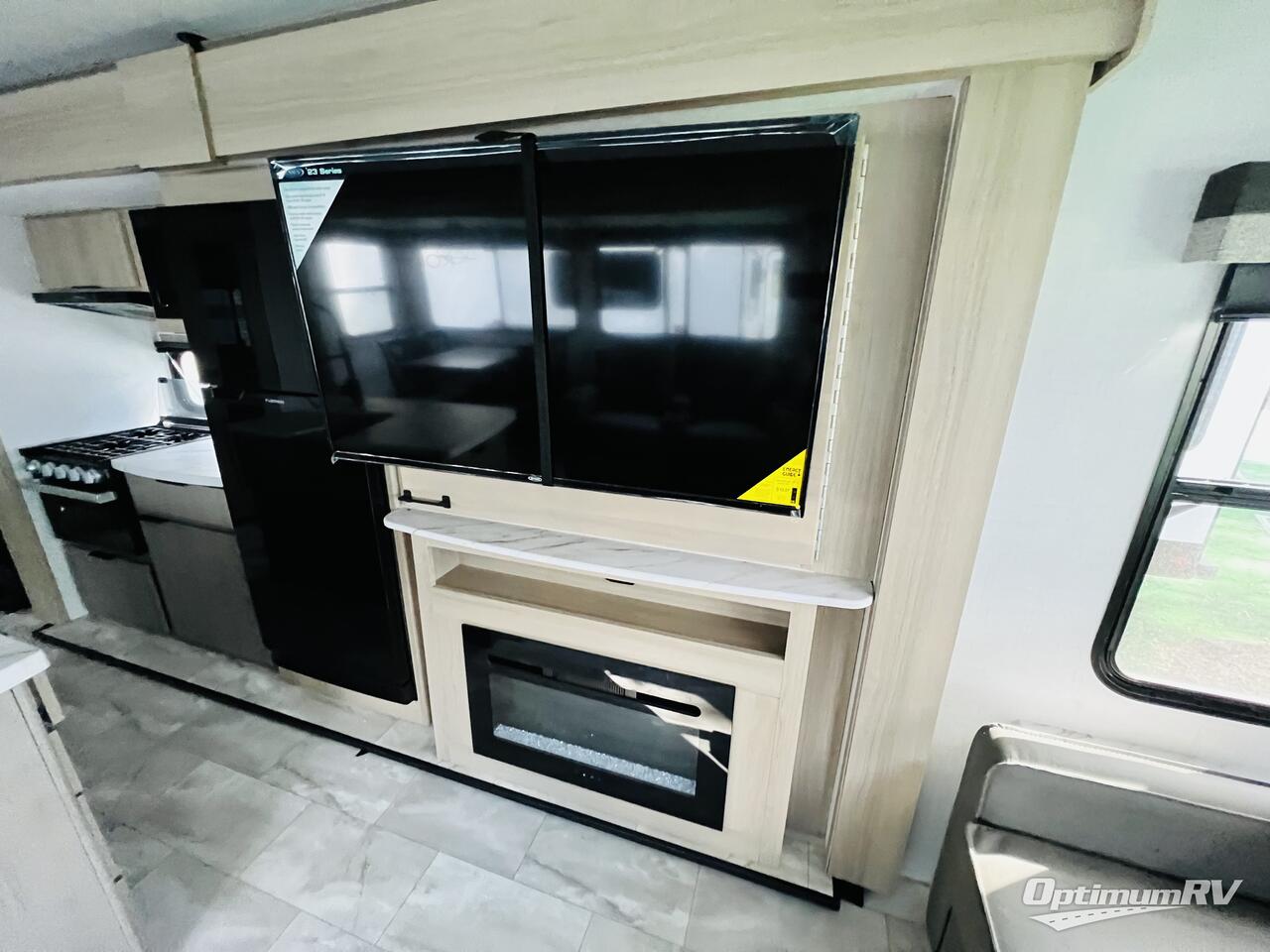 You will feel right at home in this spacious travel trailer that can sleep five people each night. The kitchen island includes a stainless kitchen sink, a three burner cooktop, plus a 10 cu. ft. 12V refrigerator for perishables. There is also an outside kitchen, which will make the outdoor cook very happy! The pass-through storage will be perfect for bringing along fishing poles or hiking gear, and there is a 20' power awning with LED lights if you enjoy relaxing outdoors in the evenings. Get cleaned up in the walk-through bath before heading off to the front master bedroom each night. You'll love the slide out king bed, the bedroom fireplace, and the front bench seat to read a book or two!