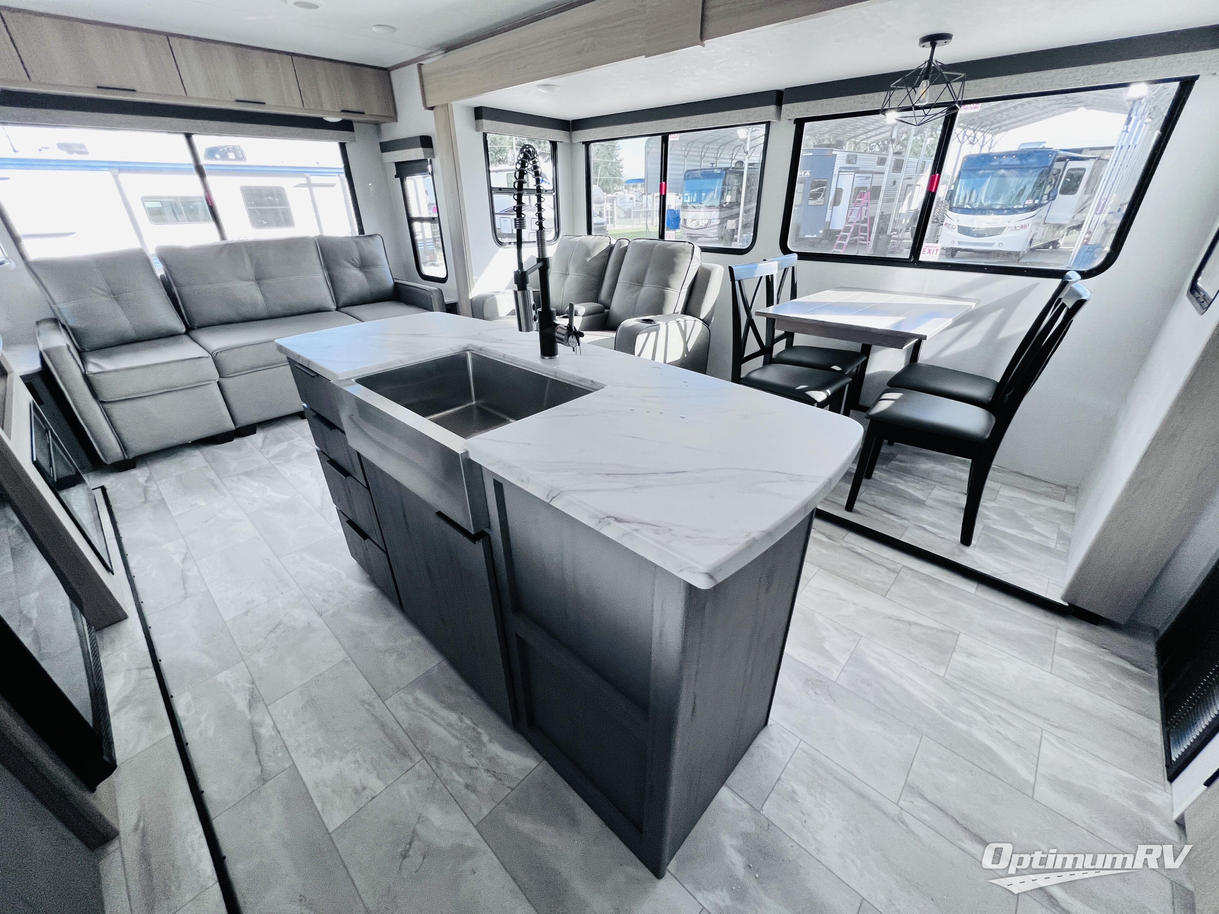 You will feel right at home in this spacious travel trailer that can sleep five people each night. The kitchen island includes a stainless kitchen sink, a three burner cooktop, plus a 10 cu. ft. 12V refrigerator for perishables. There is also an outside kitchen, which will make the outdoor cook very happy! The pass-through storage will be perfect for bringing along fishing poles or hiking gear, and there is a 20' power awning with LED lights if you enjoy relaxing outdoors in the evenings. Get cleaned up in the walk-through bath before heading off to the front master bedroom each night. You'll love the slide out king bed, the bedroom fireplace, and the front bench seat to read a book or two!