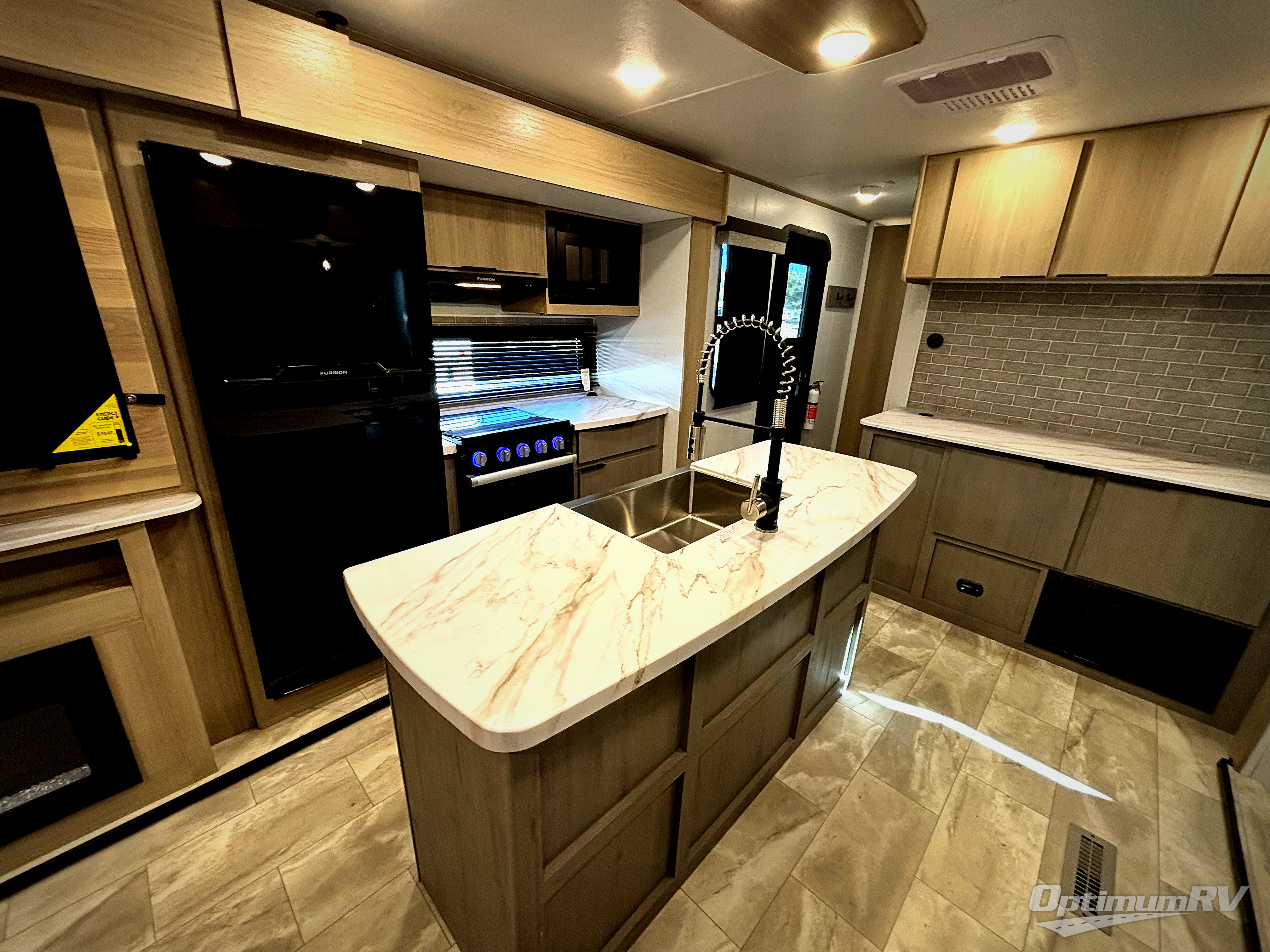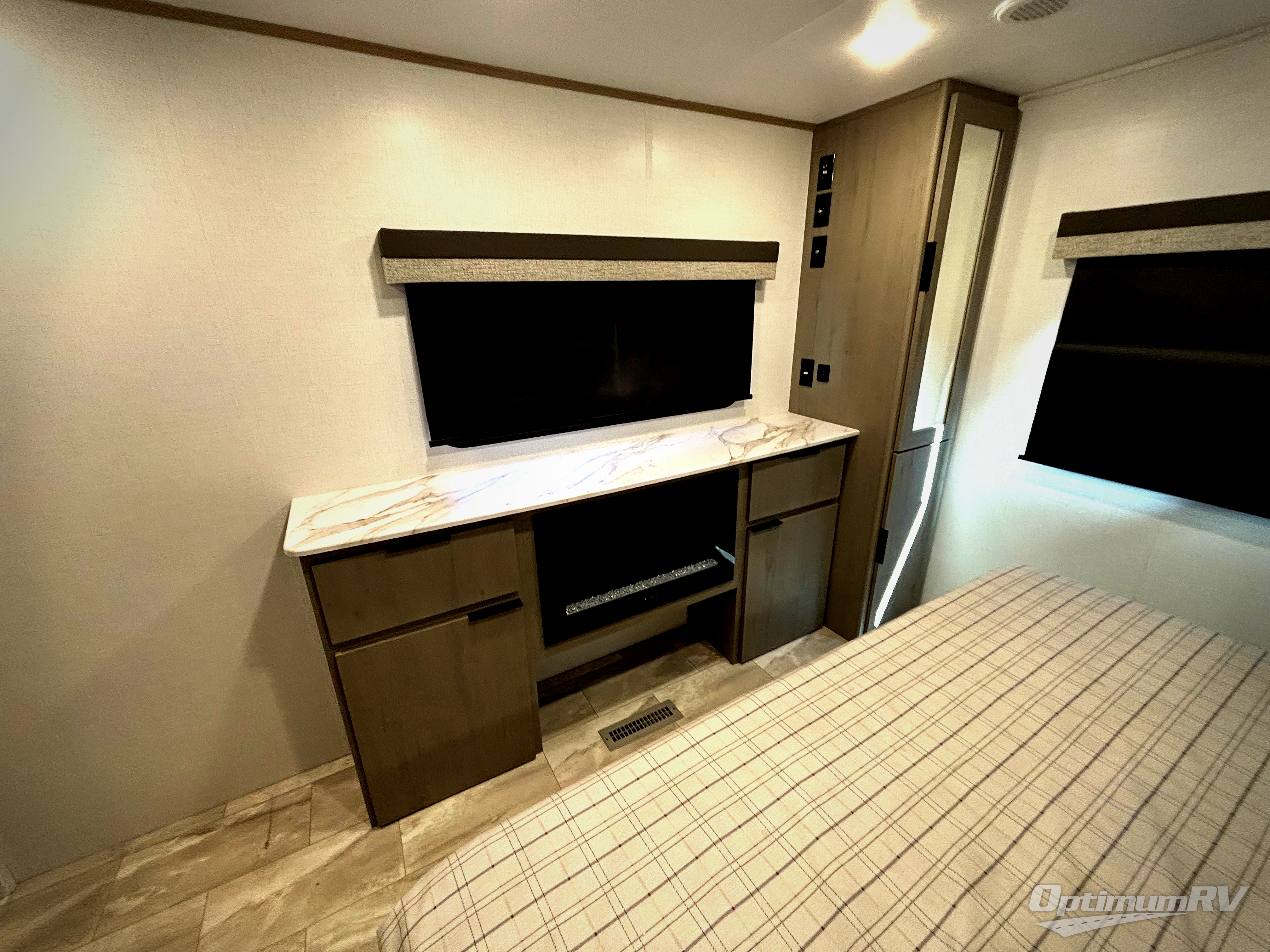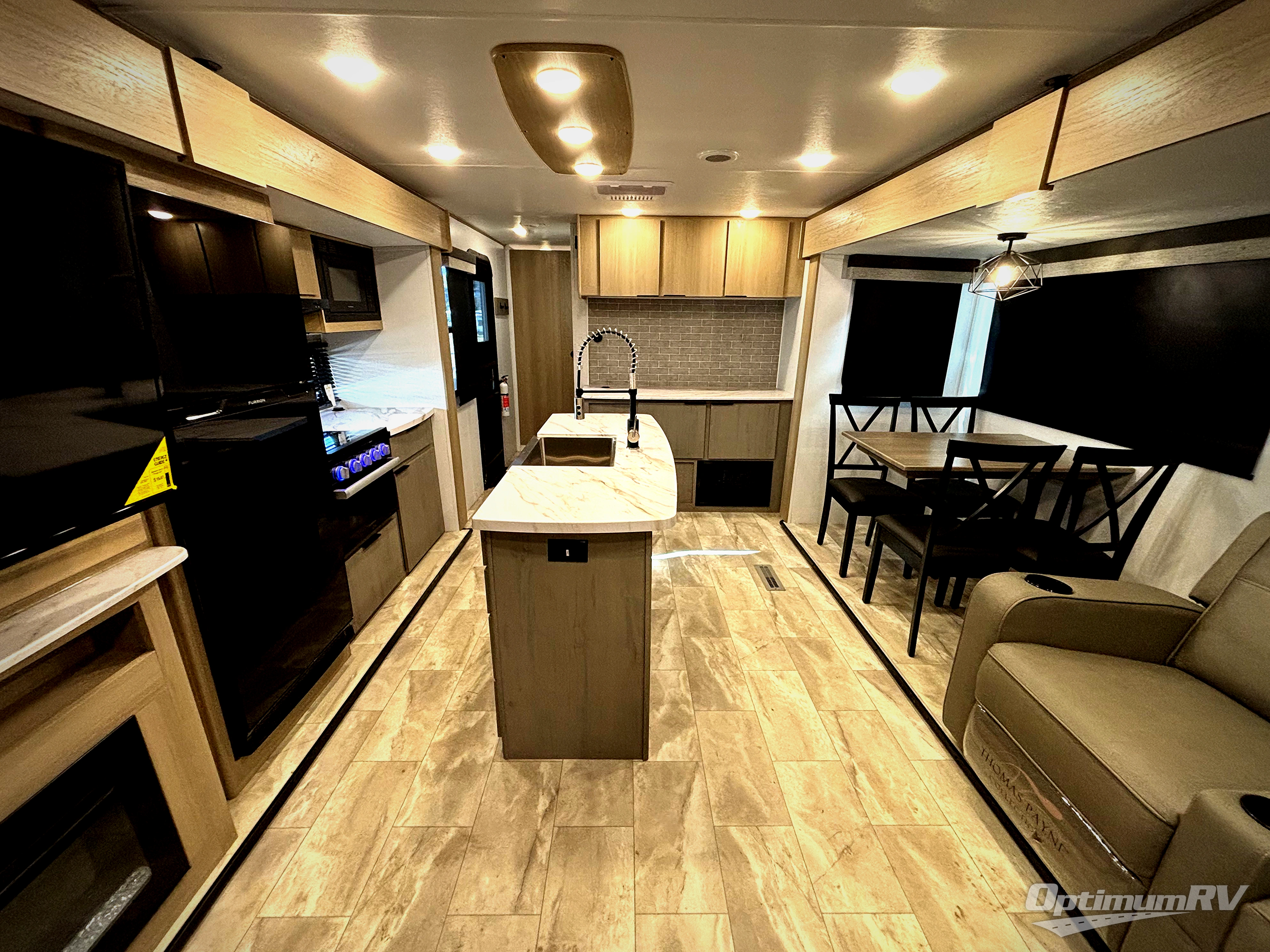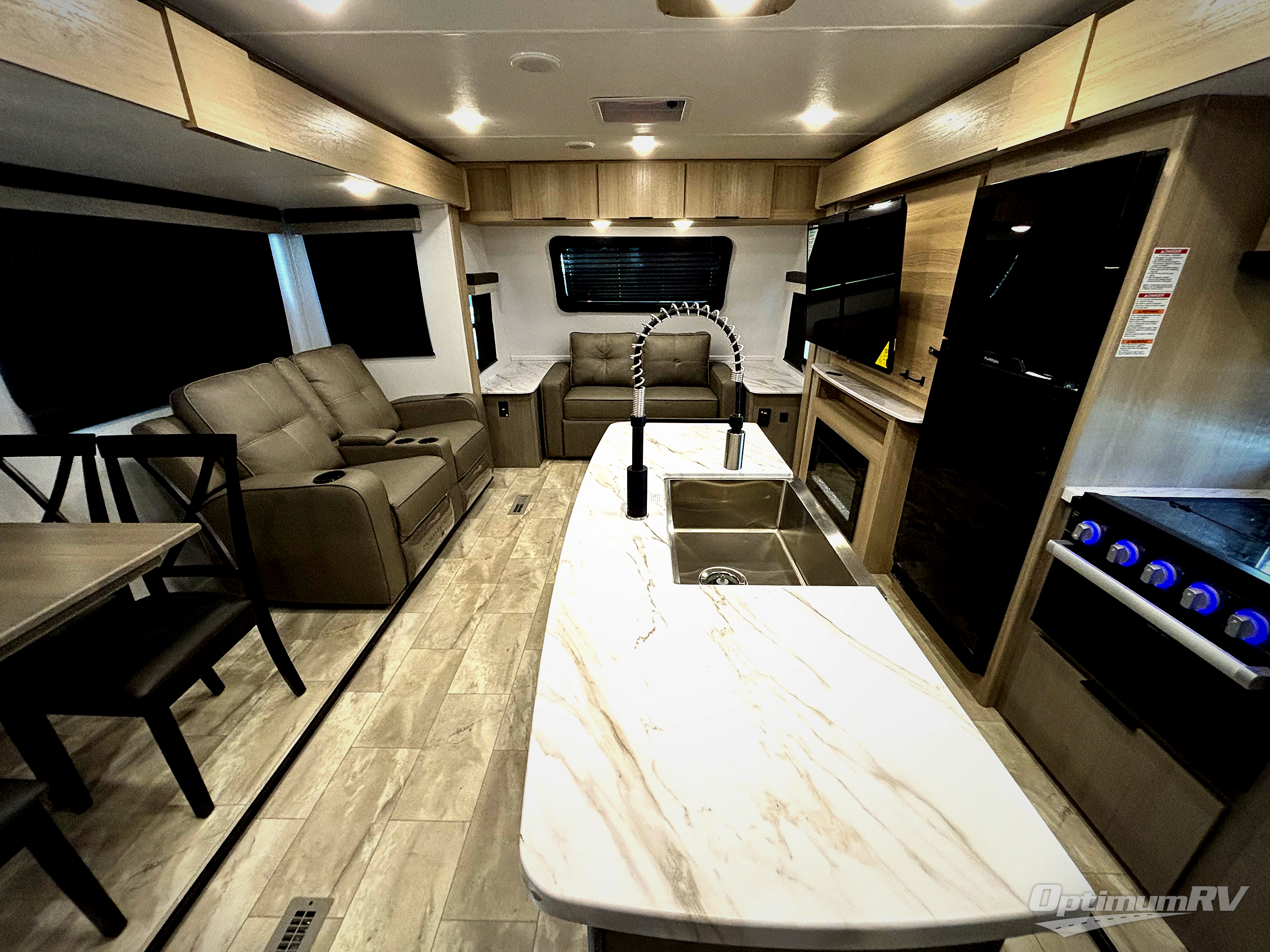 Enjoy ultimate family vacations or trips with friends in this spacious travel trailer. The dual opposing slides in the front living area open up the whole unit for a more at-home feel, and you'll find plenty of seating spaces on the theater seating with a foot rest, booth dinette, and jack knife sofa. The chef of the family will appreciate the extra counter space provided by the kitchen island, plus there is an extra counter with cabinets above for dishes and food. There is an outside kitchen that will come in handy if you like to cook breakfast outdoors, and the power awning with LED lights will provide your crew with shade as they wait for the food to be done. You and your spouse will love retreating to the rear private bedroom for bed each night. Here, the slide out king bed will provide a great night's rest, plus you will have your own fireplace, a closet, and linen storage for more belongings!