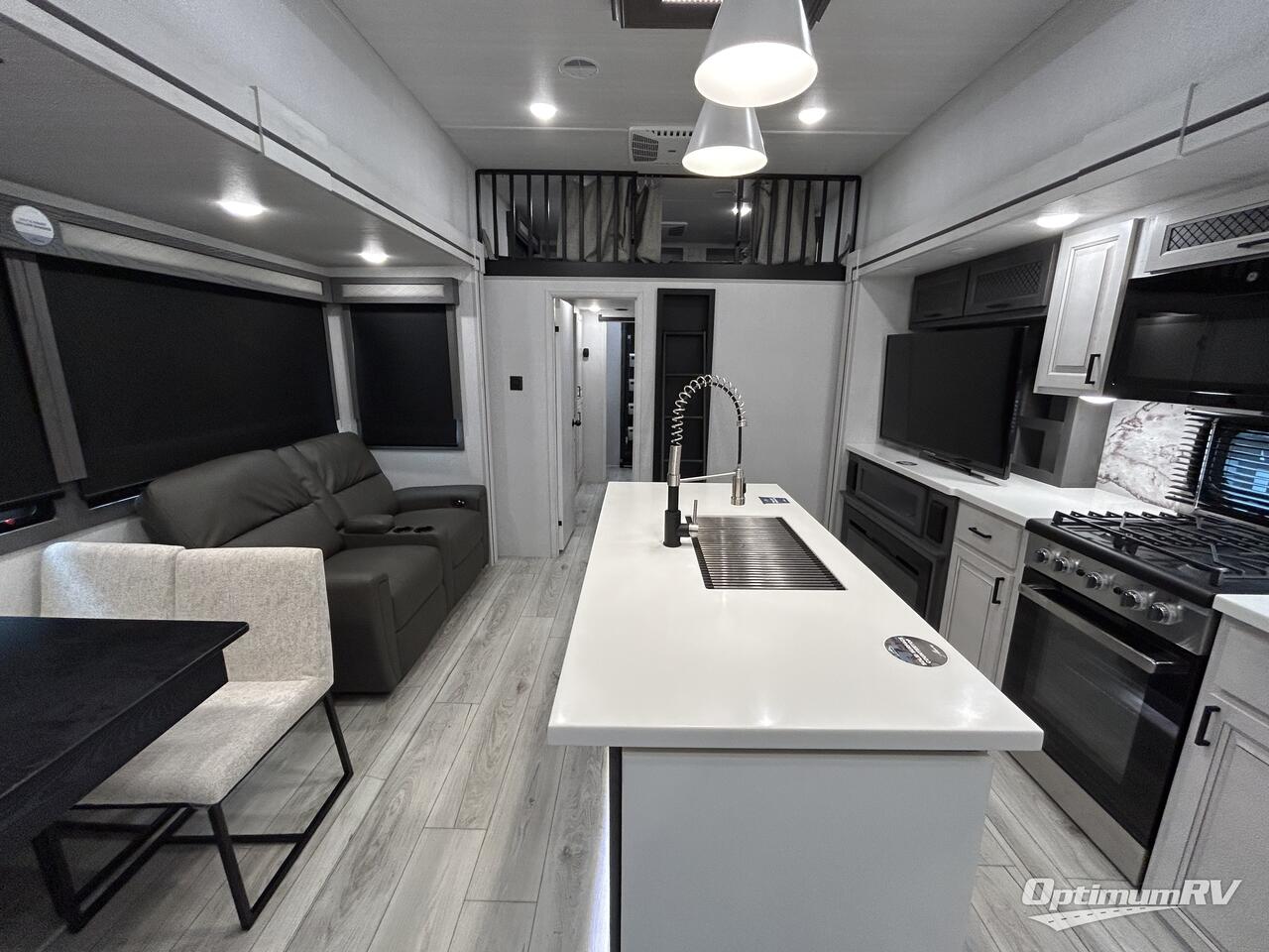If you're looking for a luxury fifth wheel with more space for friends and family, you've found it in this Ahara! The main entry door opens up to the living area with dual opposing slides, a 50" LED TV with a fireplace, plus a full kitchen with residential appliances, a hutch, and even a pantry for dry goods and snacks. Everyone can meet here in the evenings to dine at the free-standing dinette or relax on the theater seating. You'll love the rear master suite with its king bed slide out, drawers under the bed, and full rear bath with the unique rear second entry door. And check out the Ahara Sky Suite loft above this room for even more sleeping or storage space! Your guests will find the front private bedroom to be accommodating since it includes a king bed slide out, drawers under the bed, pus a large wardrobe to keep clothes tidy. There is also a closet with washer and dryer pre. Who knows, you may just choose this bedroom for your own!