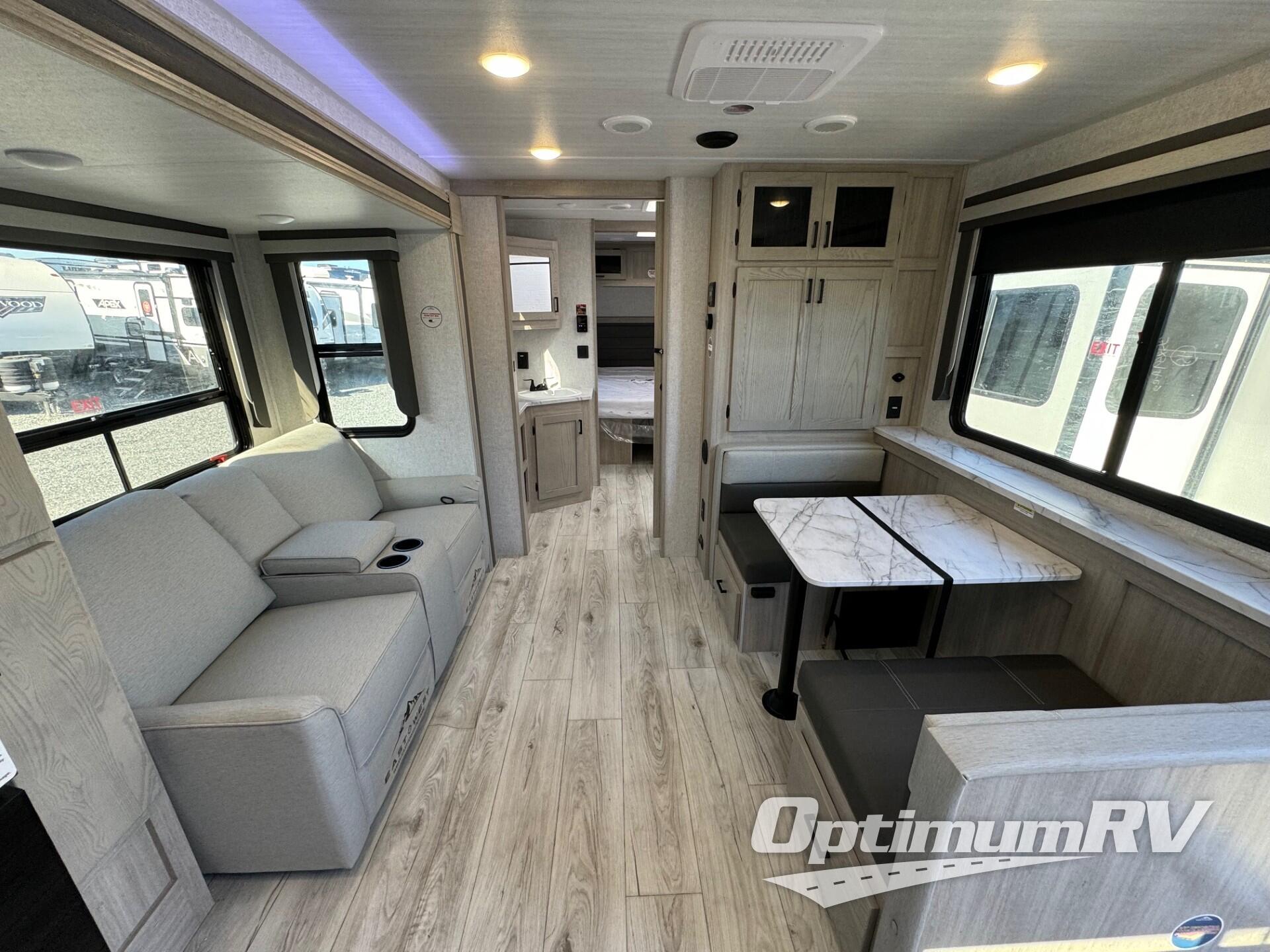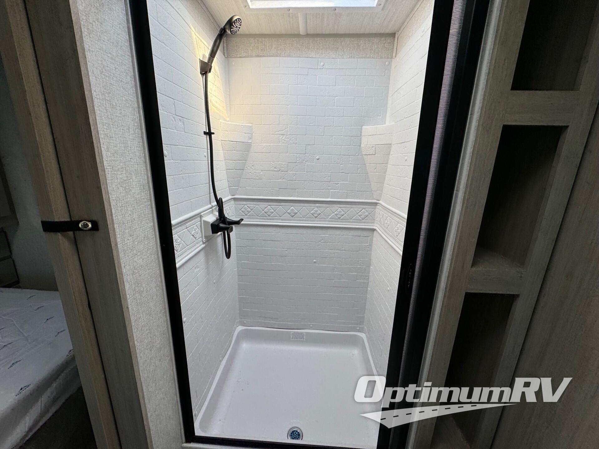 You can comfortably sleep four in this travel trailer thanks to the Tri- Fold Sofa and a king bed. There is also additional space as in the overhead cabinets, dual wardrobes and night stands. The combined living area and kitchen includes a Tri-fold Sofa with optional theater seats, a booth dinette with storage under it, plus a 50" TV. Great accessibility thanks to the two entry doors. In the exterior, there is also a 19' awning and a pass-trough storage. Finally after a long day take a comfortable and relaxing shower in our walk trough bathroom.
