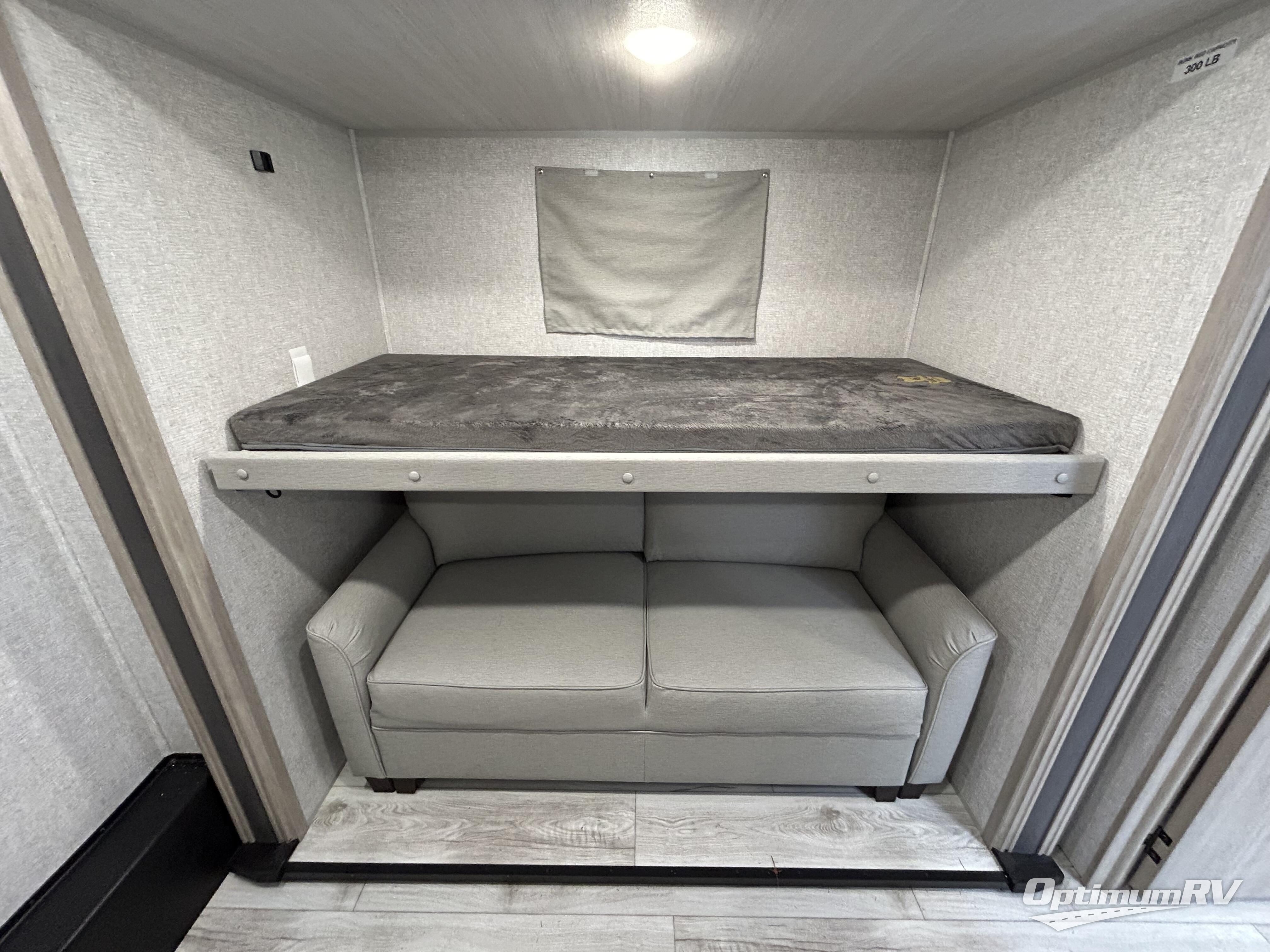 If you're looking for a travel trailer to take tailgating, this Alta model is the one! After you've unloaded the pass-through storage and set up the 21' power awning, start lunch on the outside kitchen! Since there are dual entry doors you can enter in through the main living area, or the full bath for convenience. The little ones are sure to spend most of their time in the rear bunkhouse that includes a flip-up bunk under the sofa, plus a second bunk across the room. The adults can visit at the booth dinette or on the tri-fold sofa, and check out the front private bedroom with sliding doors and a king bed for all-around comfort!
