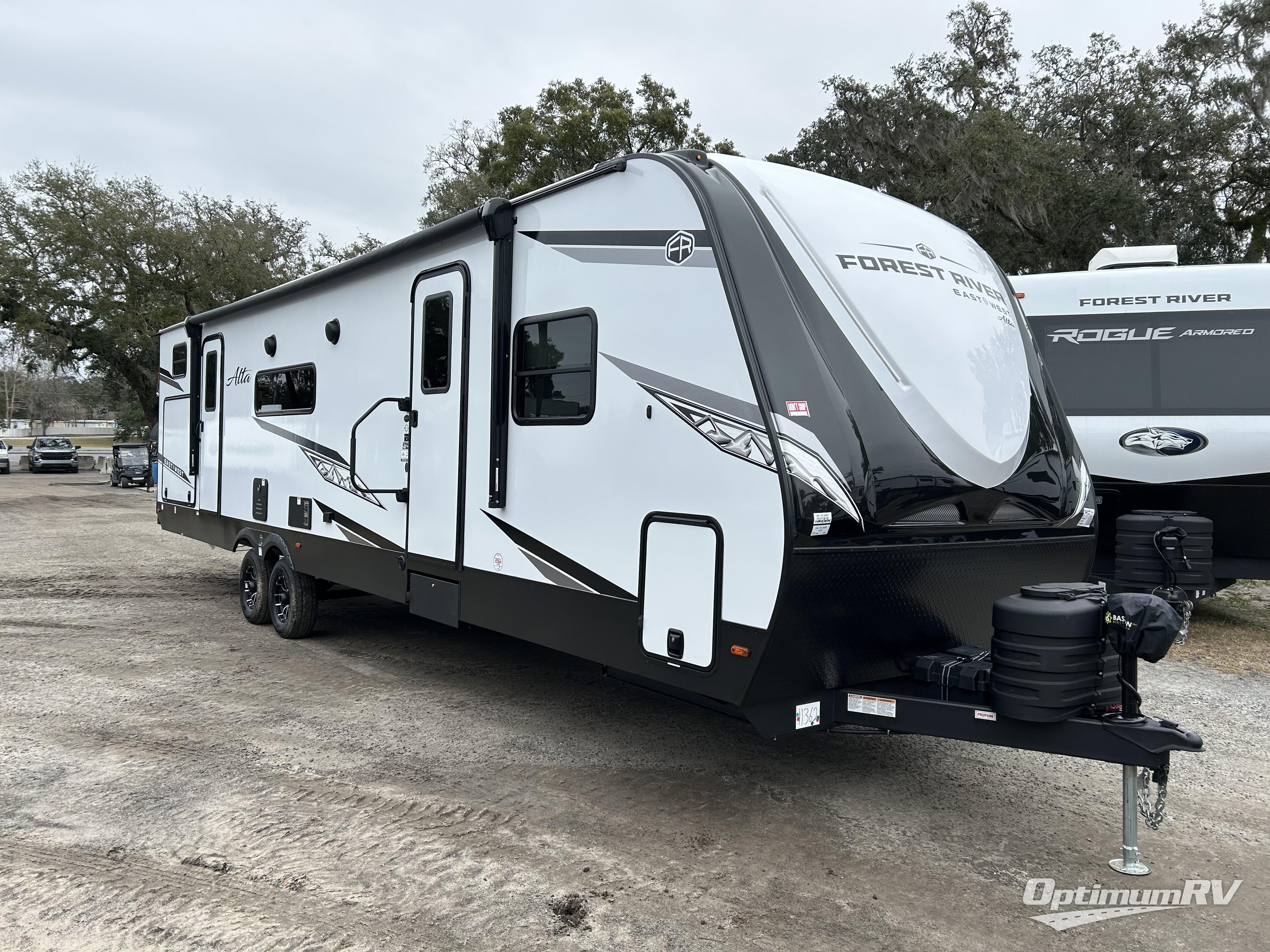 Each Alta travel trailer or toy hauler by EAST TO WEST is constructed with a 5" vacuum bonded roof, an enclosed and heated underbelly, and diamond plate front rock guard for added protection. Outside, you'll find marine-grade exterior speakers, a universal docking station, and back-up camera prep that can be added to make maneuvering in and out of campgrounds easier than ever. Inside, there are 4k interior LED lights, solid pressed membrane countertops, black roller shades, and many more interior comforts you are sure to love.