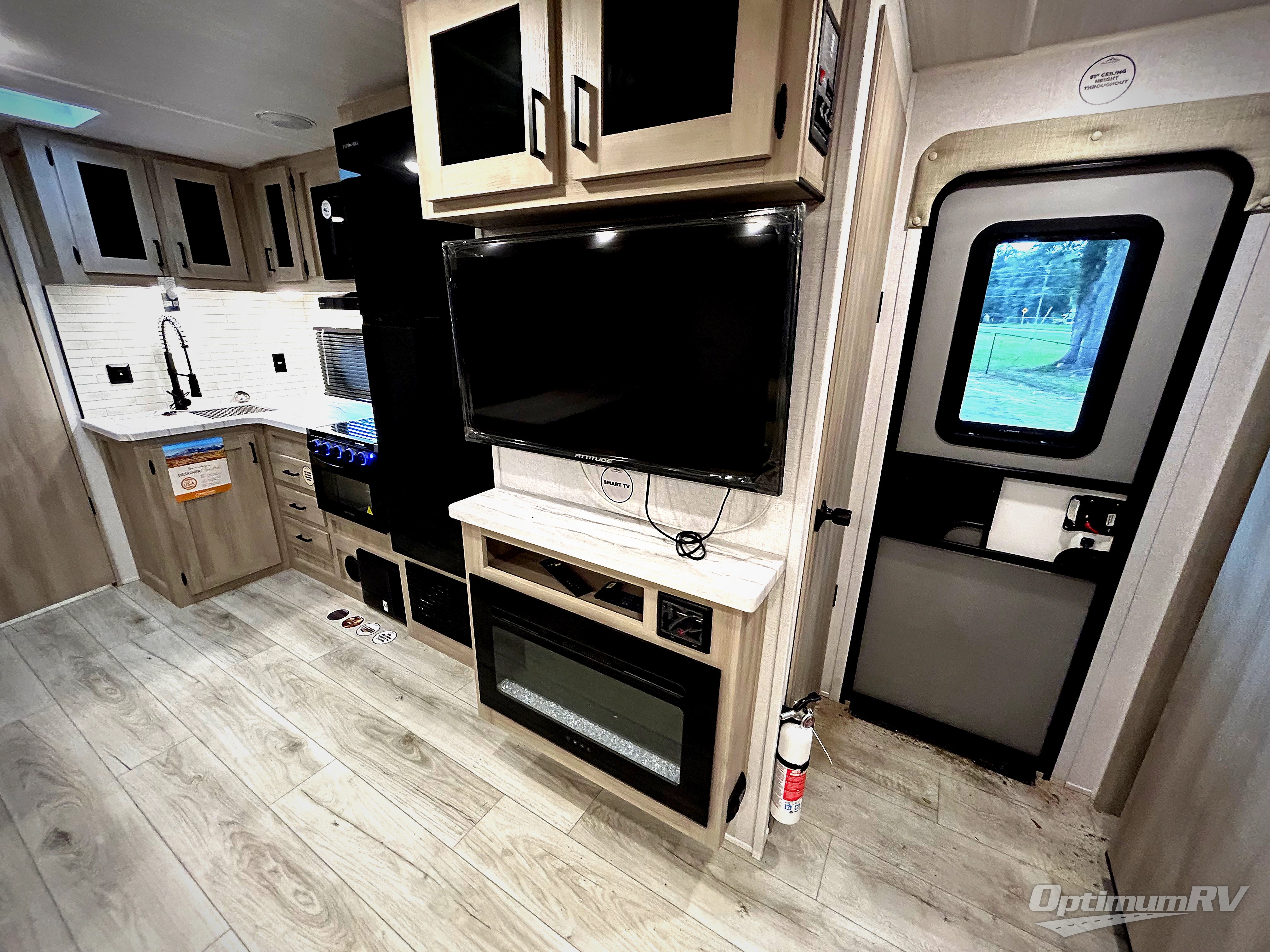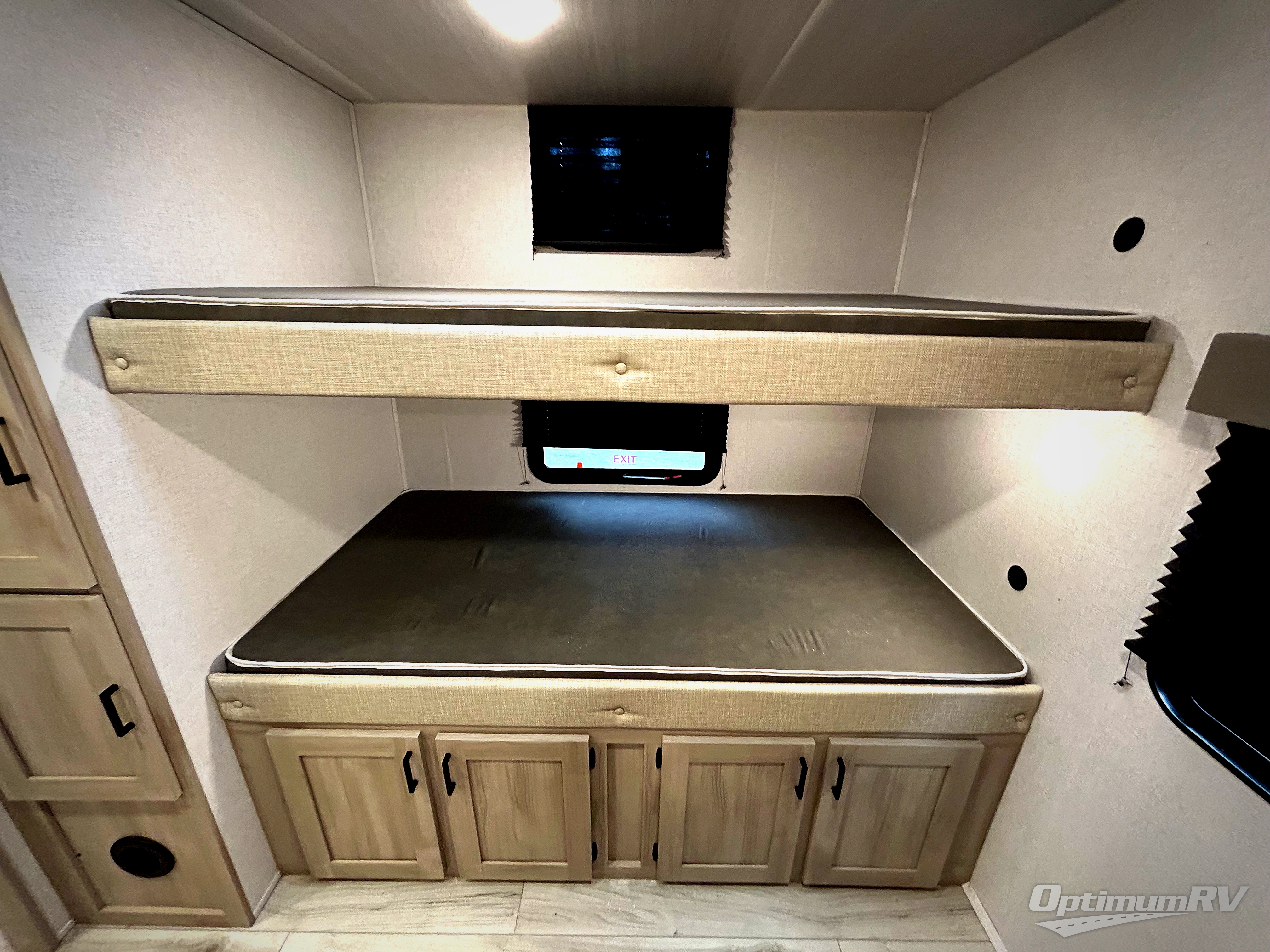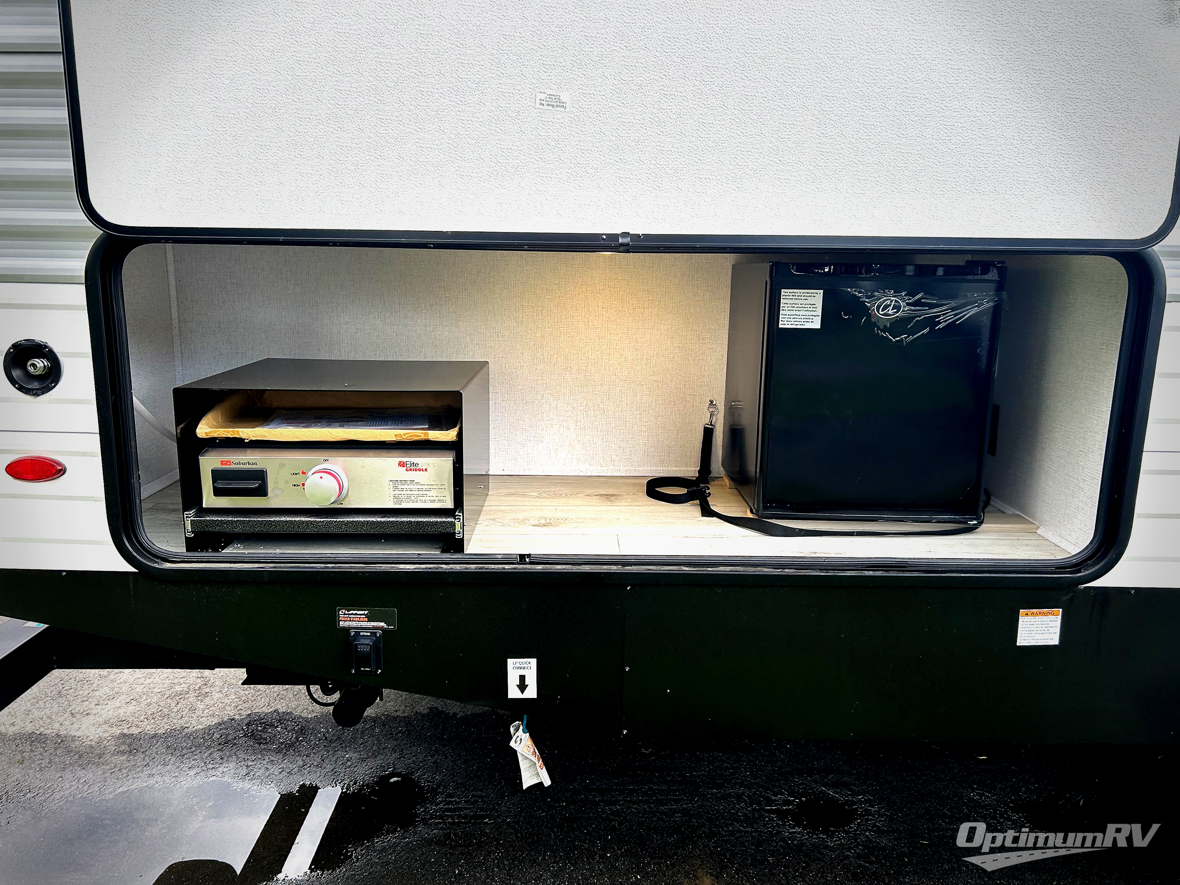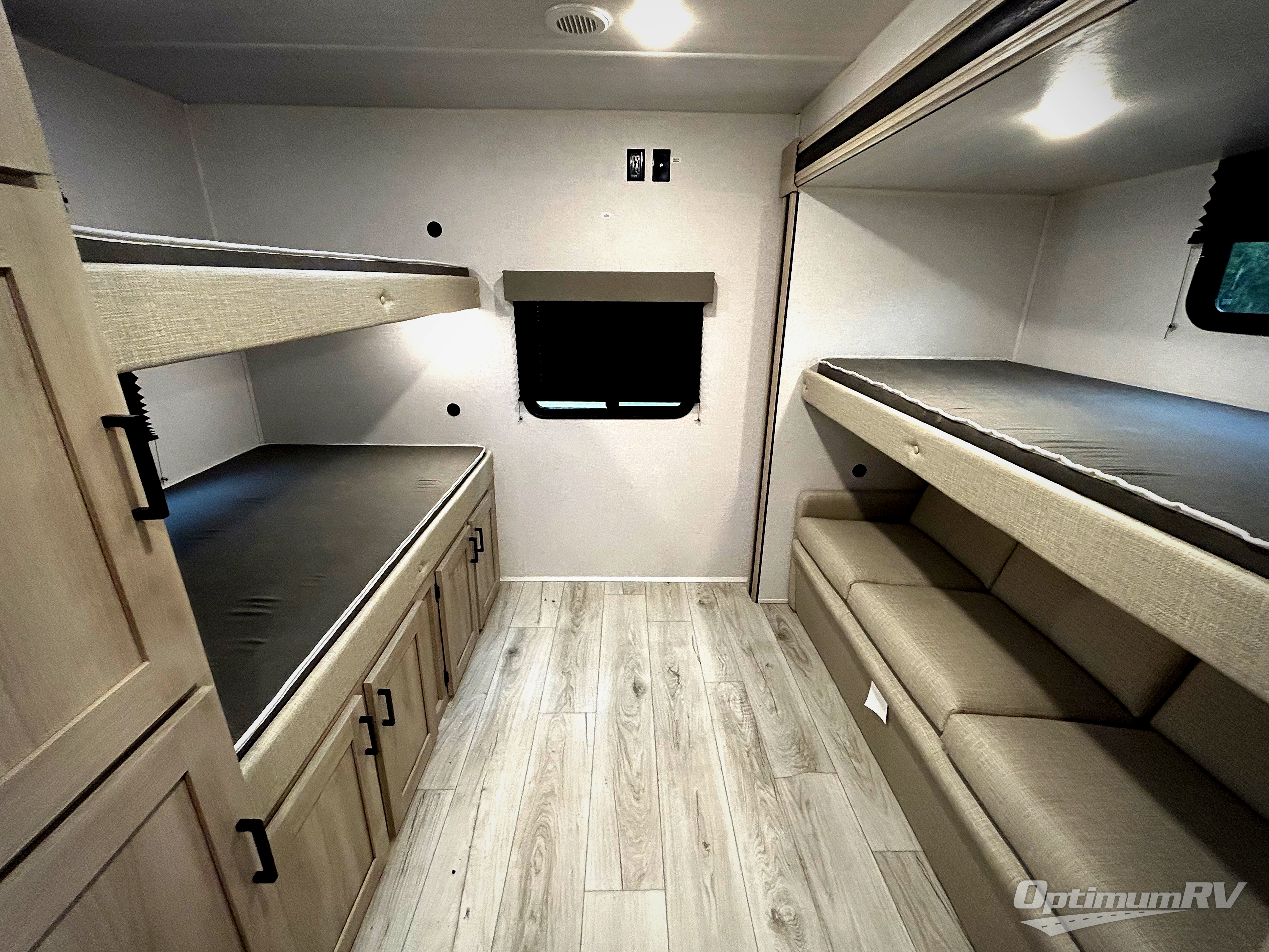 Head to the RV park for a long-weekend or week-long break from your everyday routine with this trailer at your favorite campsite. After setting up the two slide outs and the 15' power awning, you can relax inside on the jack knife sofa, dine at the oversized booth dinette or whip up a meal in the L-shaped kitchen. Everyone will enjoy the fireplace no matter what you are doing. The walk-through bathroom is super convenient, and the front bedroom allows you to live like royalty in privacy. The rear bunkhouse also offers privacy and includes three bunk beds and a sofa, plus storage. Your kids or guests will love having their own room. And the exterior offers an optional outdoor kitchen, an oversized pass-through storage for your larger gear like fishing poles, outdoor tables and bags of charcoal, plus there are two spray ports to easily rinse off dirty bikes, shoes and such.