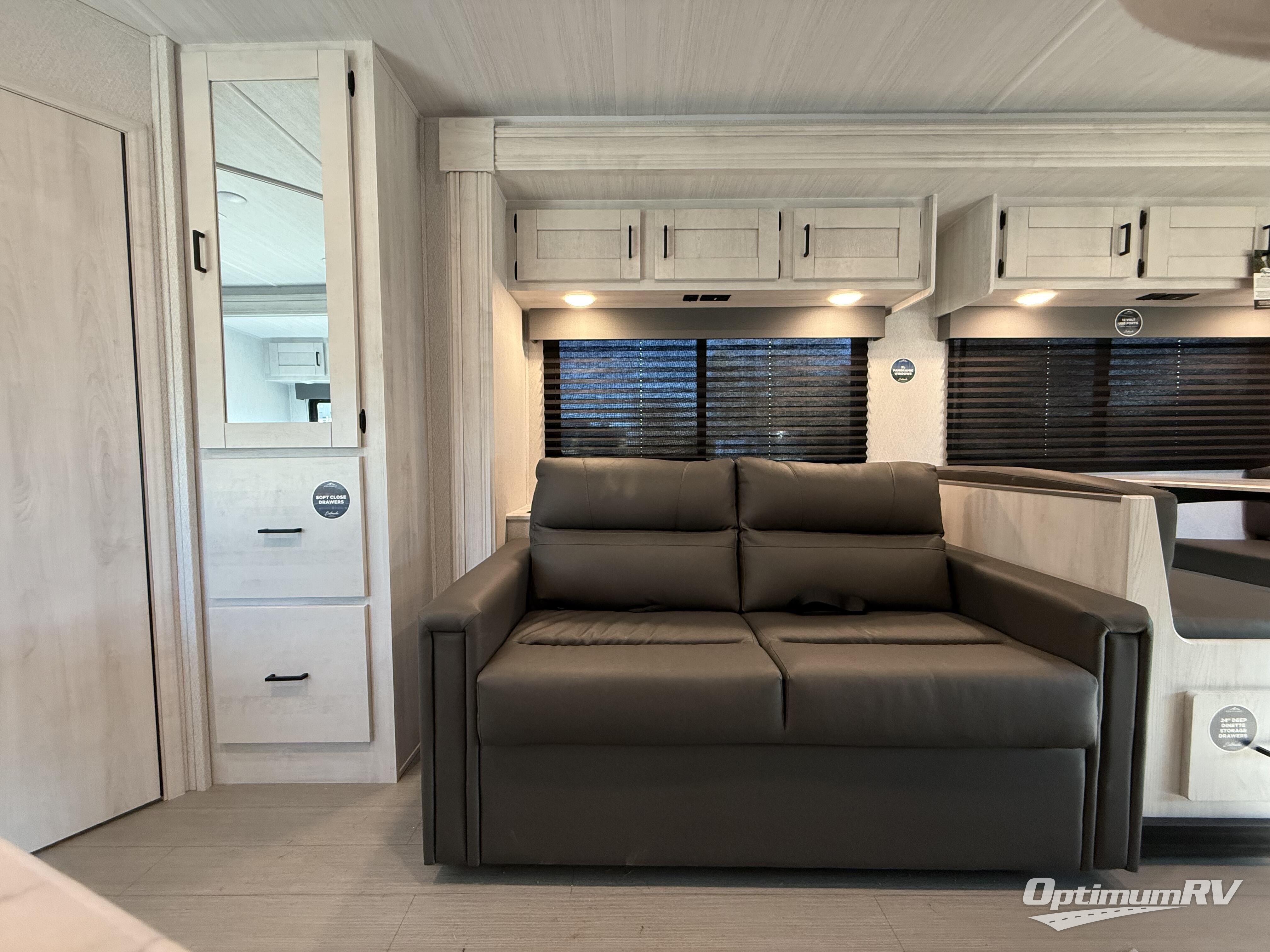 You can explore and discover so many new destinations with this Entrada Class C gas motorhome! The first thing that you'll notice about this coach is that it has extra interior living space because of the two slides. One of those slides holds the queen-size bed back in the private bedroom, and the bedroom is sectioned off from the rest of the coach with an accordion door. The full bathroom is right next to the bedroom so that you can quickly and effortlessly hop in the shower each morning. Outside of the bathroom, you'll find a linen closet which can hold your towels or toiletries, and the kitchen pantry can hold your snacks. This coach even has an LED TV for inside entertainment, so you can sit back on the sofa or booth dinette and watch with pleasure.