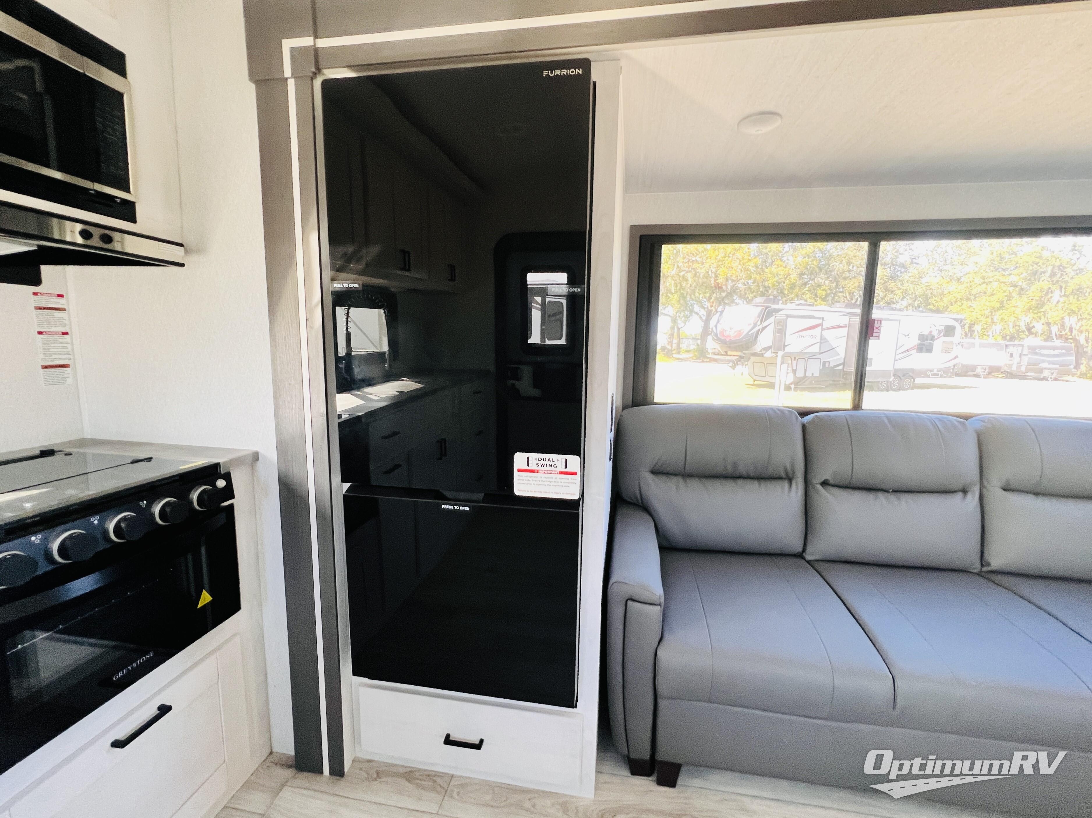 This fifth wheel is perfect for a couple who wishes to escape the hustle and bustle of everyday life! The front private bedroom has a king bed with storage underneath to store extra blankets and a TV prep area for extra entertainment. Freshen up each morning in the full bathroom with the 30" x 36" shower with a skylight for added natural lighting. The rear kitchen has everything you need to prepare your best home cooked meals and a 10 cu. ft. refrigerator to keep your perishables fresh. The booth dinette offers a comfortable place to enjoy your meals, play games, and even transform into an extra sleeping space. Across from the 78" theater seating is a 50" TV at the entertainment center above the dinette. You also have a shoe storage area and overhead cabinets throughout to keep your items out of the way!