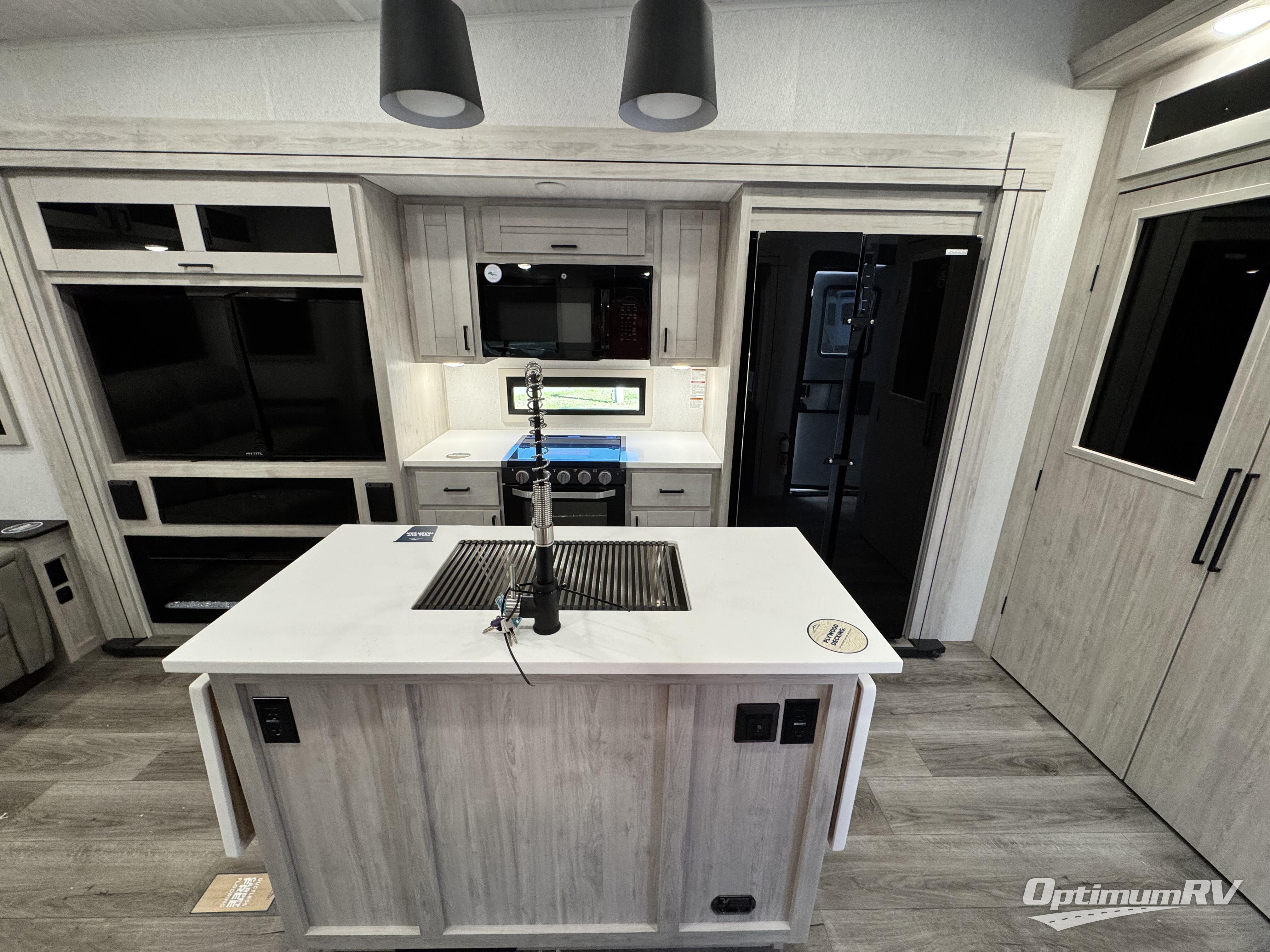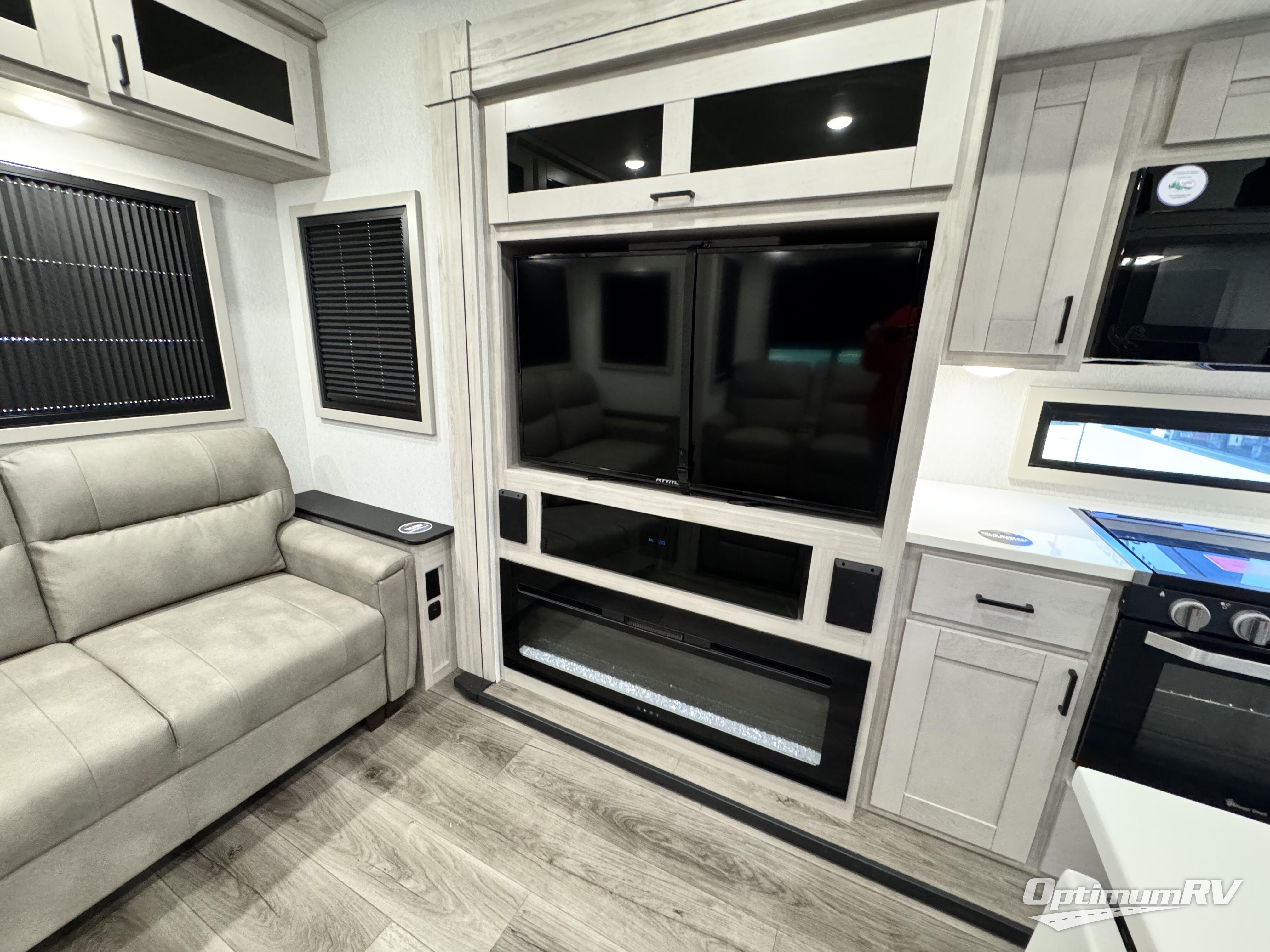 Take this Tandara fifth wheel out to the campsite and experience luxury while you camp! You will have a front private bedroom that is quite impressive with its full-width wardrobe, king bed slide with bedside shelves, under-bed storage, and a dresser with a TV prep area. The kitchen island is easy to gather around while you're cooking dinner or enjoying a late-night snack, and the hide-a-bed sofa will be comfortable for lounging or sleeping. As you spend time outside under the two electric awnings, you can grab some extra charcoal or camping chairs from the oversized pass-through storage.