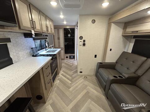 Camping trips just got sweeter in this single slide out travel trailer that will sleep two each night! There is a front queen bed with dual wardrobes and nightstands to keep your things tidy, plus a privacy curtain at the foot of the bed if you have someone staying over on an air mattress. You can relax on the theater seating slide out that also includes a wardrobe/pantry here for snacks or paper products. The kitchen with a dual burner cooktop and air fryer convection microwave will let you make meals each day, and the 10 cu. ft. 12V refrigerator will be perfect for your perishables. This unit also includes a breakfast bar/desktop area with two bar stools where you can dine or work from home. And of course there is a full bath on board so you can clean up after a day outdoors!