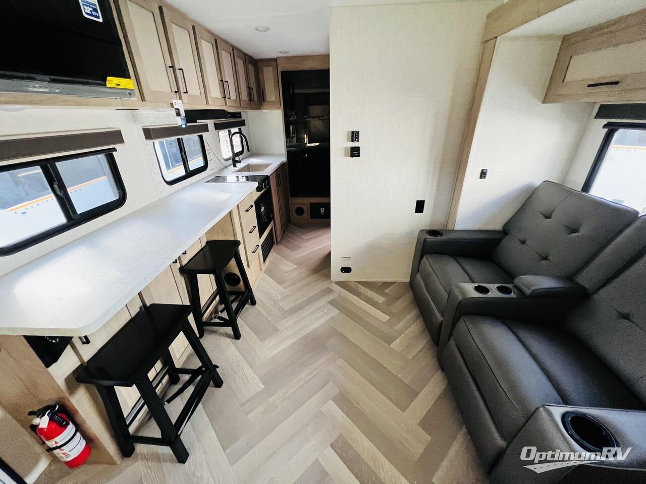 Camping trips just got sweeter in this single slide out travel trailer that will sleep two each night! There is a front queen bed with dual wardrobes and nightstands to keep your things tidy, plus a privacy curtain at the foot of the bed if you have someone staying over on an air mattress. You can relax on the theater seating slide out that also includes a wardrobe/pantry here for snacks or paper products. The kitchen with a dual burner cooktop and air fryer convection microwave will let you make meals each day, and the 10 cu. ft. 12V refrigerator will be perfect for your perishables. This unit also includes a breakfast bar/desktop area with two bar stools where you can dine or work from home. And of course there is a full bath on board so you can clean up after a day outdoors!