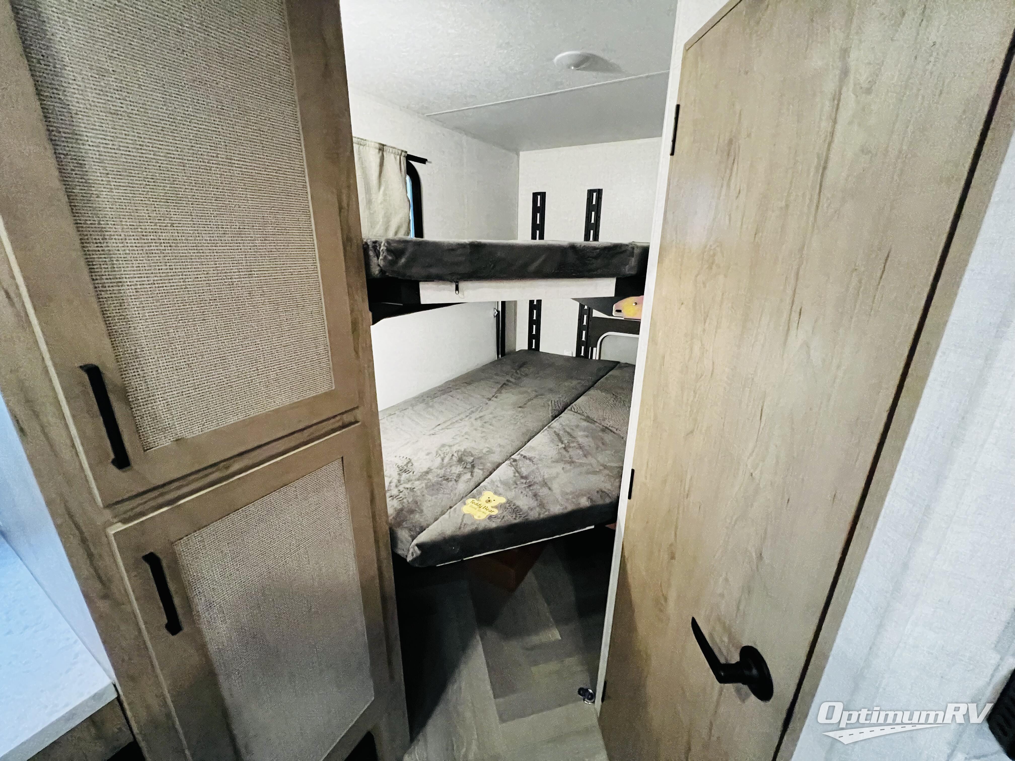 You'll love every minute spent in this spacious travel trailer that can sleep up to six. The patent-pending repositionable EmberTrack E-Track bunk/storage system includes 74" x 45" cargo space, and there are multiple single/double bunk configurations to fit your needs. The front walk-around true residential queen bed includes dual nightstands and dual wardrobes, plus a privacy curtain if you have guests staying over. This E-Series kitchen includes an air fryer convection microwave, a two burner cooktop, plus a breakfast bar with bar stools so you can visit with the chef as they cook meals. A legless dinette or optional theater seating will provide a place to dine, or you can take your plate outdoors to sit under the 14' power awning with a dimmable LED light. You'll also find a pass-through storage outside, along with a docking station and a kayak/bike storage door!