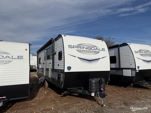 Camping trips just got a whole lot better in this tandem axle, single slide travel trailer! Once you arrive at the campground, you can put out the 18' power awning, grab your camp chairs from the pass-through storage, and relax! When you're getting hungry, head to the rear corner kitchen that includes ample counter space, a two burner cooktop, plus a 10 cu. ft. 12V refrigerator. There is also a pantry to store snacks and paper goods! You can get cozy after dinner on the theater seating that sits directly across from the HDTV for easy viewing, and there is a legless dinette if game night is in order. When you're ready for bed, the queen bed up front will provide a great night's rest, and there is a privacy curtain if you have a guest staying over on the dinette. And don't worry about storage space; this model has you covered with dual bedroom wardrobes, overhead cabinets, and convenient shoe storage!