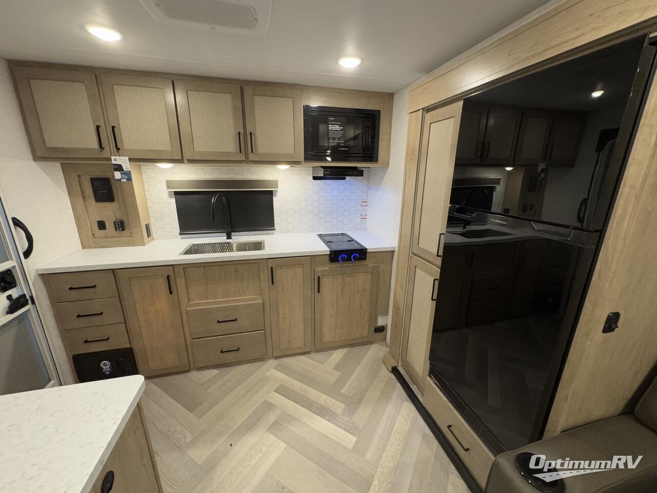 Are you looking for a travel trailer with plenty of interior space and lots of conveniences? Look no further than this E-Series unit! You can sleep three to four comfortably between the true residential queen bed in the front bedroom and the legless dinette, plus there is a walk-through bath that everyone can access easily. You'll also find the second entry door located in the master bedroom, along with dual nightstands and dual wardrobes to keep clothes wrinkle-free. After a day outdoors, you will love relaxing on the theater seating that is directly across from the HDTV to make it a movie night, and the legless dinette provides a place to dine, play games, and let a guest or two sleep over. And we haven't even mention the rear kitchen with tons of counter space, an air fryer convection microwave, a two burner cooktop, and a 10 cu. ft. 12V refrigerator!