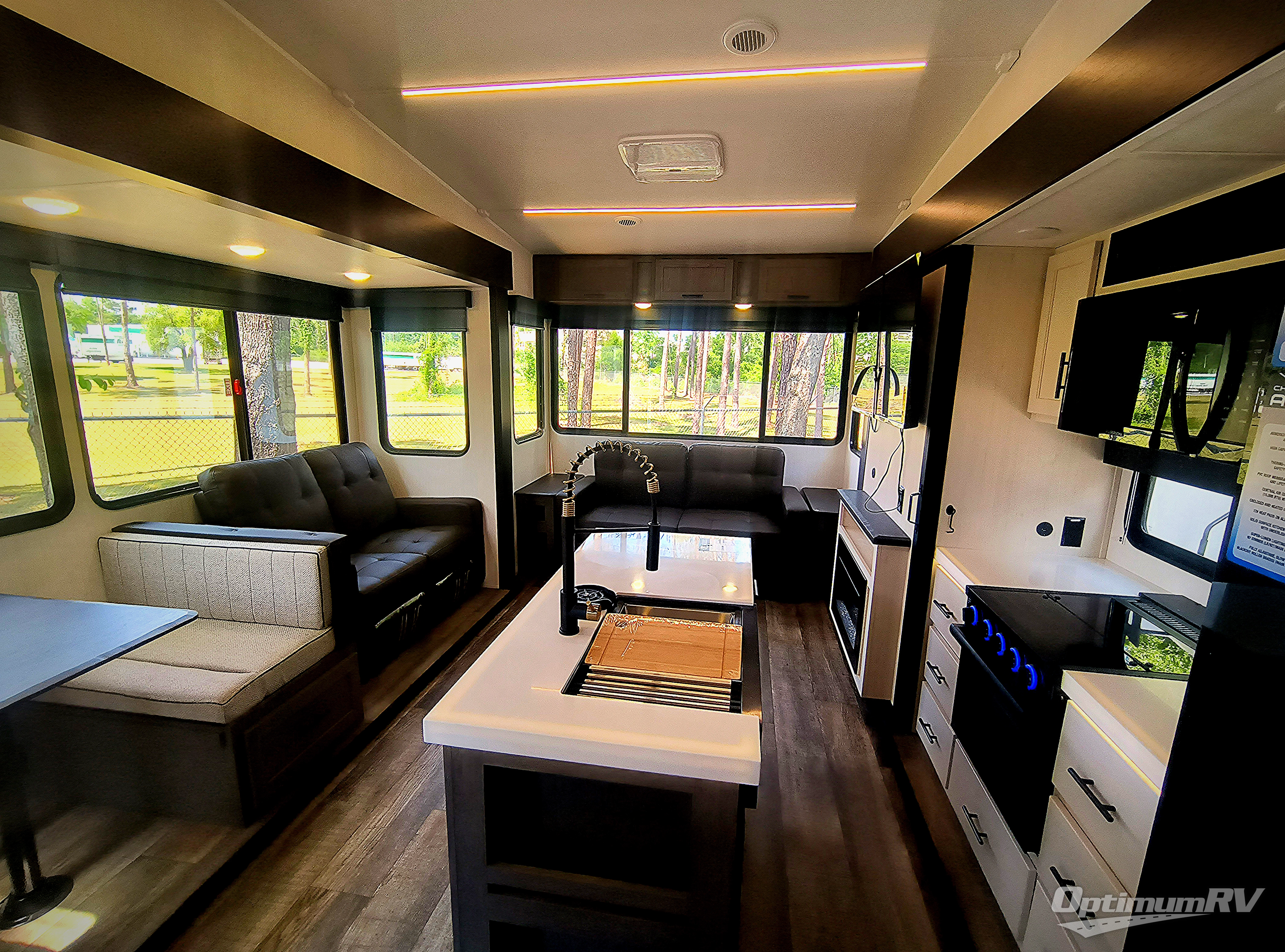 You have excellent sleeping accommodations on this Cherokee Arctic Wolf Suite fifth wheel! There is a private bedroom with a king-size bed at the front for you, and the second bedroom contains two 28" x 72" bunks and a jack knife sofa with trundle for any kids or friends you have traveling with you. A desk provides space to work or study. And it doesn't stop there. There is also a tri-fold sofa in the living area that you can use as a sleeping space. The kitchen is ready for you to make meals on the three-burner range, and you have plenty of work space with a pull-out countertop extension. You can enjoy your meals at the dinette, and after dinner relax on the theater seats across from the fireplace.